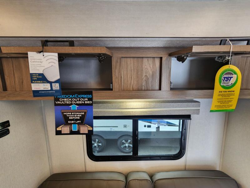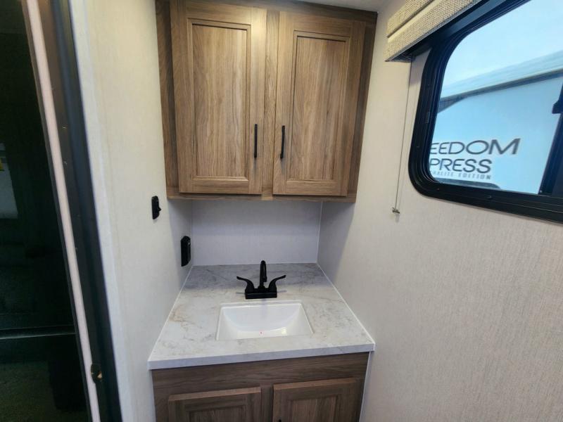 With any Freedom Express Select travel trailer by Coachmen you will find an alumicage construction and vacuum bonded walls with Azdel composite for a trailer made to last. These Select value models come standard with a Bluetooth interior speaker, night shades, and wear-resistant vinyl flooring throughout. You will appreciate the power tongue jack, as well as the Tufflex PVC roof and heated and enclosed underbelly to extend your camping season. A 15K BTU roof A/C will keep you comfortable, and the tankless water heater will provide endless hot showers!