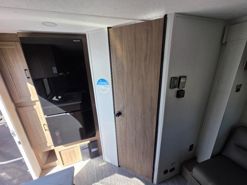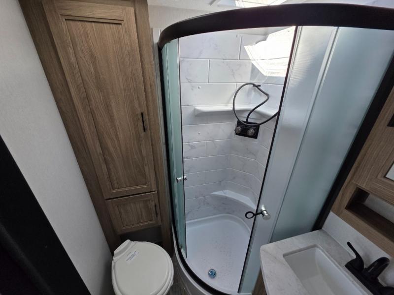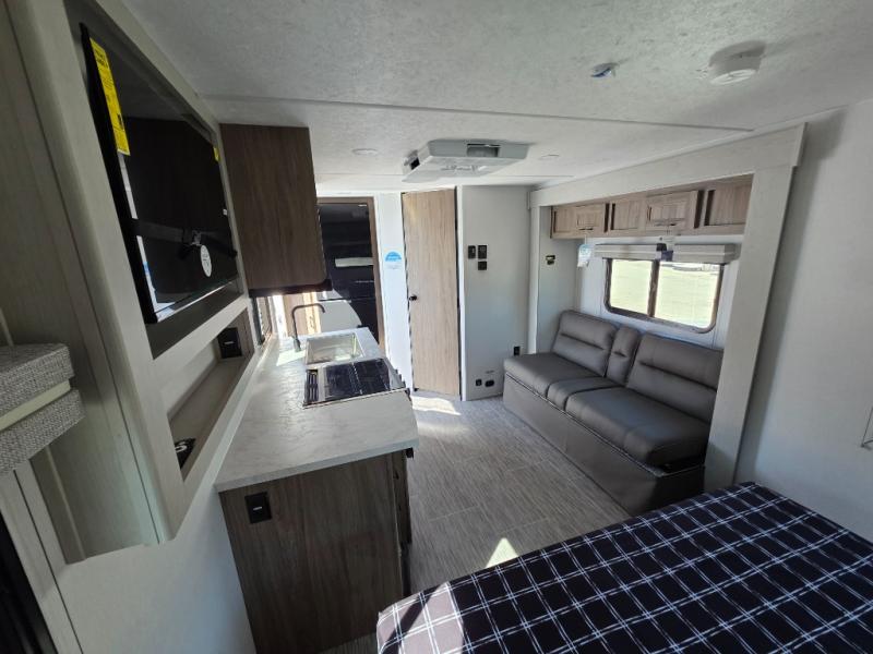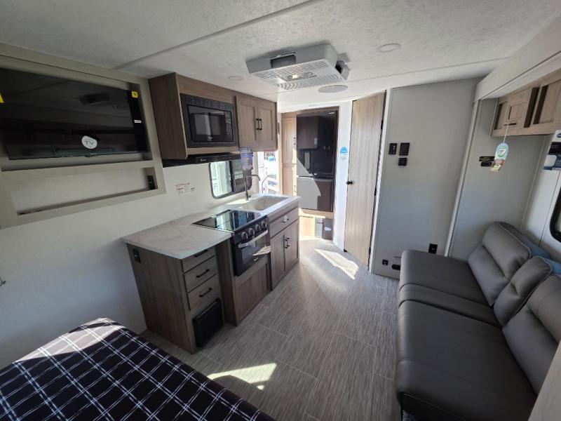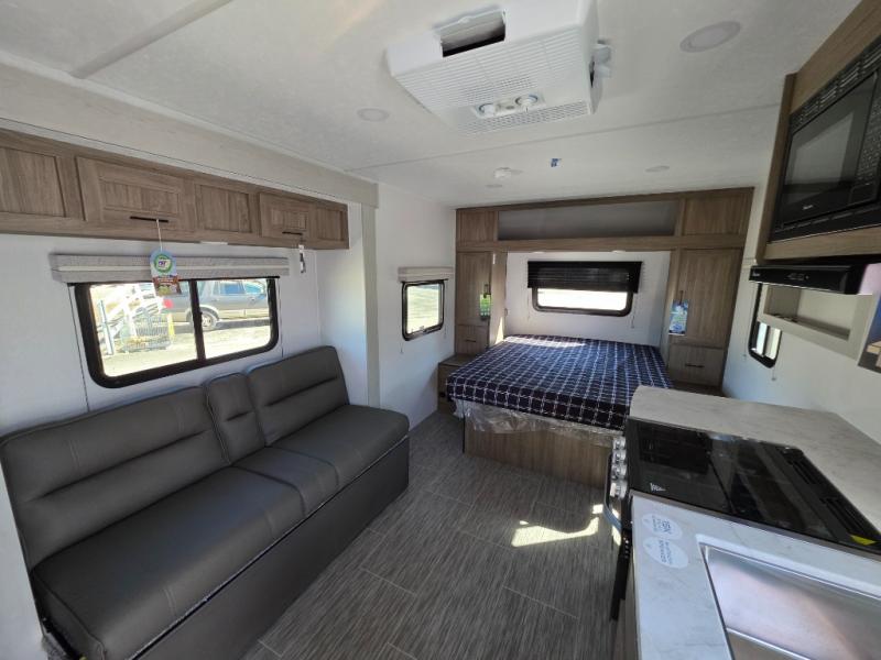 You'll love spending time at the campground in this single slide out travel trailer! The 60" x 80" front queen bed includes vaulted underbed storage to keep your luggage or extra blankets out of the way, plus there are dual bedside wardrobes for your clothes. A sofa with a free-standing table will provide a place to relax and dine, and the full kitchen includes a dual-burner cooktop and microwave oven to cook meals each day. This unit also features a rear corner bath with a 32" radius shower, a toilet, sink, and bath linen closet for clean towels!