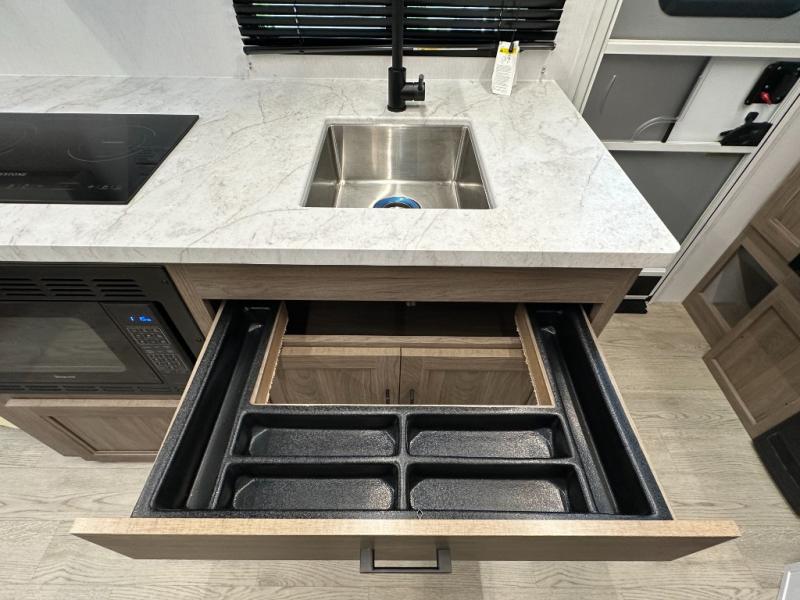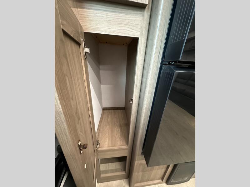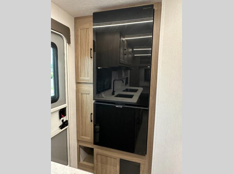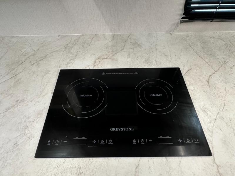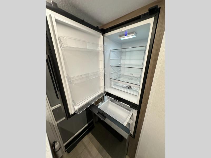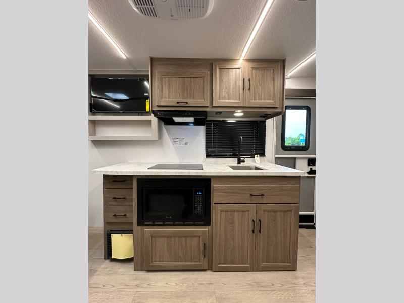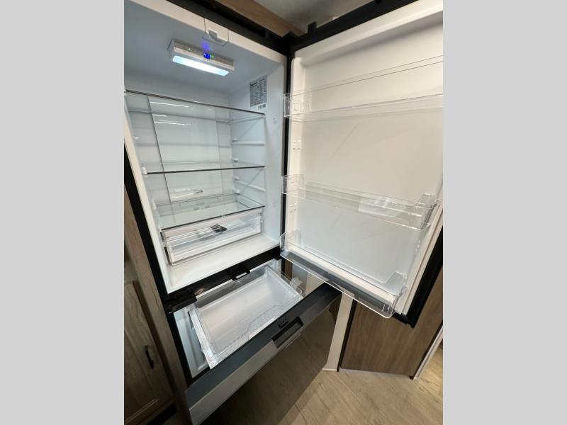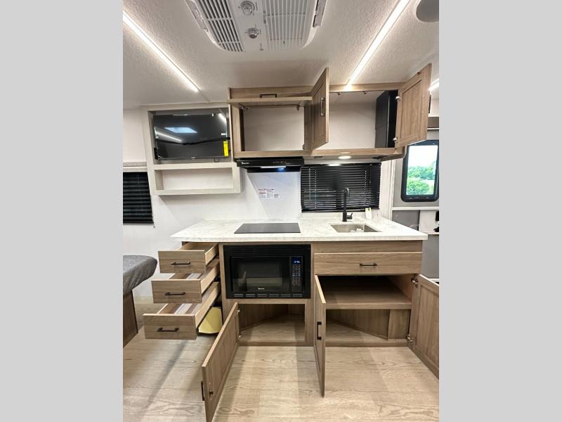 Kitchen: Dual-burner cooktop, microwave, 10 cu ft double-door 12V refrigerator. Pass-through storage outside.