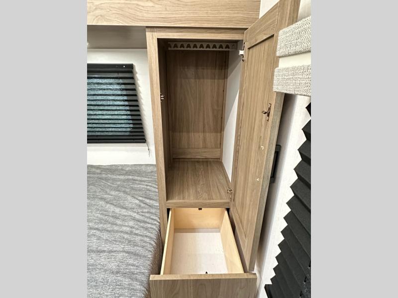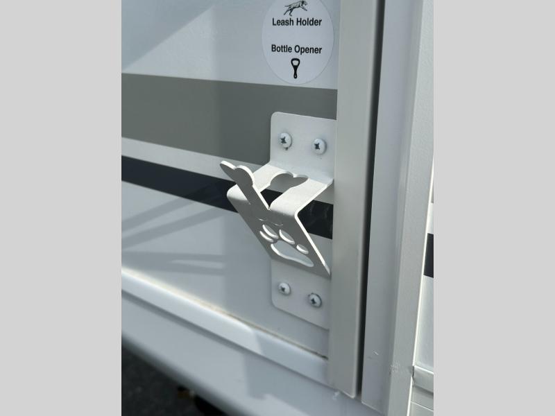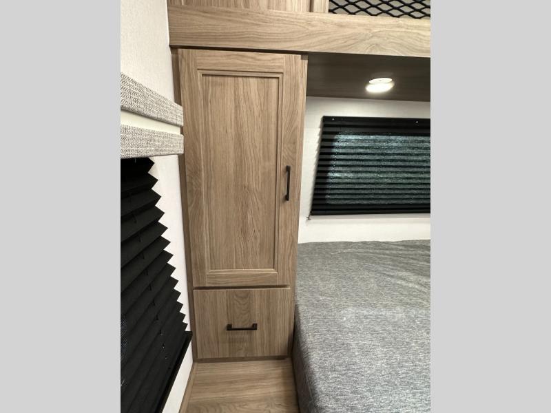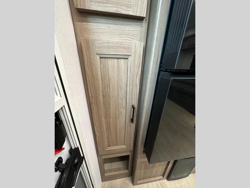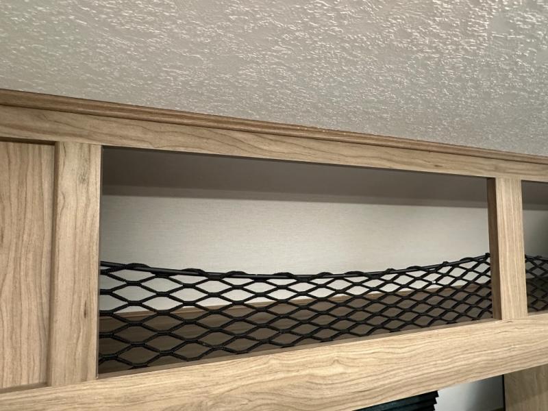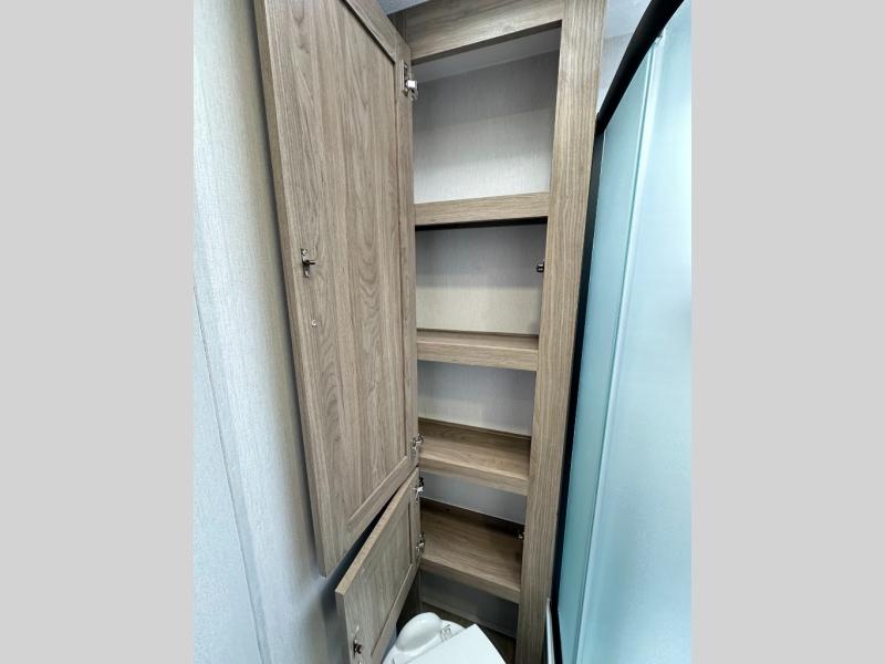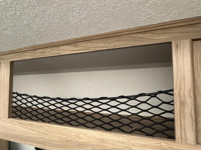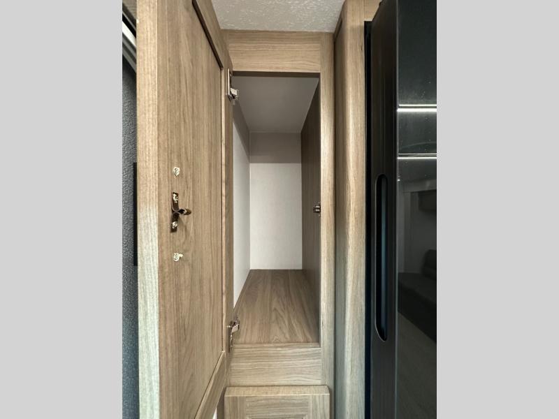 Kitchen: Dual-burner cooktop, microwave, 10 cu ft double-door 12V refrigerator. Pass-through storage outside.