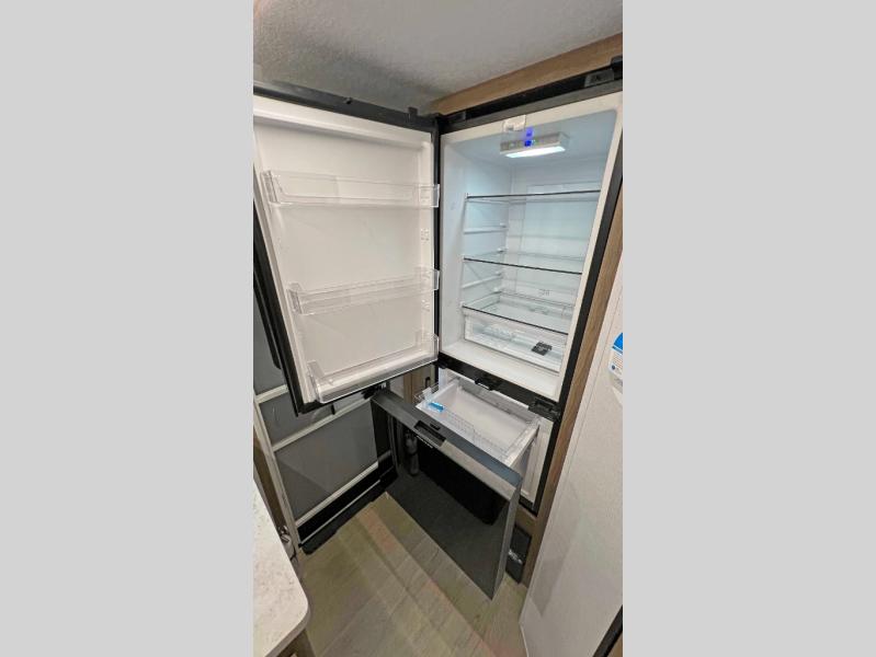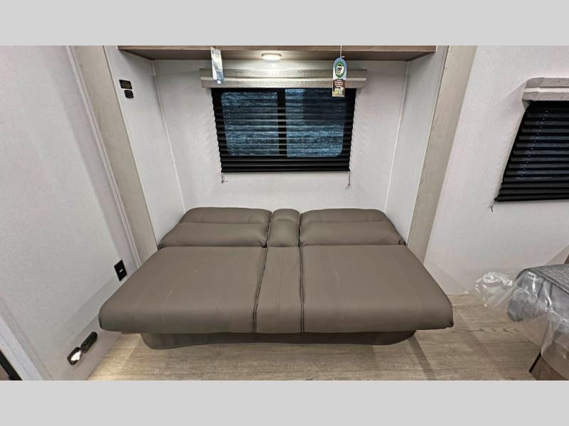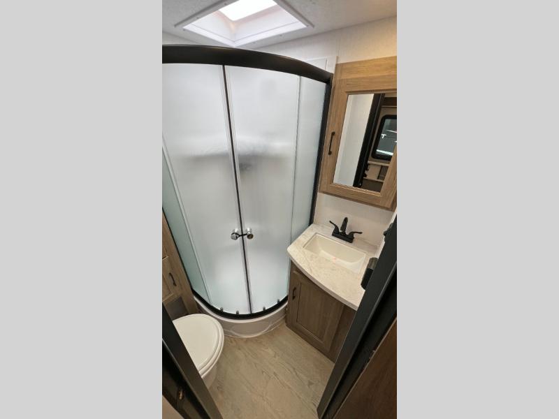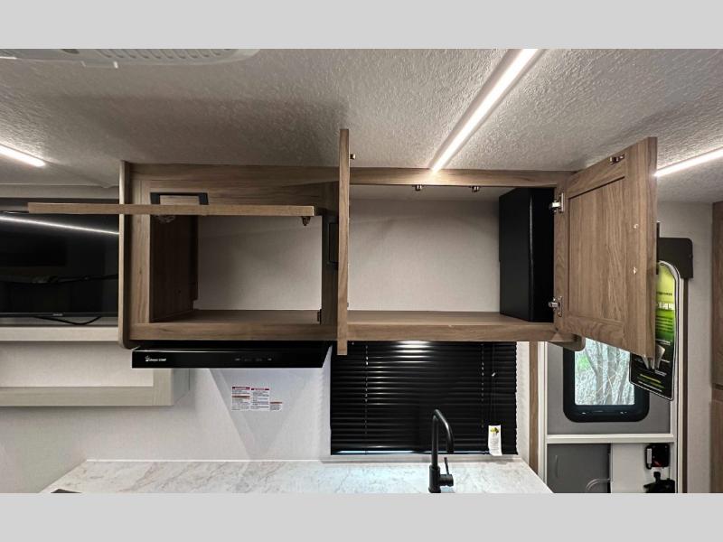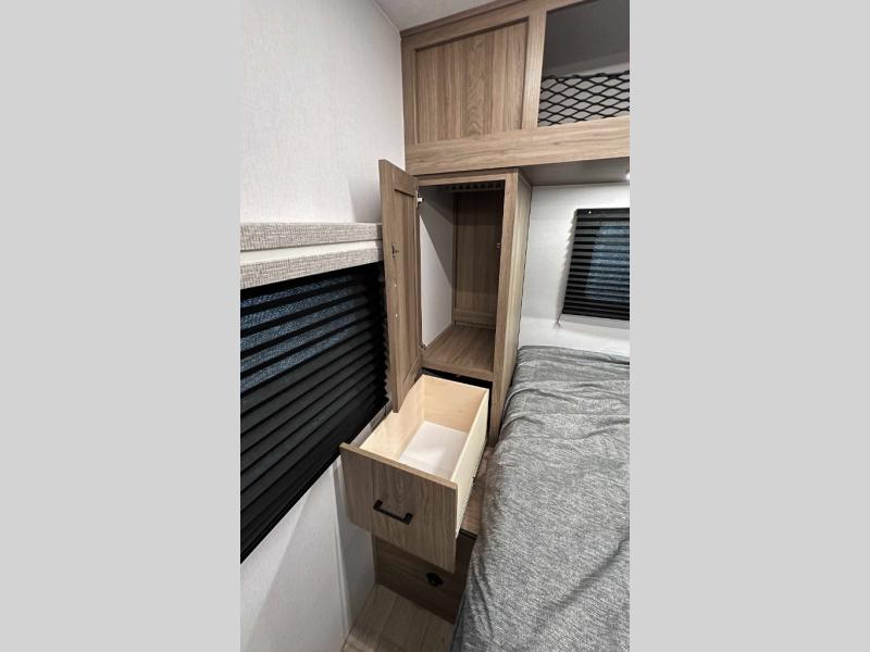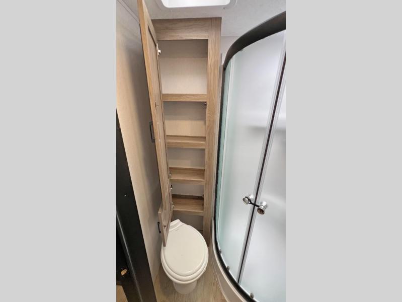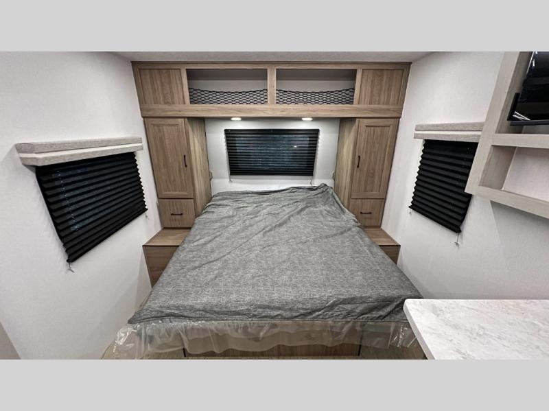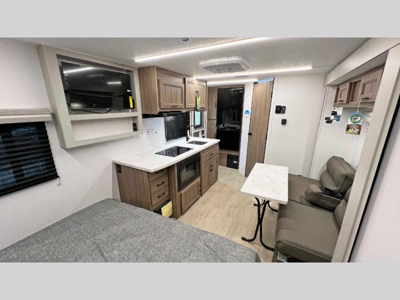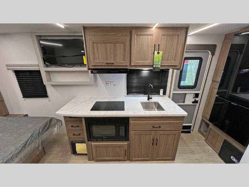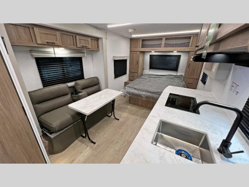 You'll love spending time at the campground in this single slide out travel trailer! The 60" x 80" front queen bed includes vaulted underbed storage to keep your luggage or extra blankets out of the way, plus there are dual bedside wardrobes for your clothes. A sofa with a free-standing table will provide a place to relax and dine, and the full kitchen includes a dual-burner cooktop and microwave oven to cook meals each day. This unit also features a rear corner bath with a 32" radius shower, a toilet, sink, and bath linen closet for clean towels!