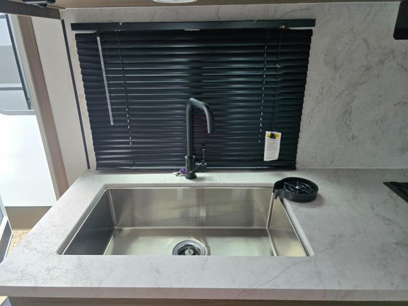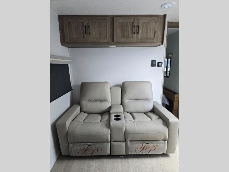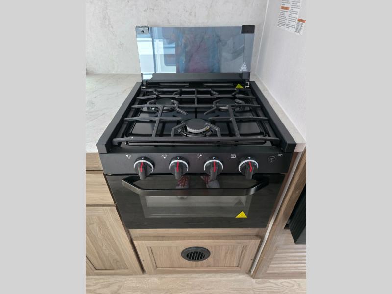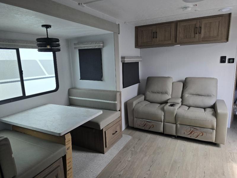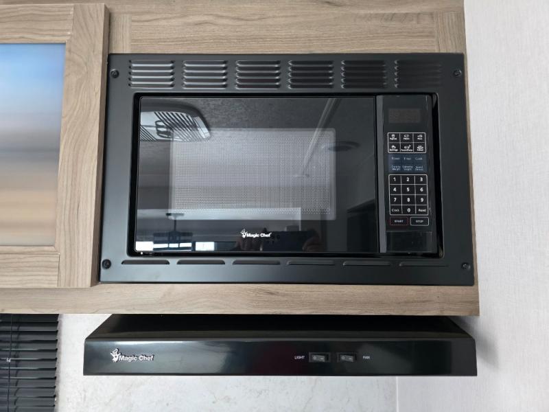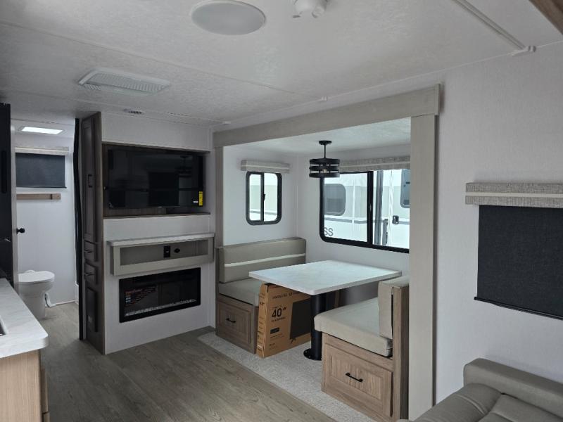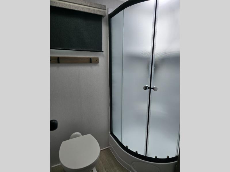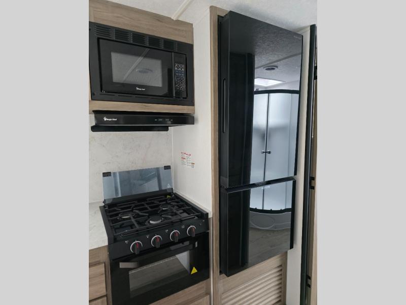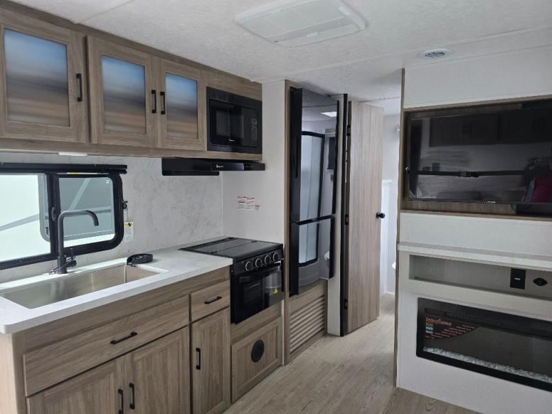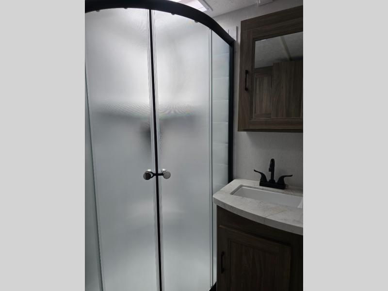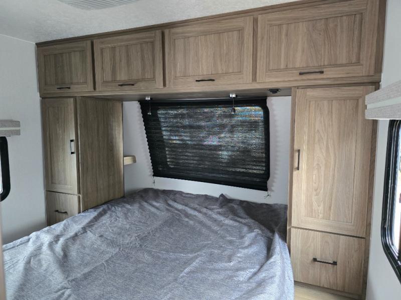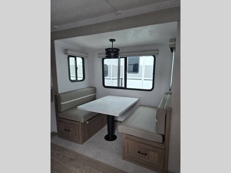 Camping with more friends and family is possible in this bunkhouse travel trailer! There is a double-size top bunk plus a double-size lower flip-up bunk for comfy sleeping space and additional storage space. You'll find your own bed up front with underbed storage and dual wardrobes to keep clothes wrinkle-free. Since there is a booth dinette slide out, you'll have additional interior space plus a place to dine, play games, and even let an extra guest sleep over. The full kitchen includes a dual burner cooktop and microwave oven to cook meals each day, along with a pantry and 12V refrigerator for food storage. And a full bath on board means you won't have to use the camp's facilities to freshen up each day; how convenient!