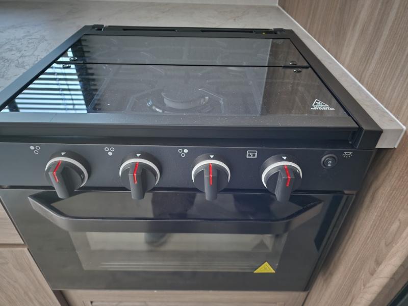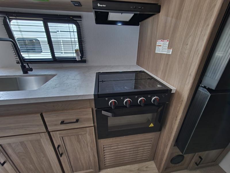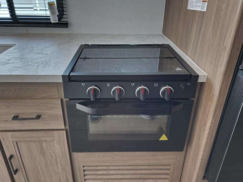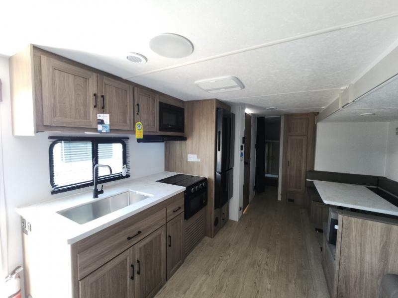 - Kitchen: Center kitchen with a 3-burner stove, oven, mid-size refrigerator, and a microwave. Perfect for preparing meals on the go.
