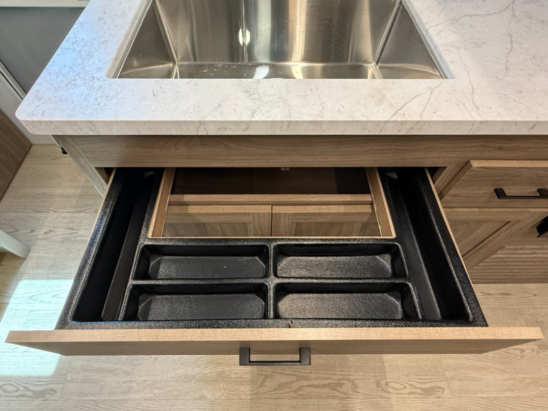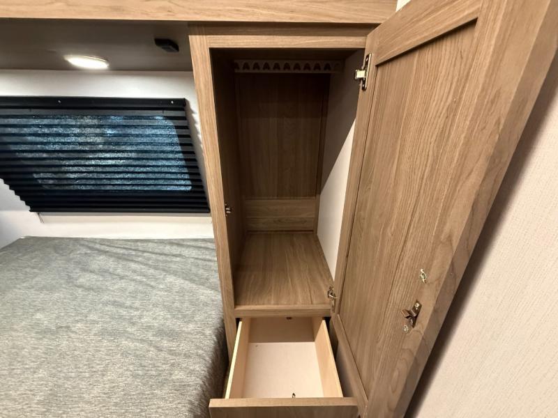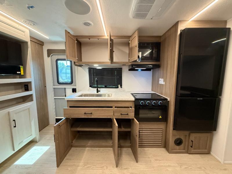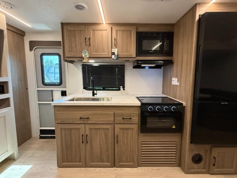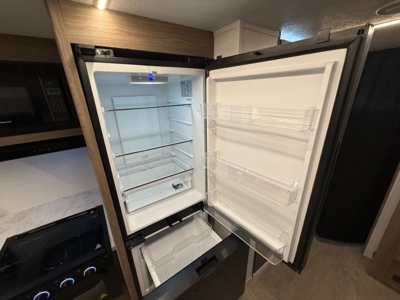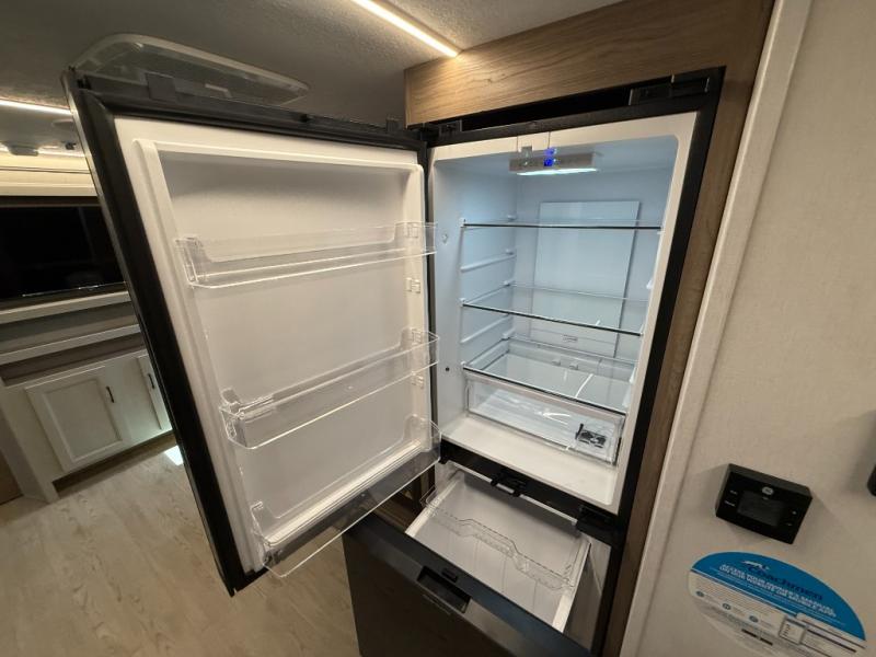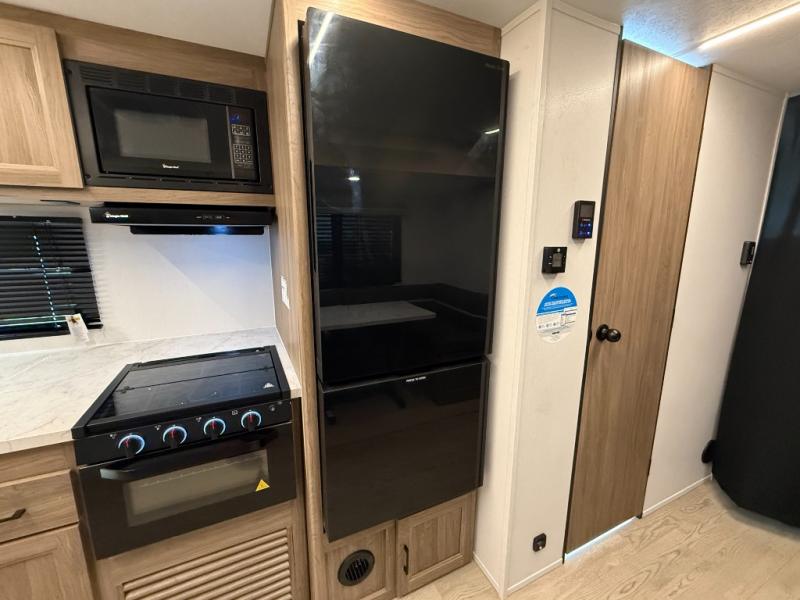 Kitchen: Double-door 12V refrigerator, microwave, cooktop (2 burners in some listings, though one spec shows 3 in another dealer’s listing)