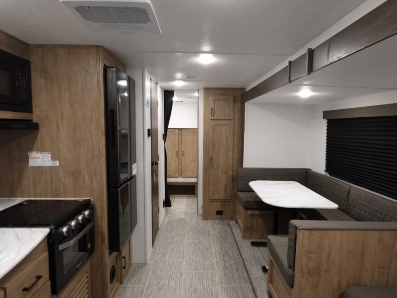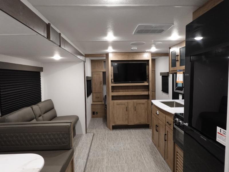 Whole-family fun is waiting for you in this spacious travel trailer. The kids or your guests will love the private bunkhouse with four bunks, plus a wardrobe with a countertop to keep their things. You will enjoy the front private bedroom with a walk-around queen bed and dual wardrobes, and if you have any other guests, they can sleep on the sofa or U-shaped dinette within the large slide out. The kitchen includes everything needed to prepare meals each day, including a microwave oven, a dual-burner cooktop, and a double door refrigerator. This model also includes a pass-through storage, plus additional exterior storage to bring along hiking gear, fishing poles, and camp chairs!
