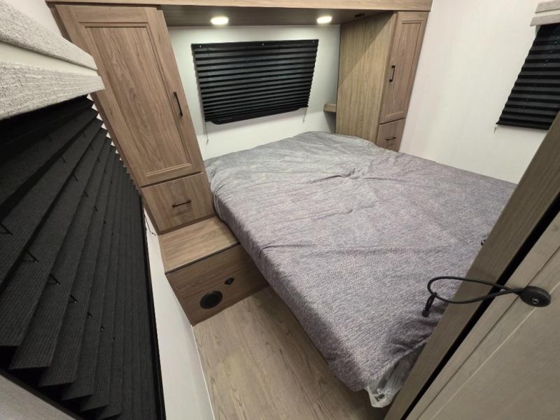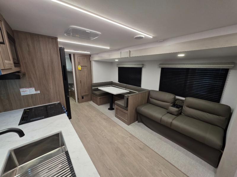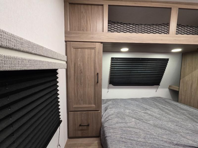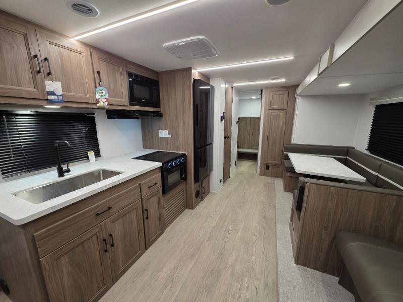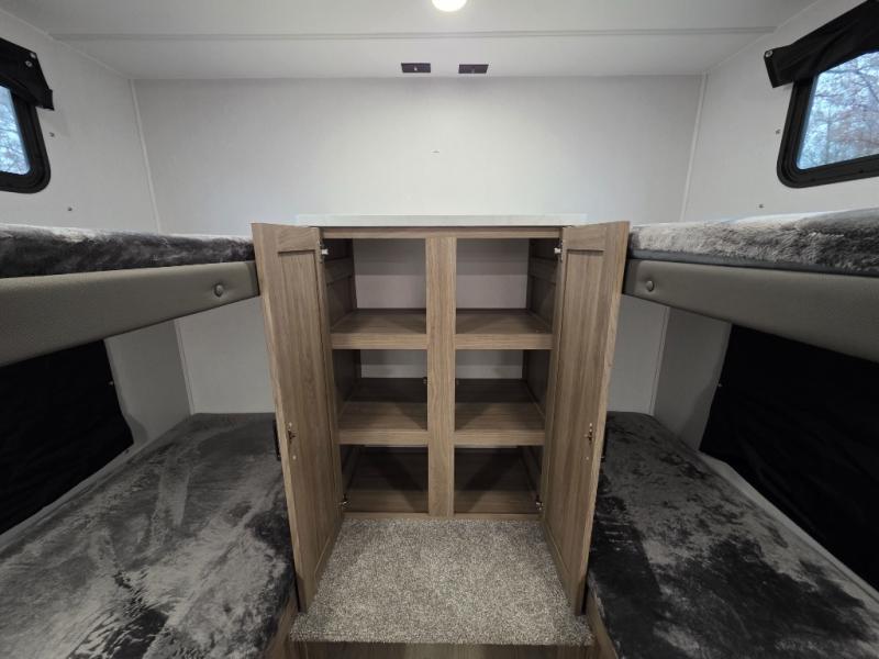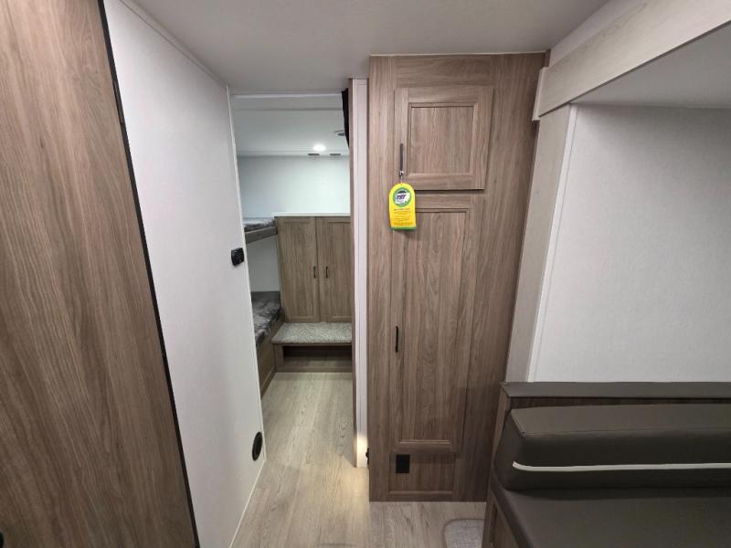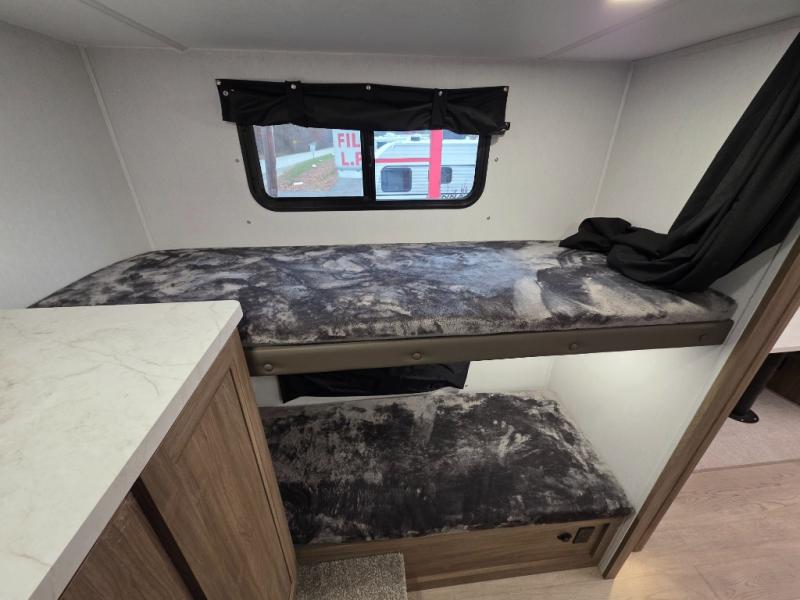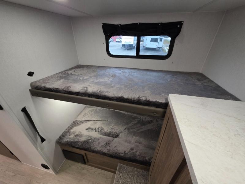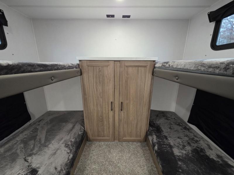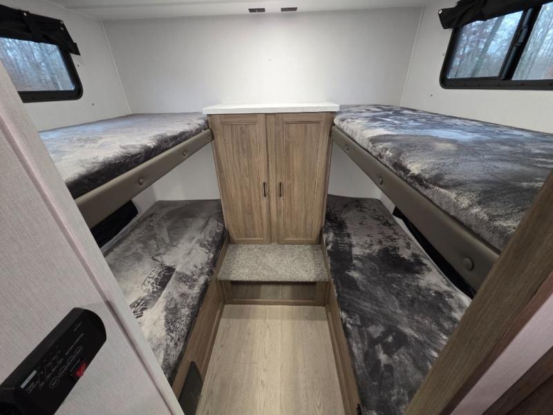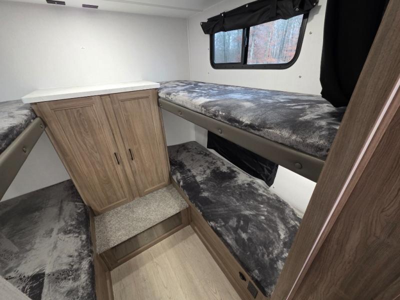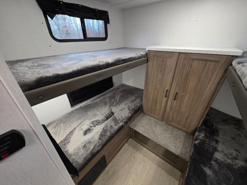 Whole-family fun is waiting for you in this spacious travel trailer. The kids or your guests will love the private bunkhouse with four bunks, plus a wardrobe with a countertop to keep their things. You will enjoy the front private bedroom with a walk-around queen bed and dual wardrobes, and if you have any other guests, they can sleep on the sofa or U-shaped dinette within the large slide out. The kitchen includes everything needed to prepare meals each day, including a microwave, a dual-burner cooktop, and a double door refrigerator. This model also includes a pass-through storage, plus additional exterior storage to bring along hiking gear, fishing poles, and camp chairs!