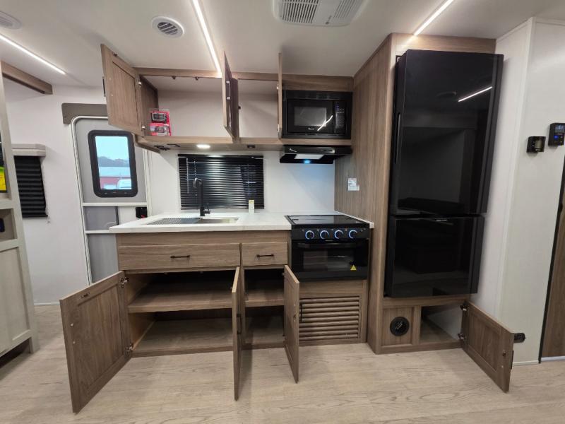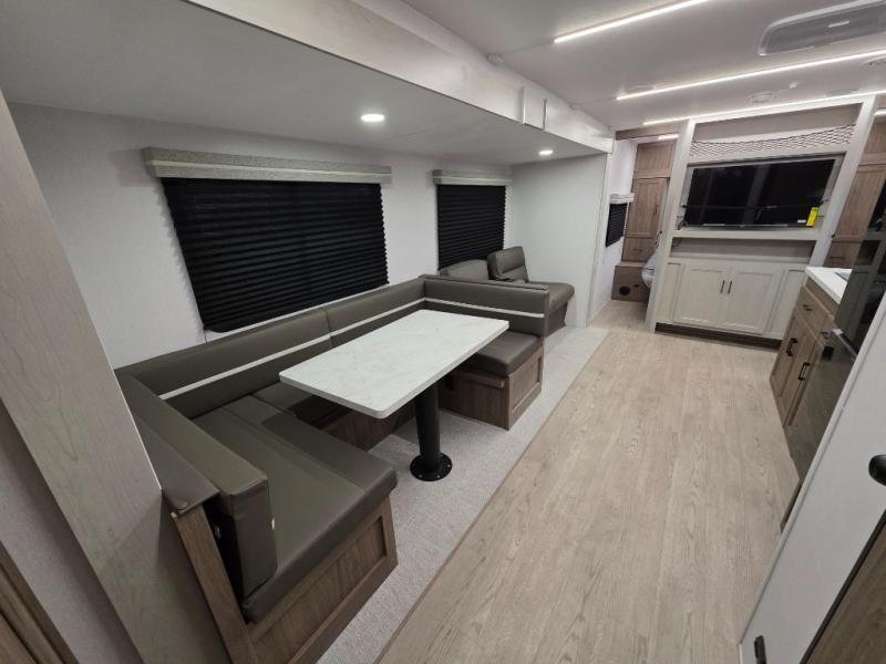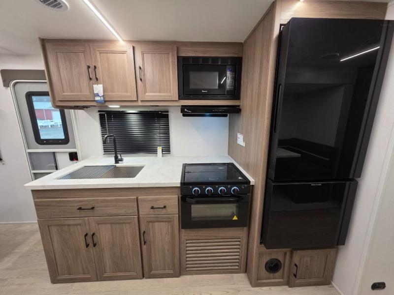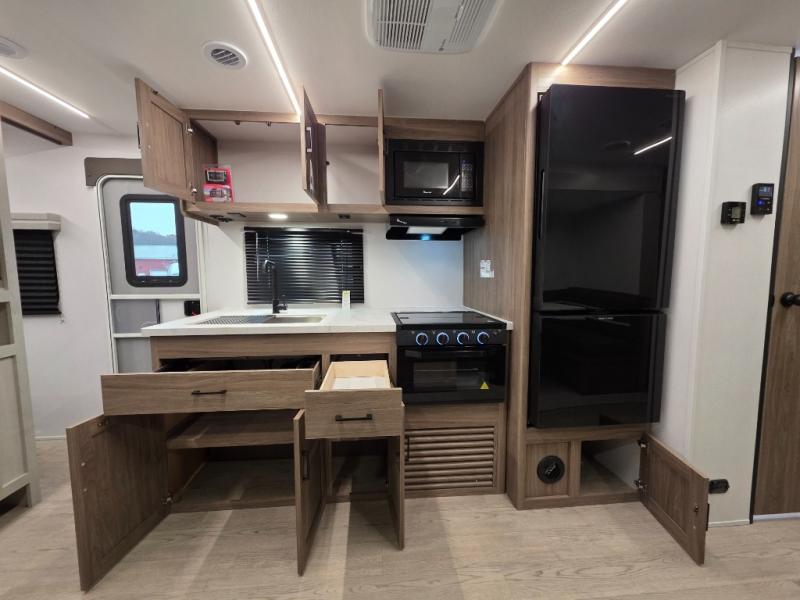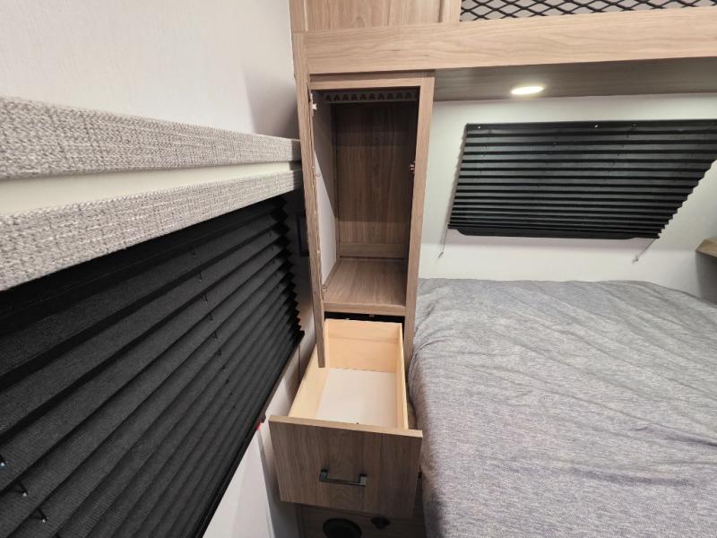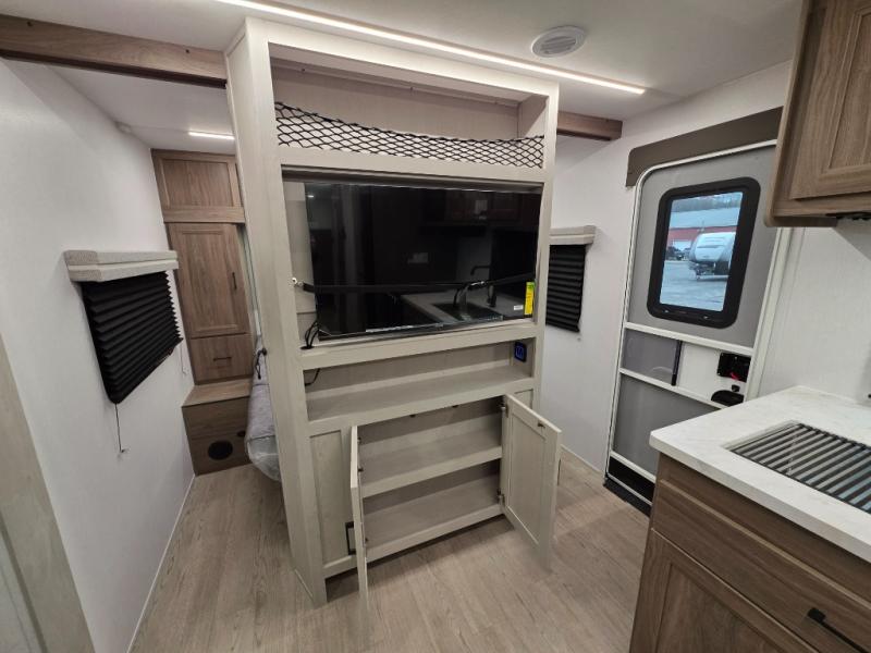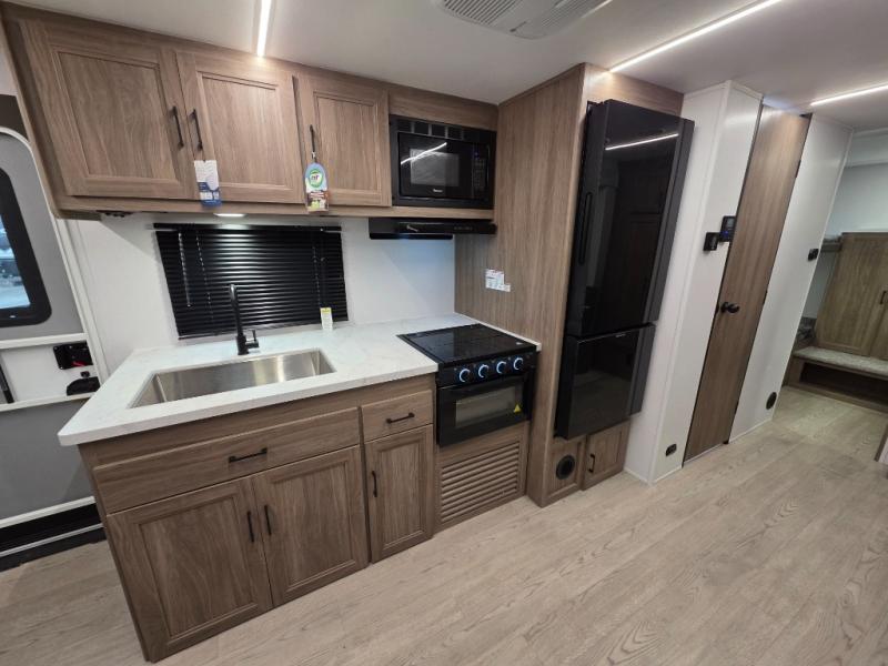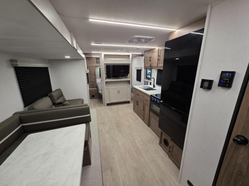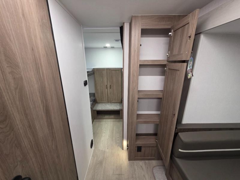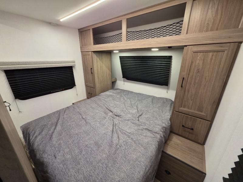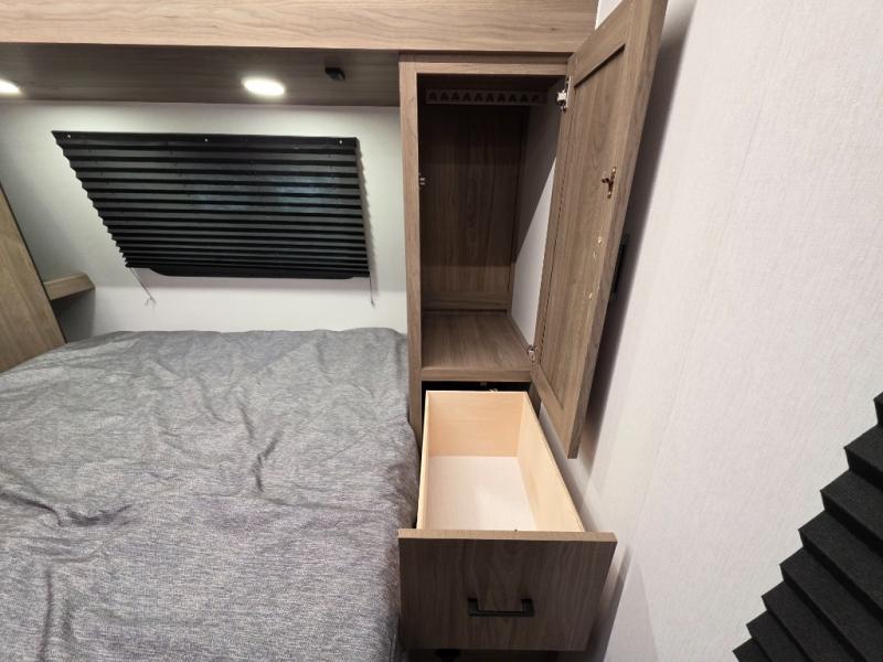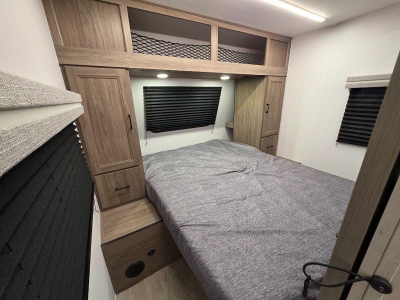 Whole-family fun is waiting for you in this spacious travel trailer. The kids or your guests will love the private bunkhouse with four bunks, plus a wardrobe with a countertop to keep their things. You will enjoy the front private bedroom with a walk-around queen bed and dual wardrobes, and if you have any other guests, they can sleep on the sofa or U-shaped dinette within the large slide out. The kitchen includes everything needed to prepare meals each day, including a microwave, a dual-burner cooktop, and a double door refrigerator. This model also includes a pass-through storage, plus additional exterior storage to bring along hiking gear, fishing poles, and camp chairs!