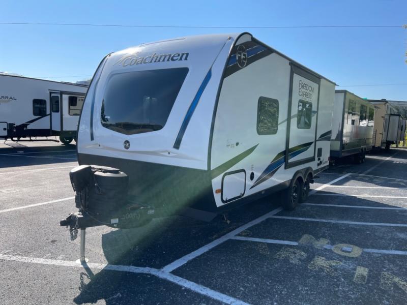 With any Freedom Express Ultra Lite travel trailer by Coachmen you will appreciate quality construction materials, such as vacuum bonded walls with Azdel composite, a 3/4 gel coated fiberglass cap with an automotive glass windshield, and a heated enclosed underbelly. Each model also features Tufflex PVC roofing, front rock guard, and E-Z Lube axles for smooth towing. Inside, you'll find kitchen backsplash, hidden hinge cabinetry, and wear-resistant vinyl flooring throughout. The power tongue jack included with the Ultra Lite Express Package will make set-up a breeze, and each model includes back-up camera prep and they are Freedom solar ready if you plan to go off-grid. Enjoy lightweight camping with a Freedom Express Ultra Lite travel trailer today!