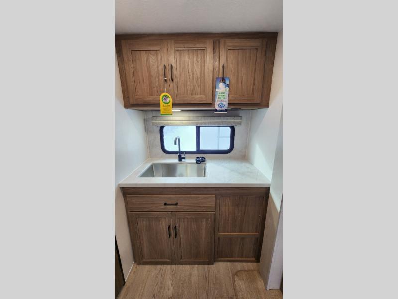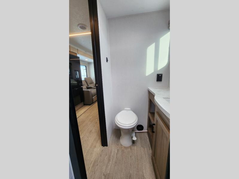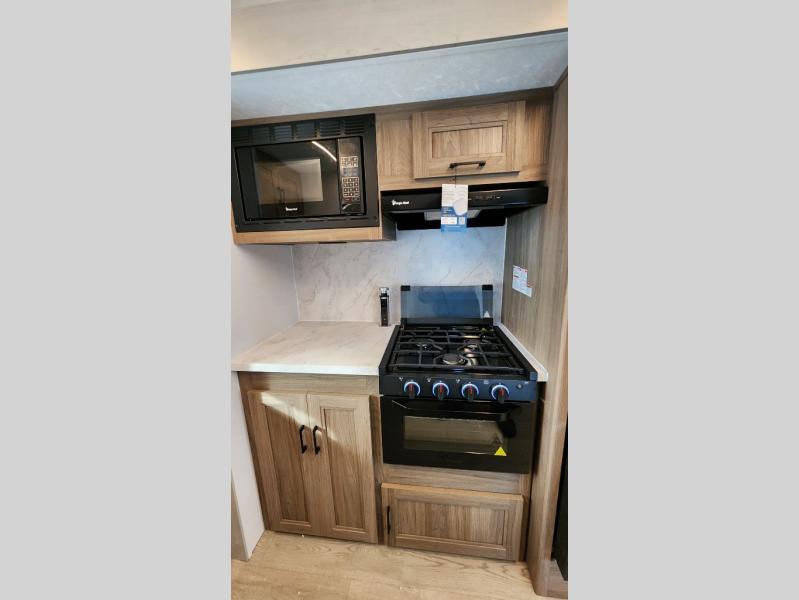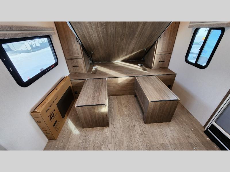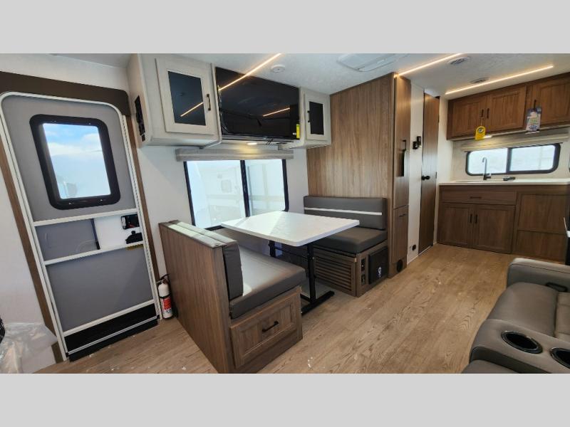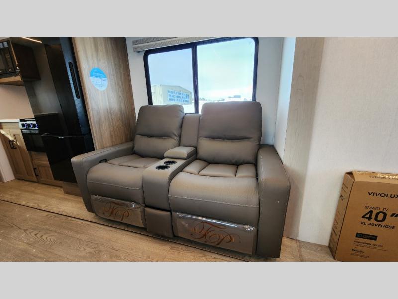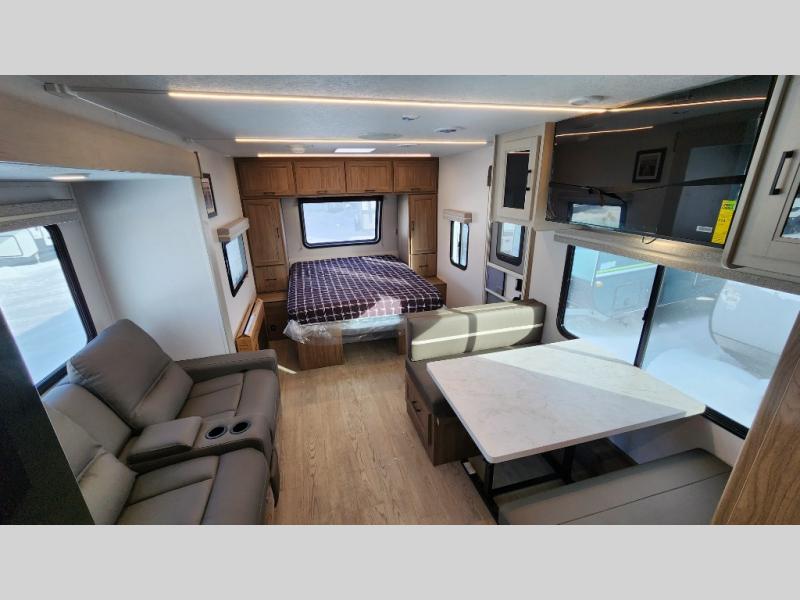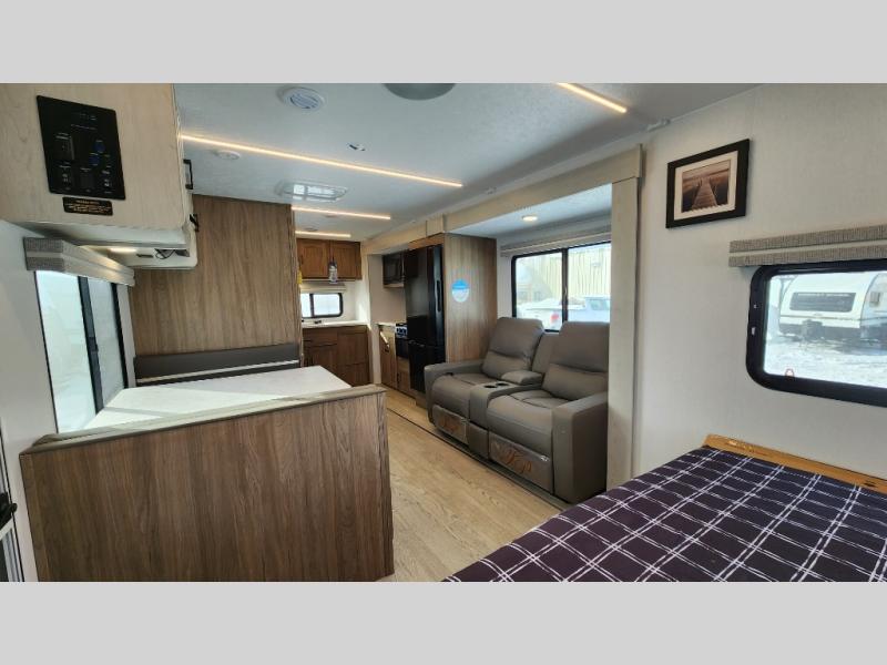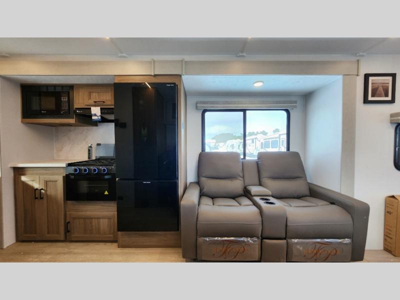 This trailer provides the perfect blend of utility and comfort. You will enjoy your own queen bed up front that includes vaulted under-bed storage for your luggage. A pair of theater seats provides a great spot to watch the flatscreen smart TV, and you can enjoy meals at the U-dinette. The chef will enjoy the well-equipped kitchen which includes a three burner cooktop, microwave, and stainless steel sink. Additional storage can be found in the overhead consoles plus a pantry/wardrobe closet.