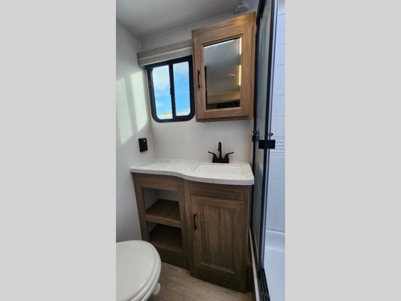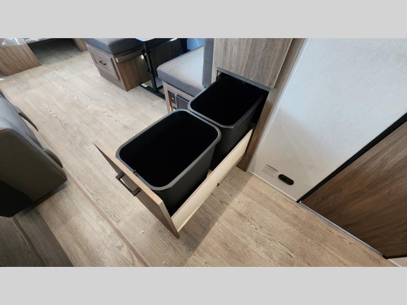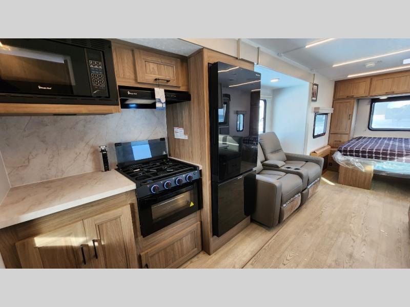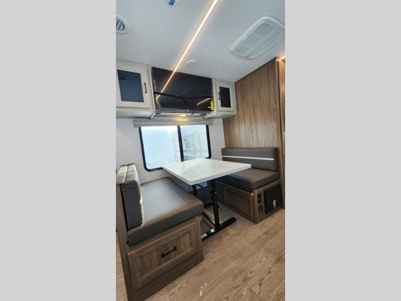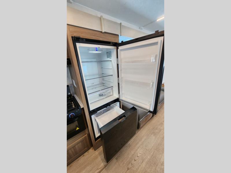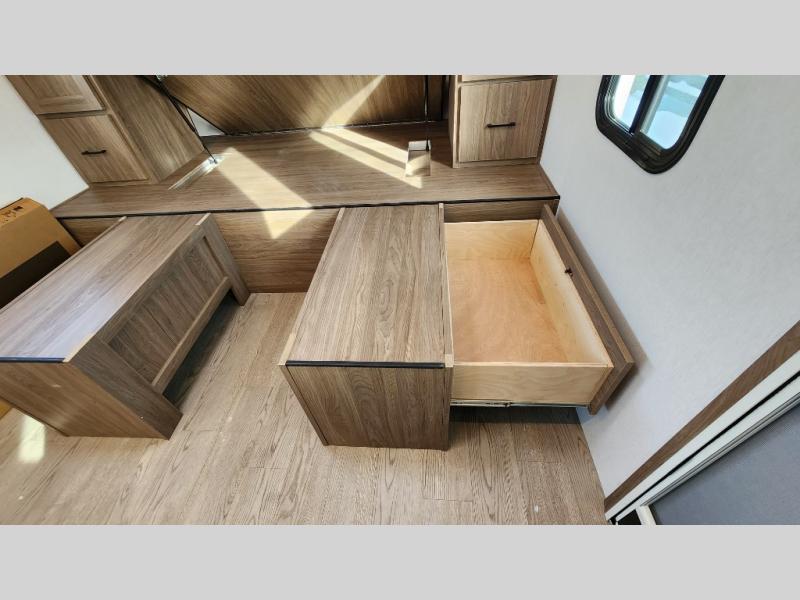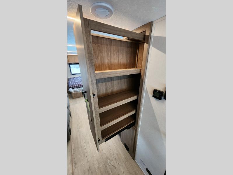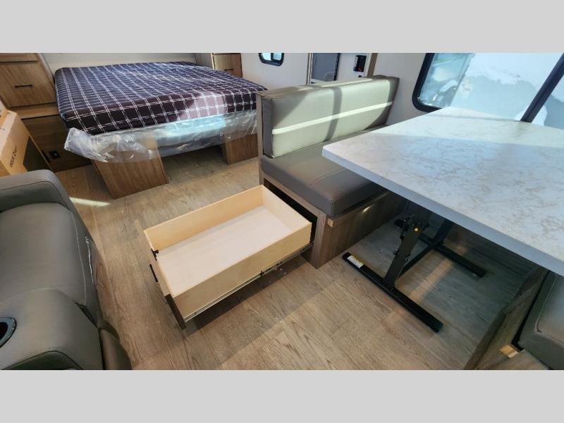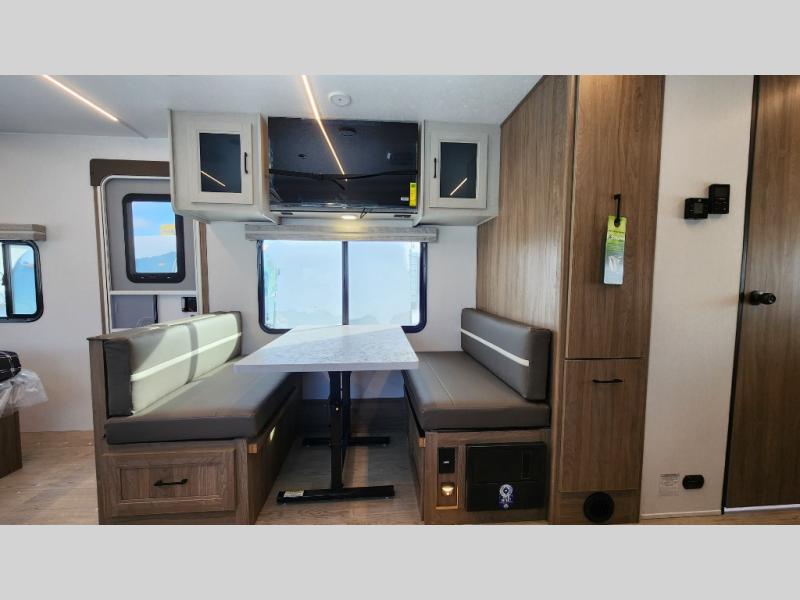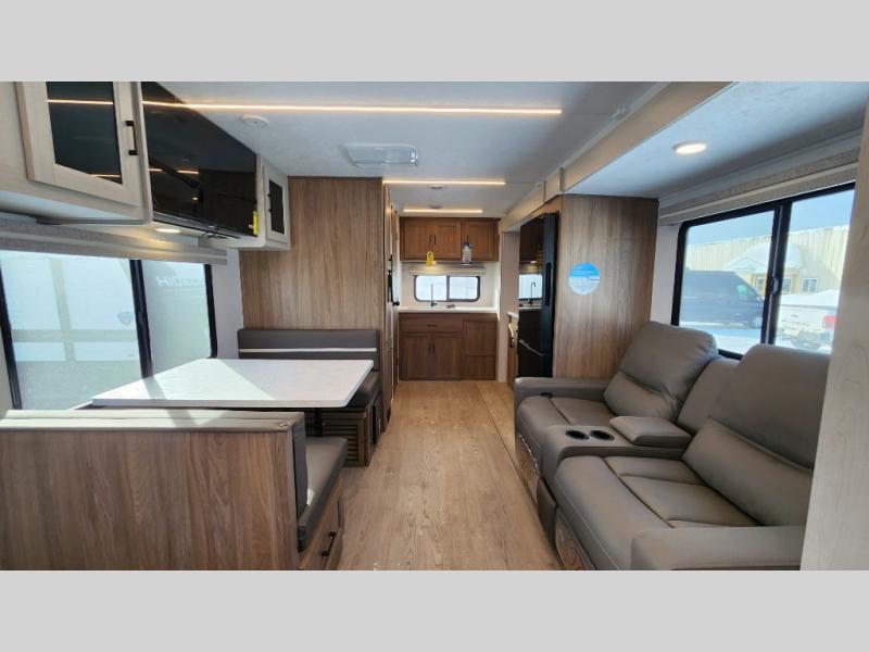 This trailer provides the perfect blend of utility and comfort. You will enjoy your own queen bed up front that includes vaulted under-bed storage for your luggage. A pair of theater seats provides a great spot to watch the flatscreen smart TV, and you can enjoy meals at the U-dinette. The chef will enjoy the well-equipped kitchen which includes a three burner cooktop, microwave, and stainless steel sink. Additional storage can be found in the overhead consoles plus a pantry/wardrobe closet.