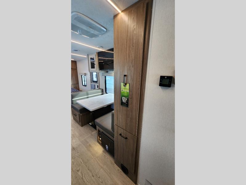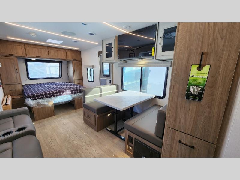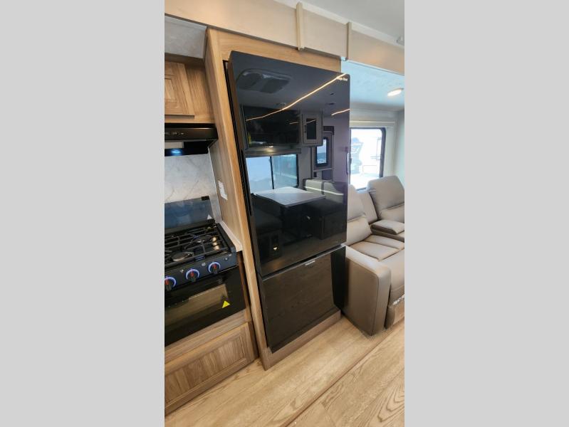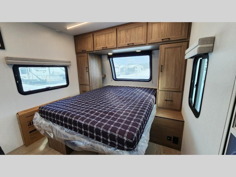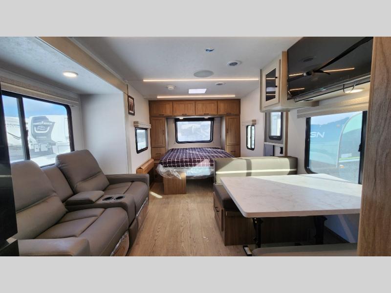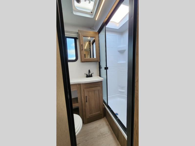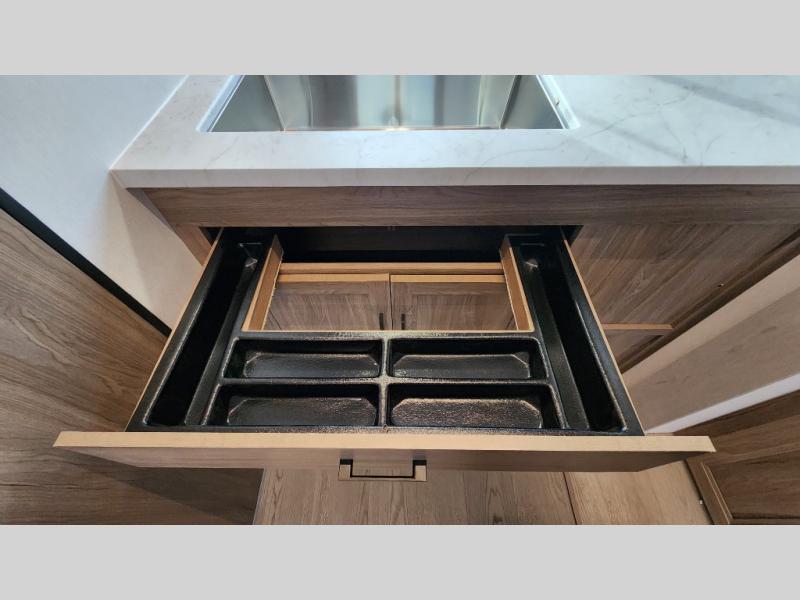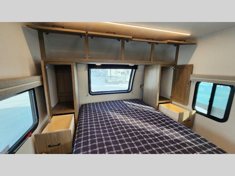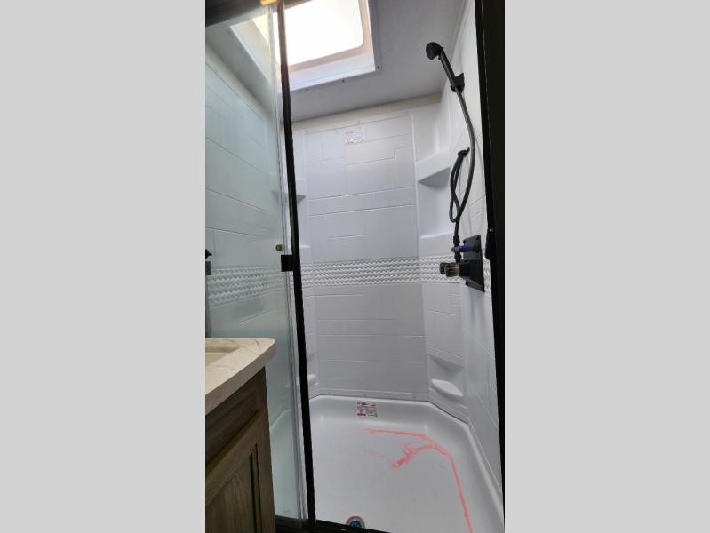 This trailer provides the perfect blend of utility and comfort. You will enjoy your own queen bed up front that includes vaulted under-bed storage for your luggage. A pair of theater seats provides a great spot to watch the flatscreen smart TV, and you can enjoy meals at the U-dinette. The chef will enjoy the well-equipped kitchen which includes a three burner cooktop, microwave, and stainless steel sink. Additional storage can be found in the overhead consoles plus a pantry/wardrobe closet.