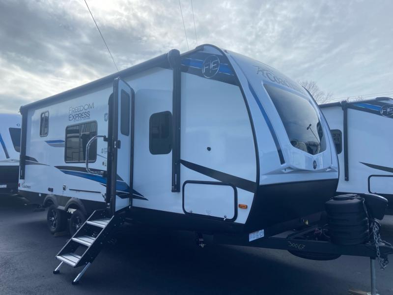 With any Freedom Express Ultra Lite travel trailer by Coachmen you will appreciate quality construction materials, such as vacuum bonded walls with Azdel composite, a 3/4 gel coated fiberglass cap with an automotive glass windshield, and a heated enclosed underbelly. Each model also features Tufflex PVC roofing, front rock guard, and E-Z Lube axles for smooth towing. Inside, you'll find kitchen backsplash, hidden hinge cabinetry, and wear-resistant vinyl flooring throughout. The power tongue jack included with the Ultra Lite Express Package will make set-up a breeze, and each model includes back-up camera prep and they are Freedom solar ready if you plan to go off-grid. Enjoy lightweight camping with a Freedom Express Ultra Lite travel trailer today!