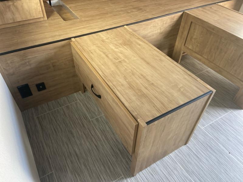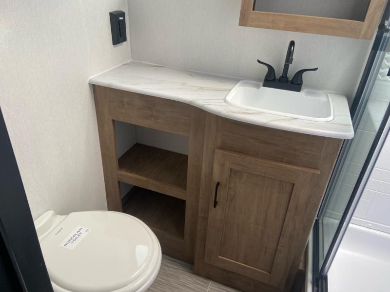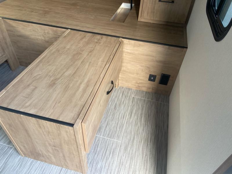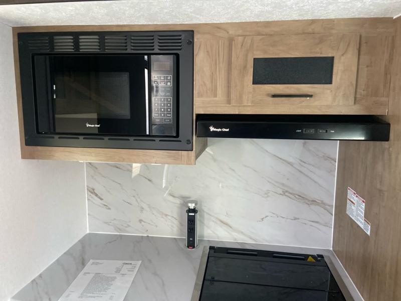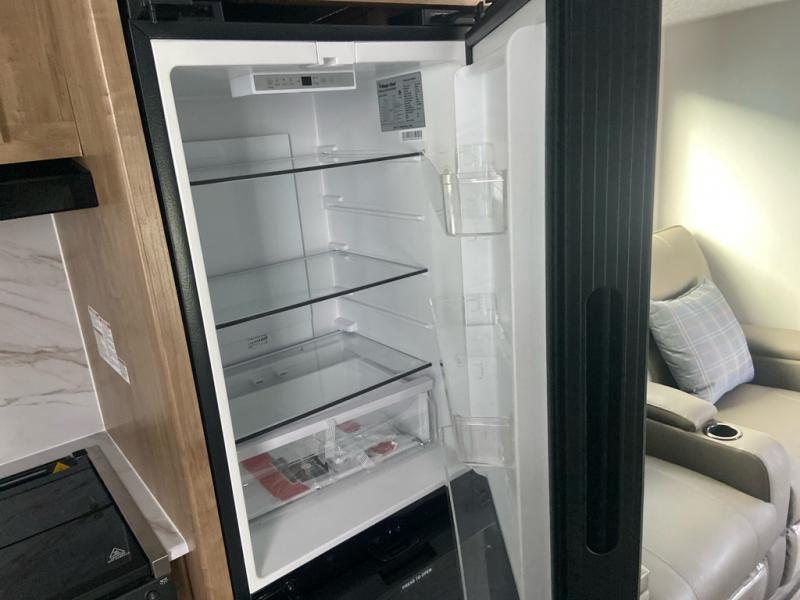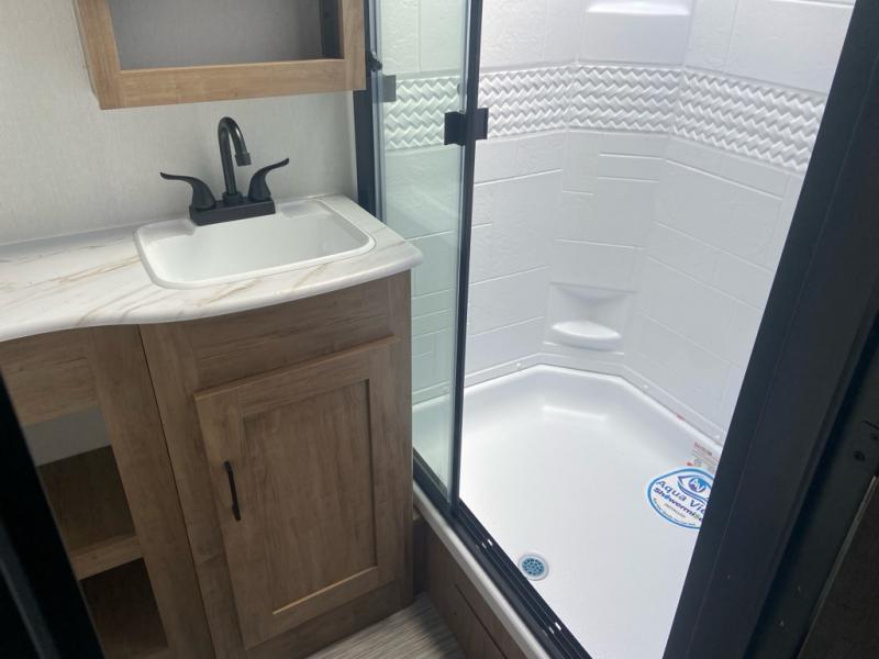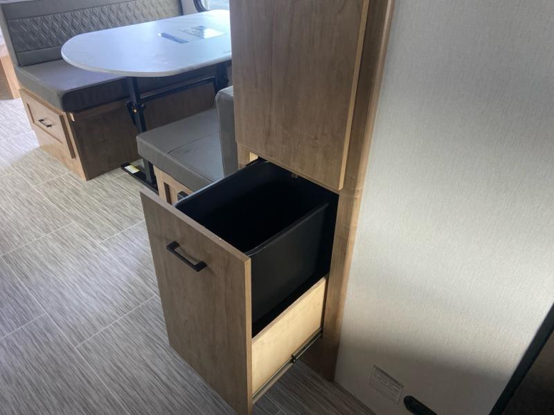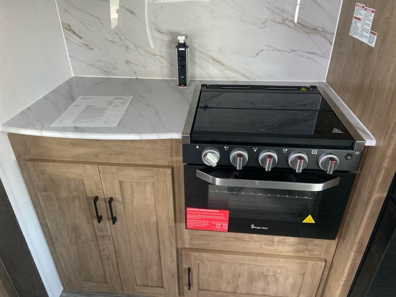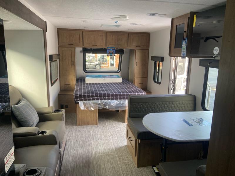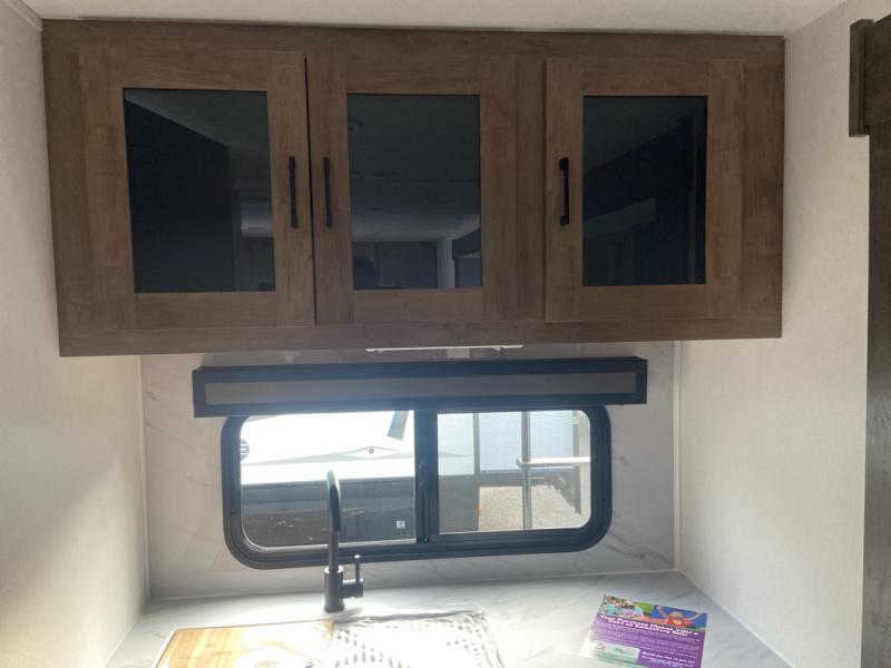 This trailer provides the perfect blend of utility and comfort. You will enjoy your own queen bed up front that includes vaulted under-bed storage for your luggage. A pair of theater seats provides a great spot to watch the flatscreen smart TV, and you can enjoy meals at the U-dinette. The chef will enjoy the well-equipped kitchen which includes a three burner cooktop, microwave, and stainless steel sink. Additional storage can be found in the overhead consoles plus a pantry/wardrobe closet.
