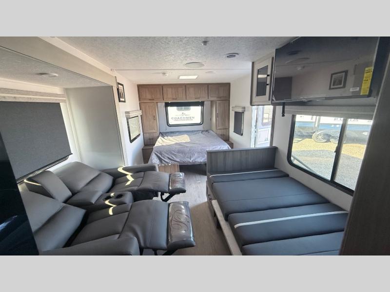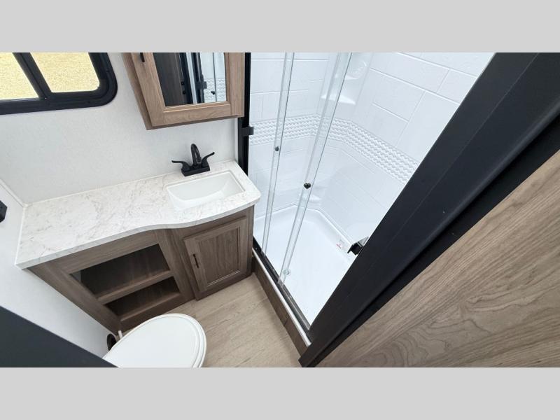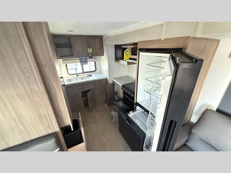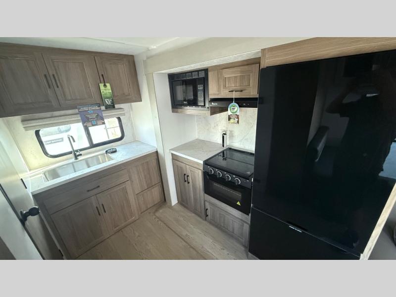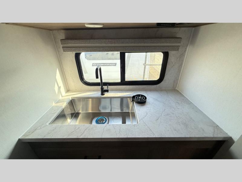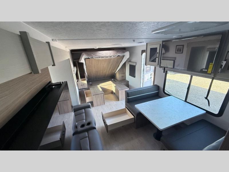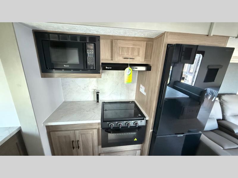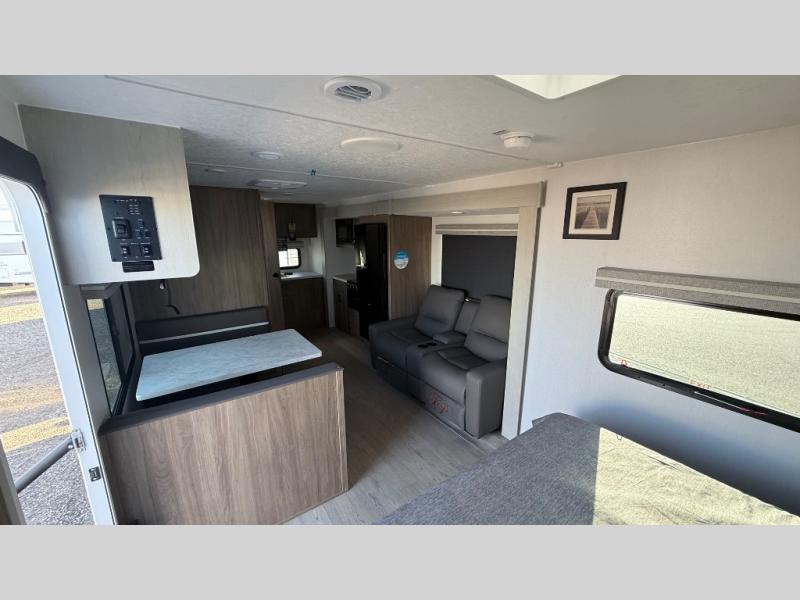 This trailer provides the perfect blend of utility and comfort. You will enjoy your own queen bed up front that includes vaulted under-bed storage for your luggage. A pair of theater seats provides a great spot to watch the flatscreen smart TV, and you can enjoy meals at the U-dinette. The chef will enjoy the well-equipped kitchen which includes a three burner cooktop, microwave, and stainless steel sink. Additional storage can be found in the overhead consoles plus a pantry/wardrobe closet.