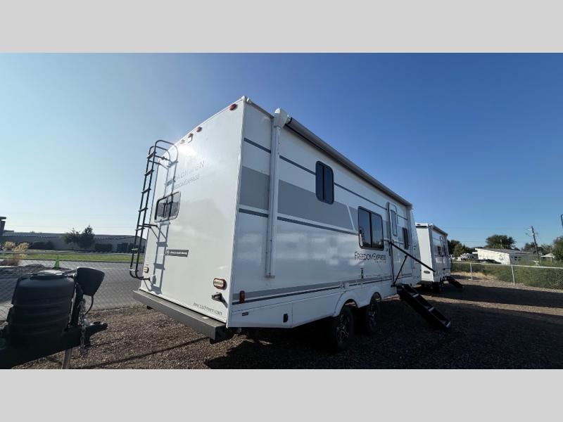 With any Freedom Express Ultra Lite travel trailer by Coachmen you will appreciate quality construction materials, such as vacuum bonded walls with Azdel composite, a 3/4 gel coated fiberglass cap with an automotive glass windshield, and a heated enclosed underbelly. Each model also features Tufflex PVC roofing, front rock guard, and E-Z Lube axles for smooth towing. Inside, you'll find kitchen backsplash, hidden hinge cabinetry, and wear-resistant vinyl flooring throughout. The power tongue jack included with the Ultra Lite Express Package will make set-up a breeze, and each model includes back-up camera prep and they are Freedom solar ready if you plan to go off-grid. Enjoy lightweight camping with a Freedom Express Ultra Lite travel trailer today!
