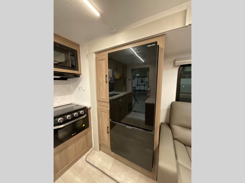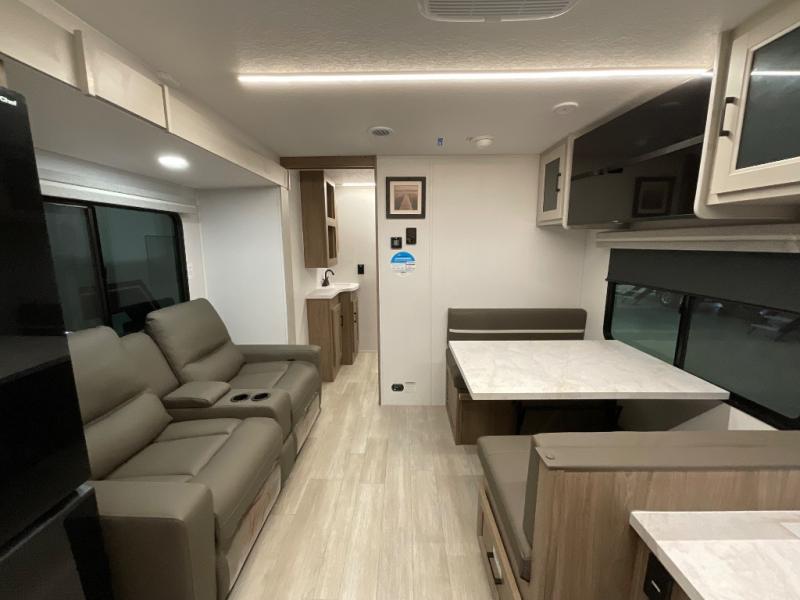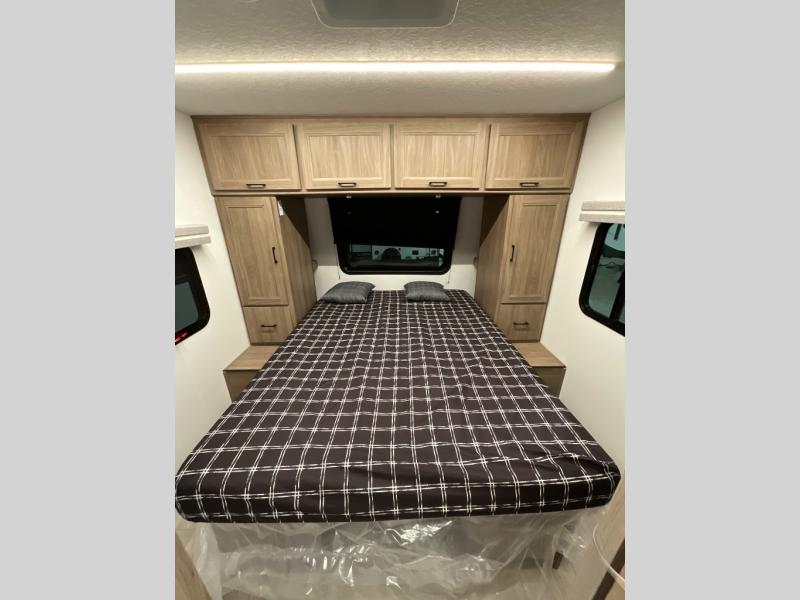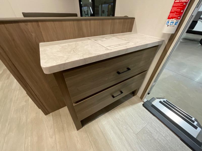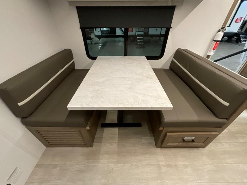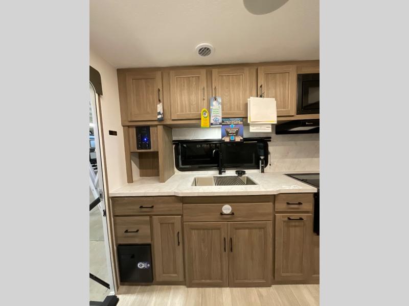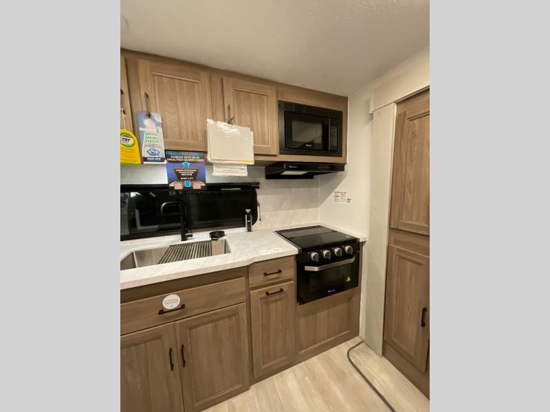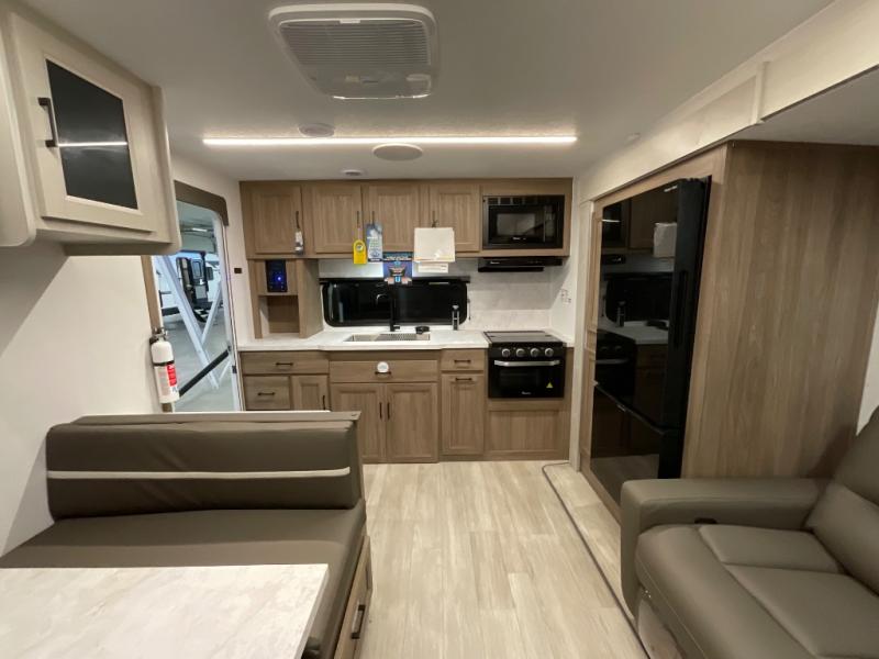 Check out this rear kitchen travel trailer that can sleep three to four each night. The front master bedroom includes a queen bed with vaulted under-bed storage for your belongings and dual wardrobes for even more storage. The theater seating within the large slide out and the booth dinette will provide comfortable seating space, and there is a Smart TV for those rainy camp days. This model also includes a three burner cooktop, a microwave oven, and an 8 cu. ft. double door refrigerator for your perishables. And don't forget about the power awning with LED lights!