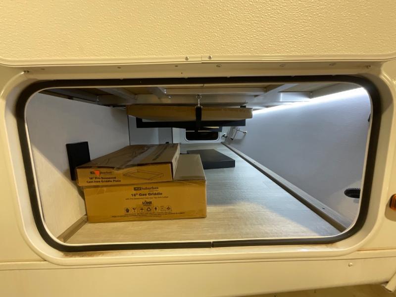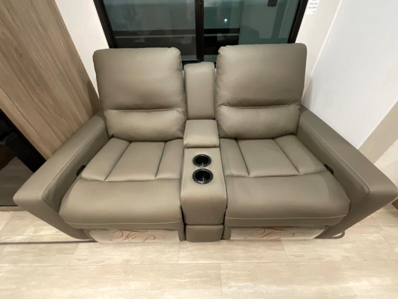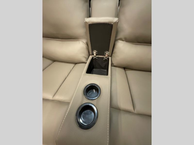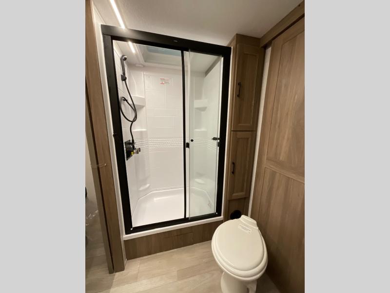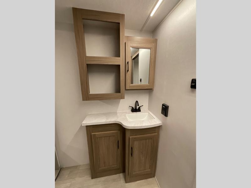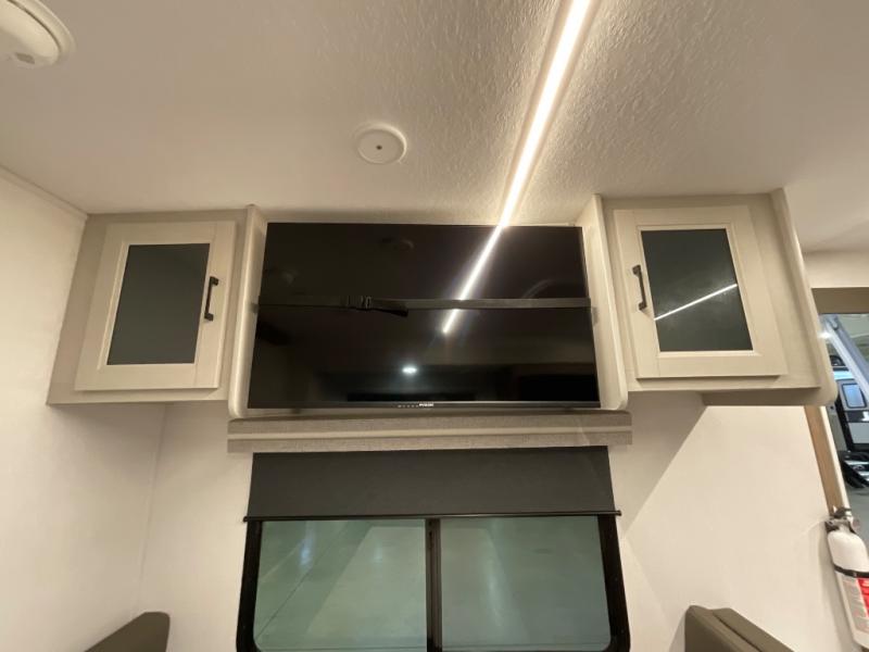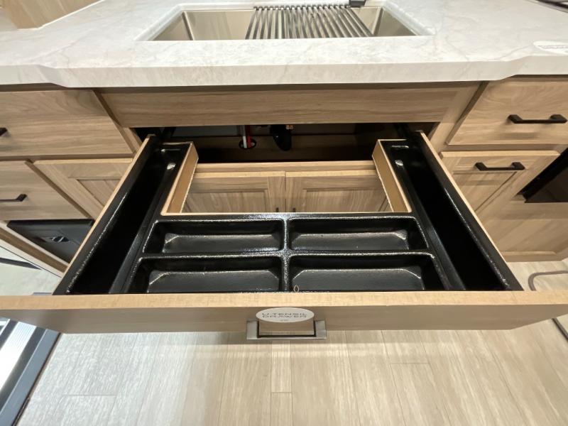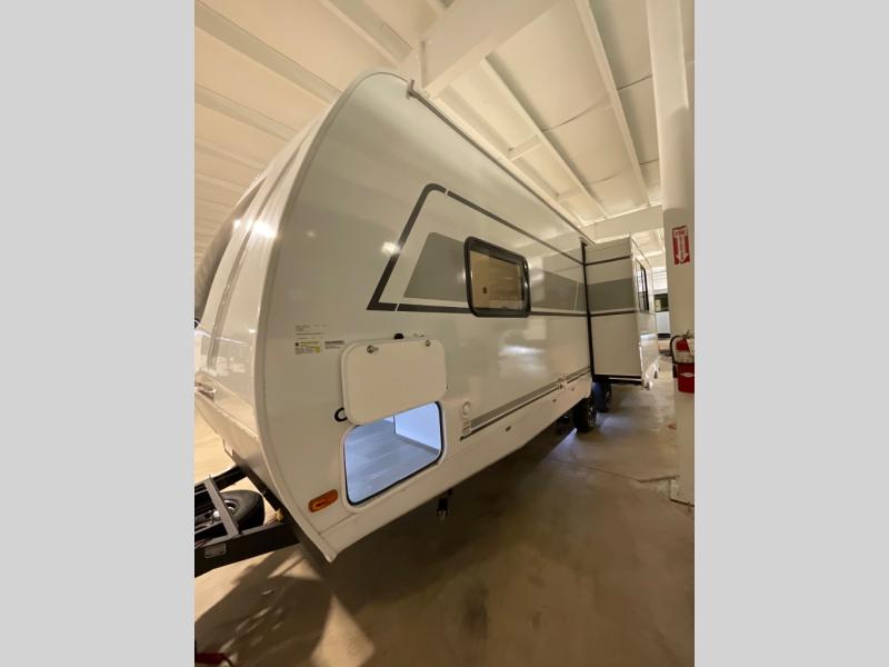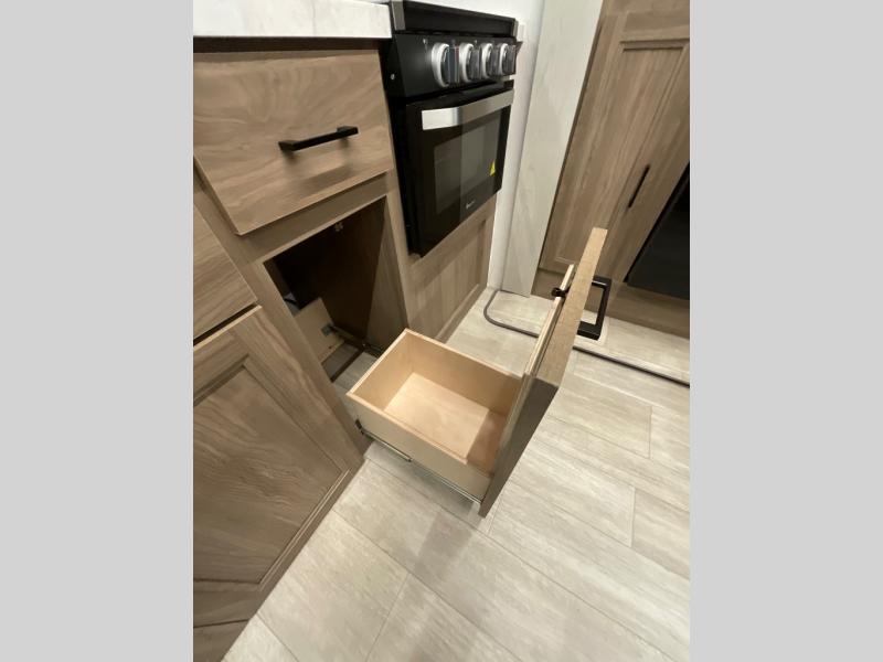 Check out this rear kitchen travel trailer that can sleep three to four each night. The front master bedroom includes a queen bed with vaulted under-bed storage for your belongings and dual wardrobes for even more storage. The theater seating within the large slide out and the booth dinette will provide comfortable seating space, and there is a Smart TV for those rainy camp days. This model also includes a three burner cooktop, a microwave oven, and an 8 cu. ft. double door refrigerator for your perishables. And don't forget about the power awning with LED lights!