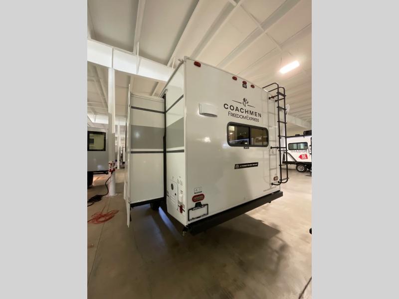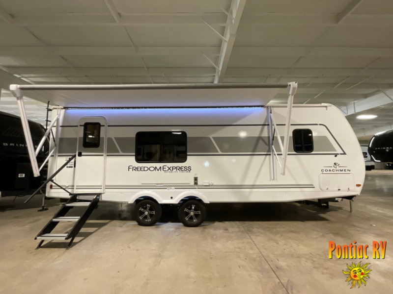 With any Freedom Express Ultra Lite travel trailer by Coachmen you will appreciate quality construction materials, such as vacuum bonded walls with Azdel composite, a 3/4 gel coated fiberglass cap with an automotive glass windshield, and a heated enclosed underbelly. Each model also features Tufflex PVC roofing, front rock guard, and E-Z Lube axles for smooth towing. Inside, you'll find kitchen backsplash, hidden hinge cabinetry, and wear-resistant vinyl flooring throughout. The power tongue jack included with the Ultra Lite Express Package will make set-up a breeze, and each model includes back-up camera prep and they are Freedom solar ready if you plan to go off-grid. Enjoy lightweight camping with a Freedom Express Ultra Lite travel trailer today!