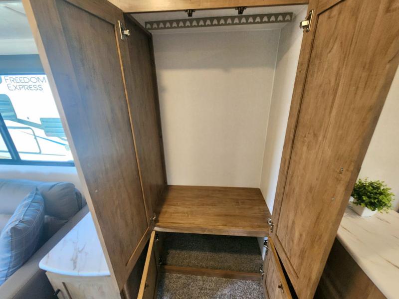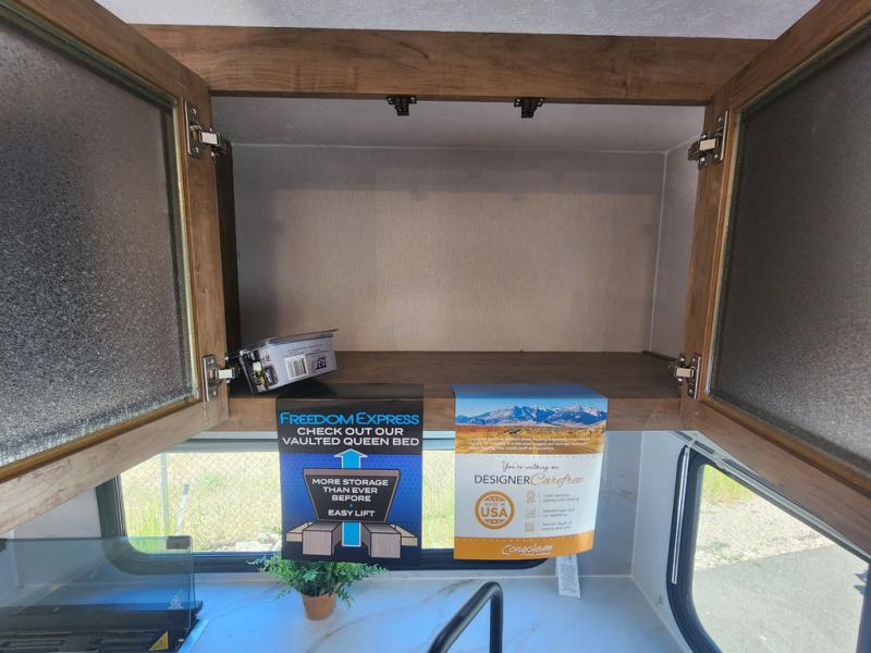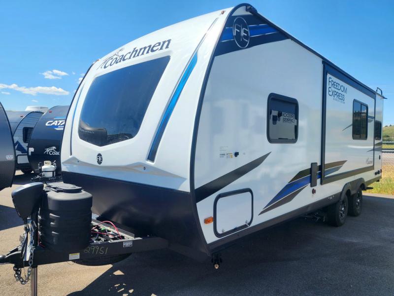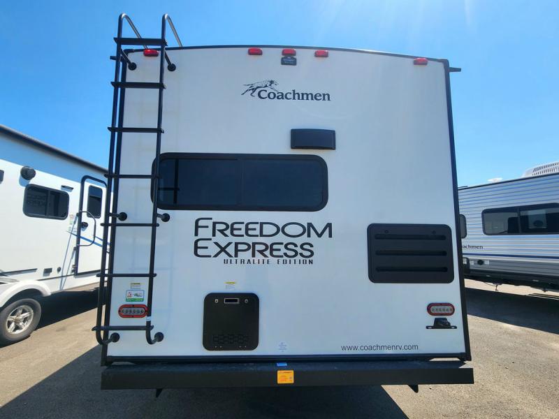 With any Freedom Express Ultra Lite travel trailer by Coachmen you will appreciate quality construction materials, such as vacuum bonded walls with Azdel composite, a 3/4 gel coated fiberglass cap with an automotive glass windshield, and a heated enclosed underbelly. Each model also features Tufflex PVC roofing, front rock guard, and E-Z Lube axles for smooth towing. Inside, you'll find kitchen backsplash, hidden hinge cabinetry, and wear-resistant vinyl flooring throughout. The power tongue jack included with the Ultra Lite Express Package will make set-up a breeze, and each model includes back-up camera prep and they are Freedom solar ready if you plan to go off-grid. Enjoy lightweight camping with a Freedom Express Ultra Lite travel trailer today!