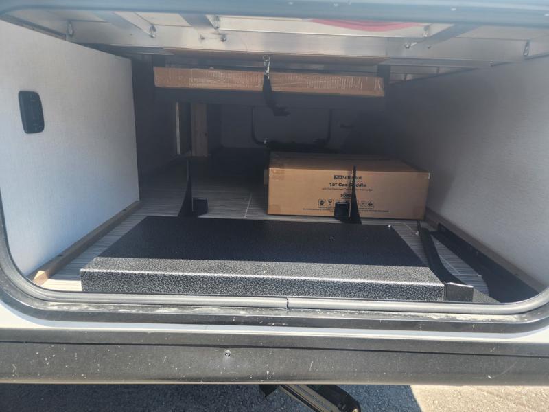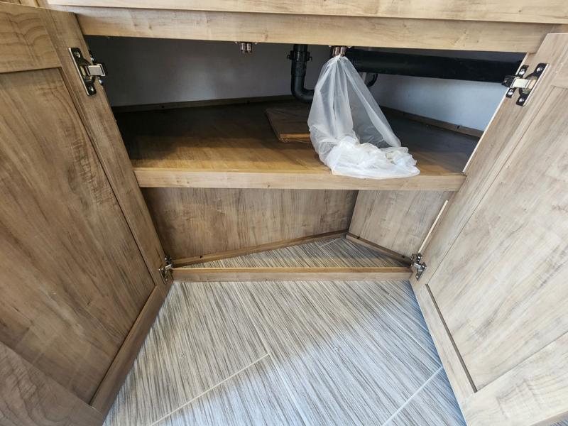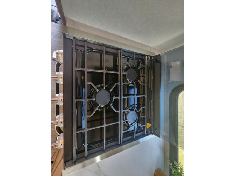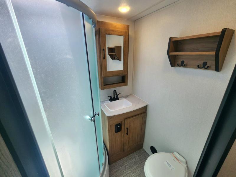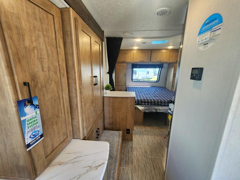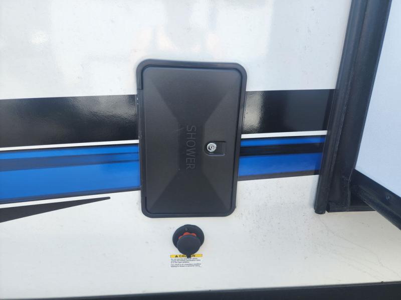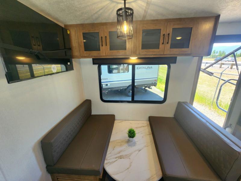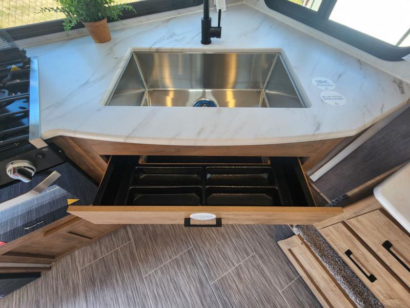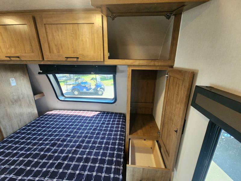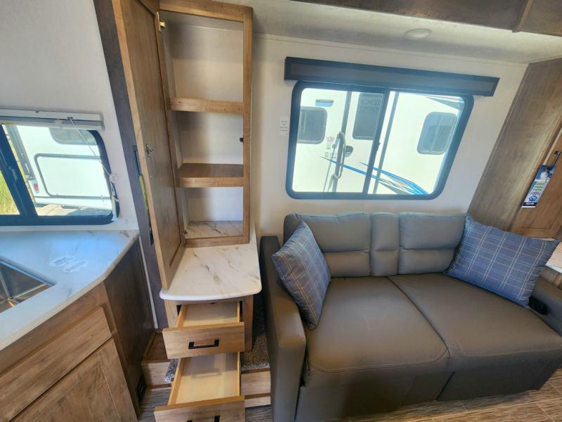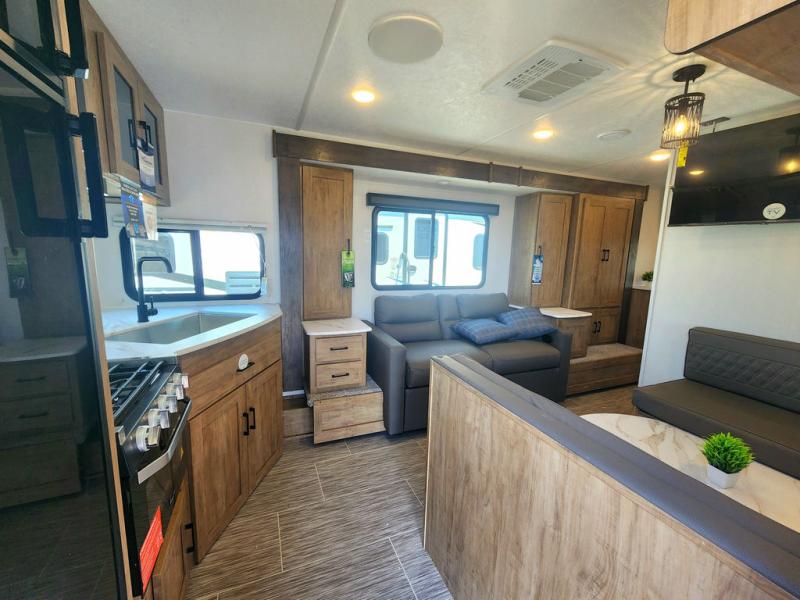 Check out this rear kitchen travel trailer that can sleep three to four each night. The front semi-private bedroom includes a privacy curtain and a queen bed with vaulted under-bed storage for your belongings. The sofa within the large slide out and the booth dinette will provide comfortable seating space, and there is a Smart TV for those rainy camp days. This model also includes a three burner cooktop, a microwave oven, and an 8 cu. ft. double door refrigerator for your perishables. And don't forget about the 18' power awning with LED lights!