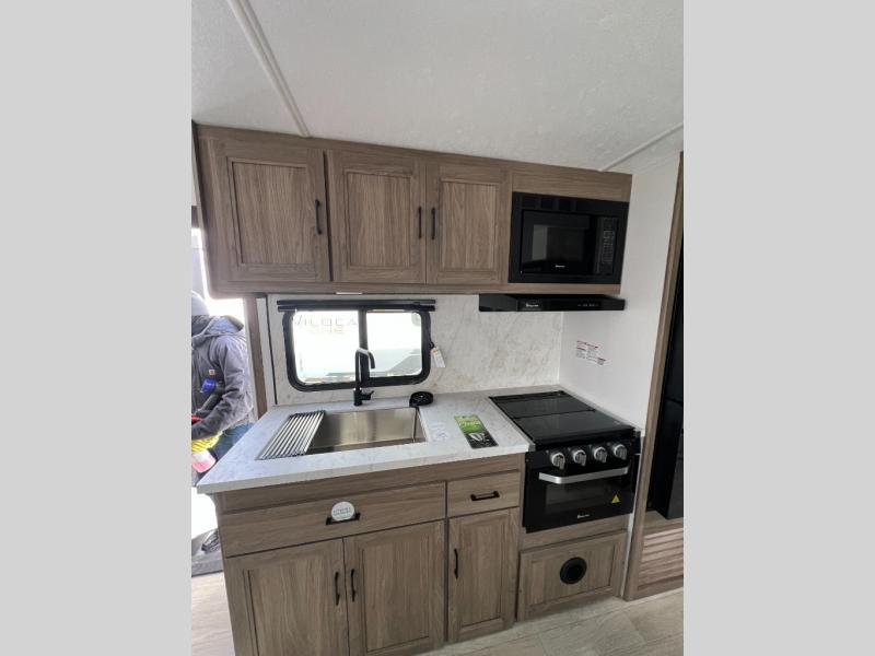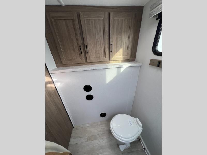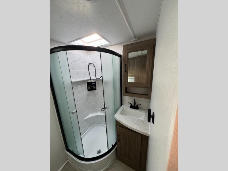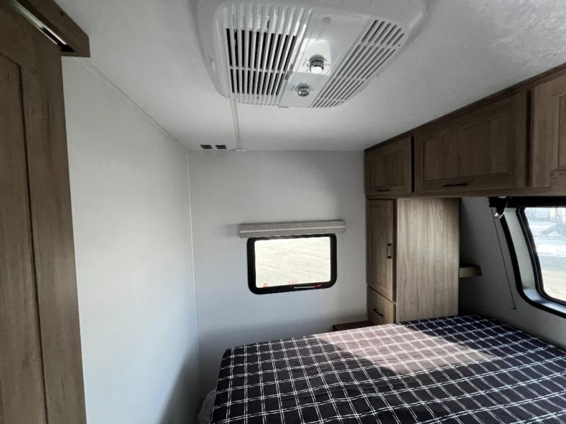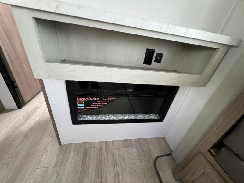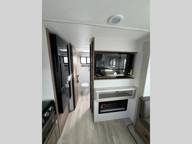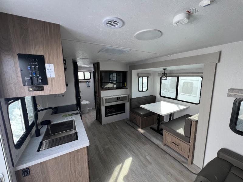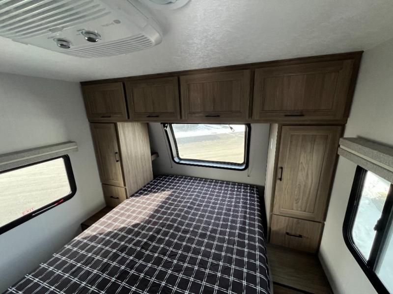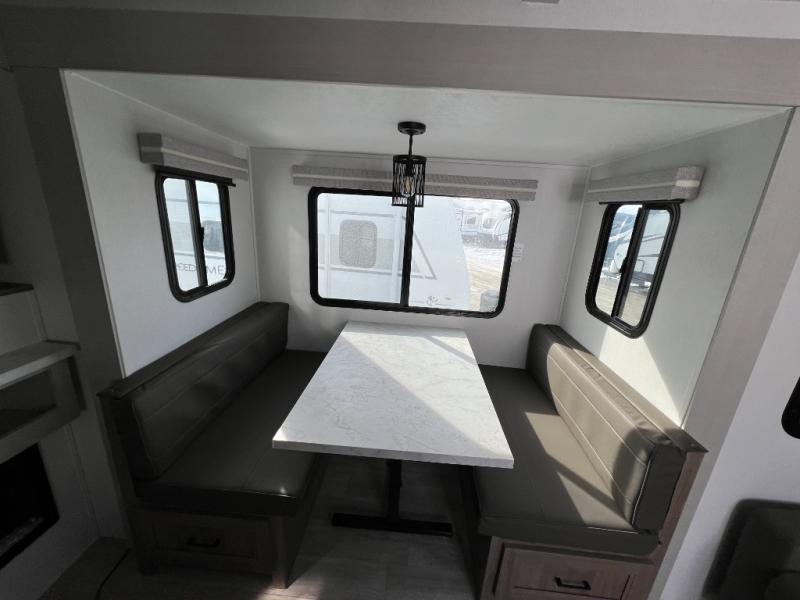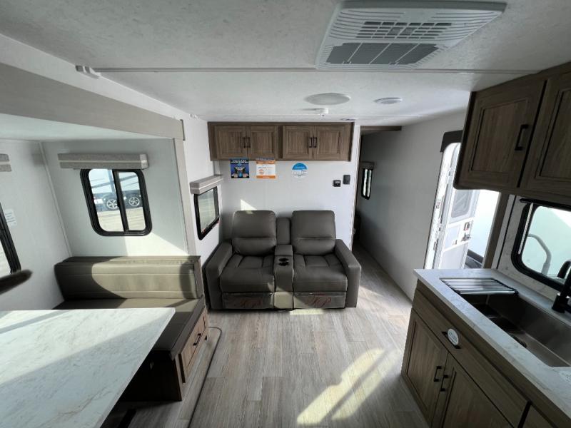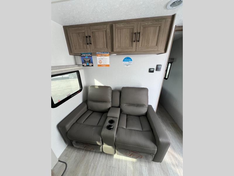 This travel trailer will feel just like home with its private bedroom and spacious full rear bath. You will appreciate the vaulted under-bed storage for extra blankets, shoes, and luggage, plus there are dual wardrobes on either side of the bed for your book and glasses. Get comfortable in the main living area on the sofa or at the booth dinette, or you can choose the optional theater seat or optional hide-a-bed sofa in place of the standard sofa. The chef of your group can prepare meals indoors or outdoors on the full camp kitchen, and check out the large 20' power awning with LED lights that will provide protection from the elements.