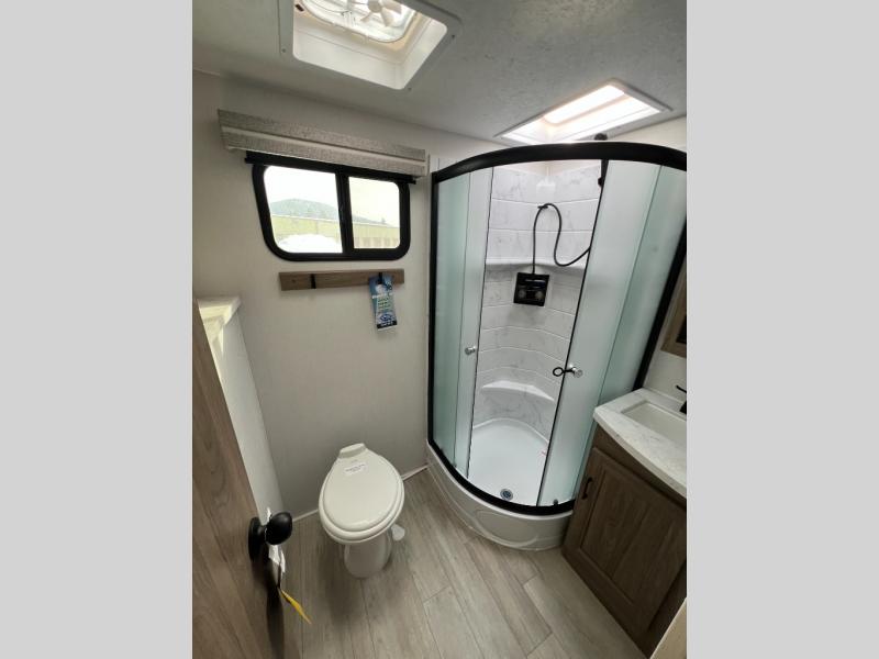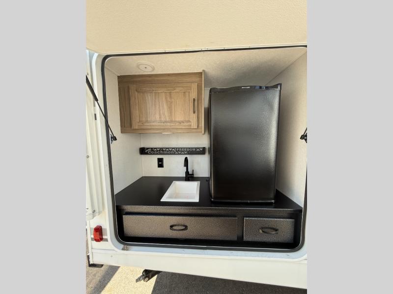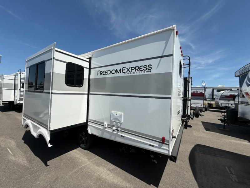 With any Freedom Express Ultra Lite travel trailer by Coachmen you will appreciate quality construction materials, such as vacuum bonded walls with Azdel composite, a 3/4 gel coated fiberglass cap with an automotive glass windshield, and a heated enclosed underbelly. Each model also features Tufflex PVC roofing, front rock guard, and E-Z Lube axles for smooth towing. Inside, you'll find kitchen backsplash, hidden hinge cabinetry, and wear-resistant vinyl flooring throughout. The power tongue jack included with the Ultra Lite Express Package will make set-up a breeze, and each model includes back-up camera prep and they are Freedom solar ready if you plan to go off-grid. Enjoy lightweight camping with a Freedom Express Ultra Lite travel trailer today!