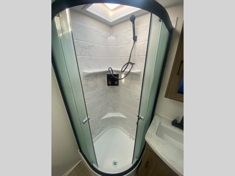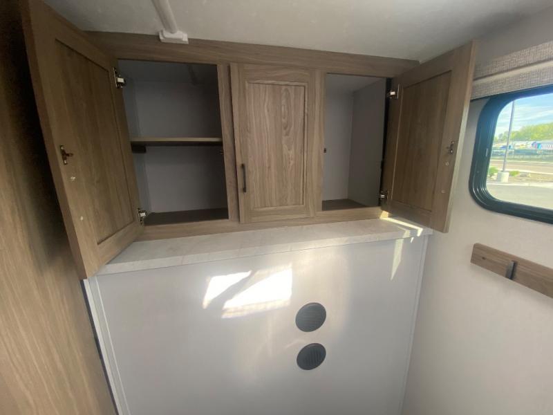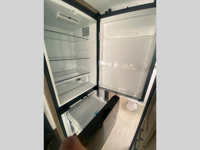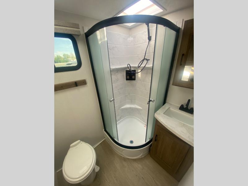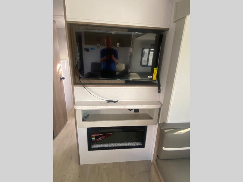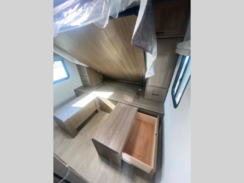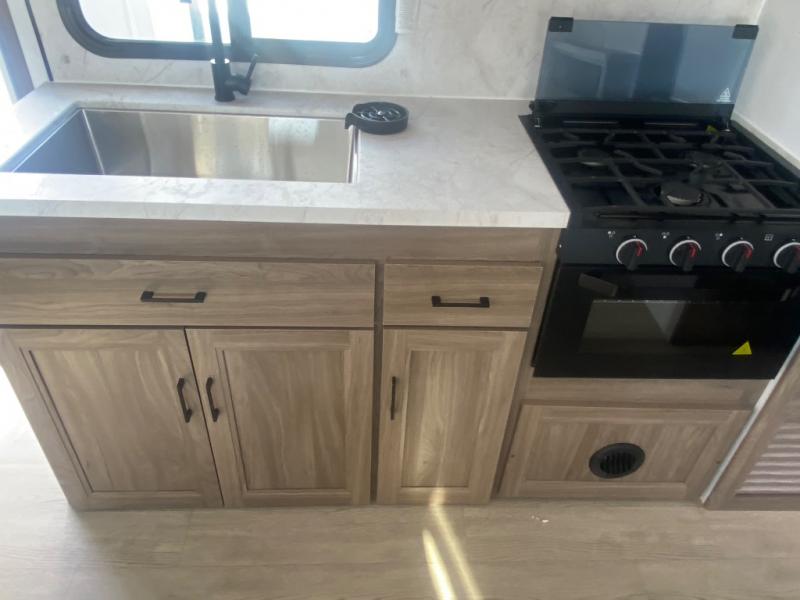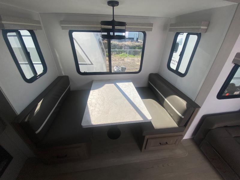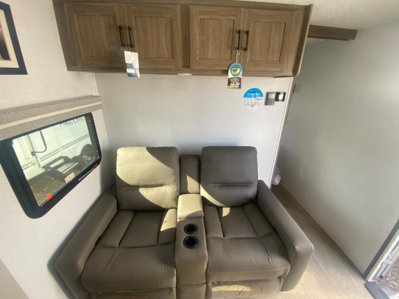 This travel trailer will feel just like home with its private bedroom and spacious full rear bath. You will appreciate the vaulted under-bed storage for extra blankets, shoes, and luggage, plus there are dual wardrobes on either side of the bed for your book and glasses. Get comfortable in the main living area on the sofa or at the booth dinette, or you can choose the optional theater seat or optional hide-a-bed sofa in place of the standard sofa. The chef of your group can prepare meals indoors or outdoors on the full camp kitchen, and check out the large 20' power awning with LED lights that will provide protection from the elements.