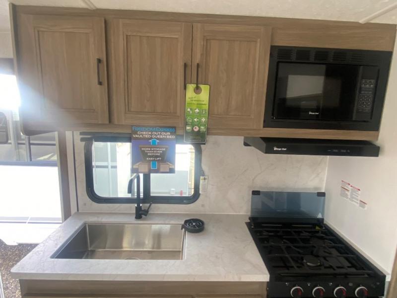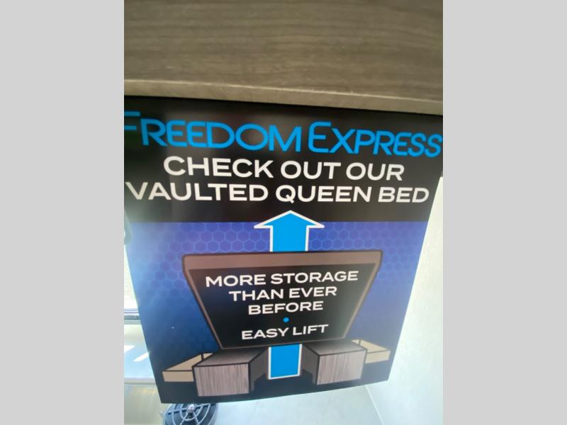 With any Freedom Express Ultra Lite travel trailer by Coachmen you will appreciate quality construction materials, such as vacuum bonded walls with Azdel composite, a 3/4 gel coated fiberglass cap with an automotive glass windshield, and a heated enclosed underbelly. Each model also features Tufflex PVC roofing, front rock guard, and E-Z Lube axles for smooth towing. Inside, you'll find kitchen backsplash, hidden hinge cabinetry, and wear-resistant vinyl flooring throughout. The power tongue jack included with the Ultra Lite Express Package will make set-up a breeze, and each model includes back-up camera prep and they are Freedom solar ready if you plan to go off-grid. Enjoy lightweight camping with a Freedom Express Ultra Lite travel trailer today!