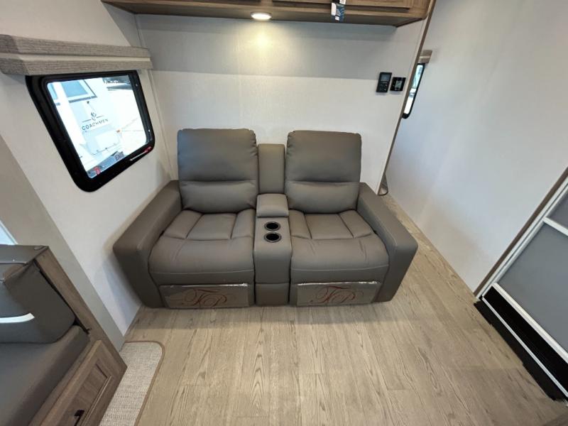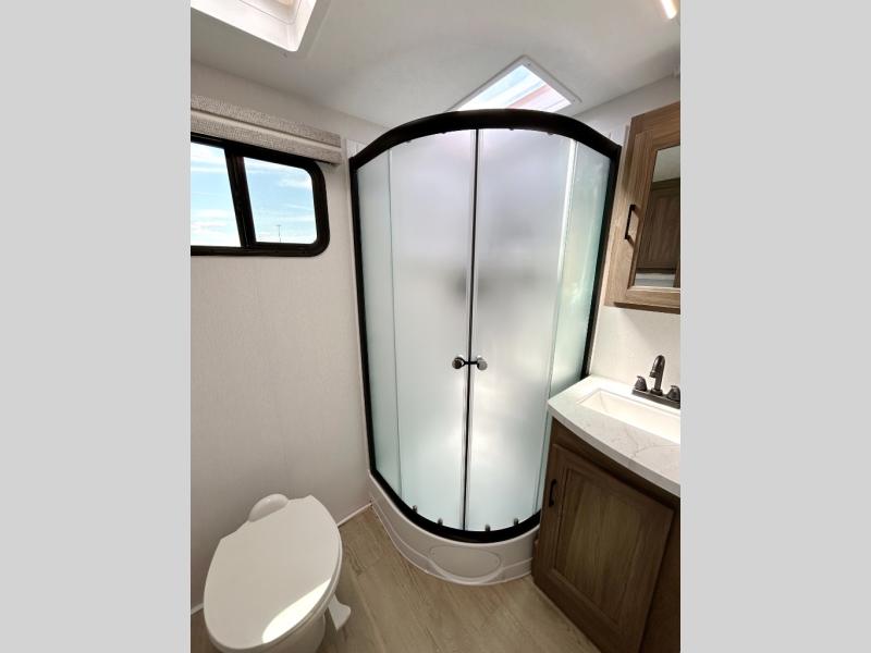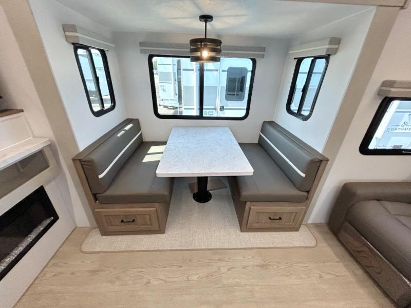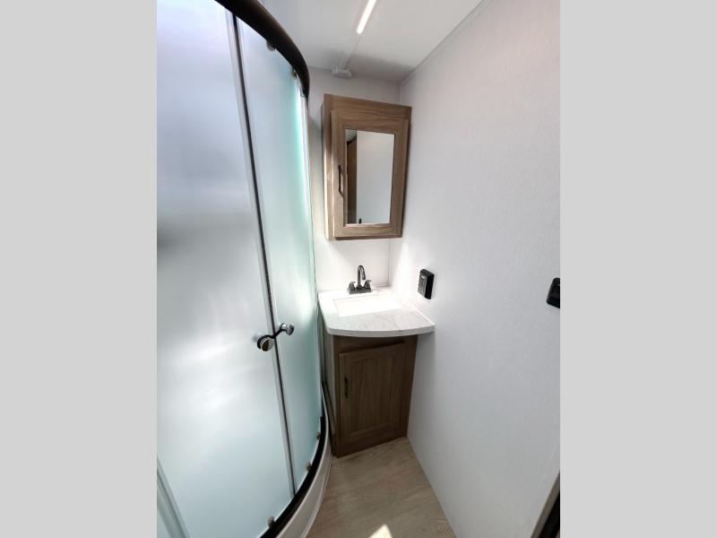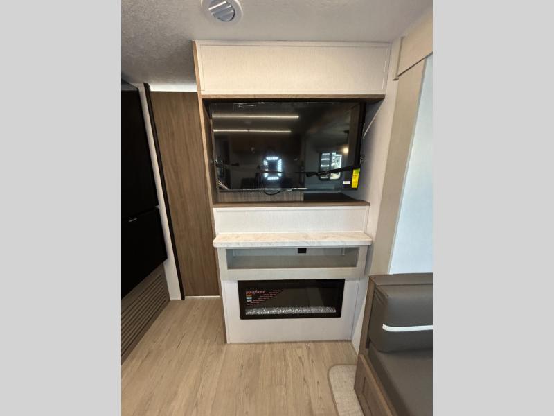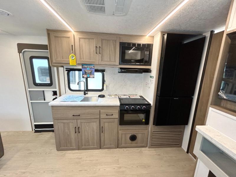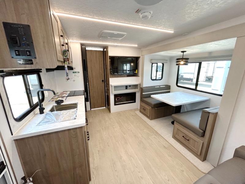 This travel trailer will feel just like home with its private bedroom and spacious full rear bath. You will appreciate the vaulted under-bed storage for extra blankets, shoes, and luggage, plus there are dual wardrobes on either side of the bed for your book and glasses. Get comfortable in the main living area on the theater seat or at the booth dinette. The chef of your group can prepare meals indoors or outdoors on the full camp kitchen, and check out the large 20' power awning with LED lights that will provide protection from the elements.