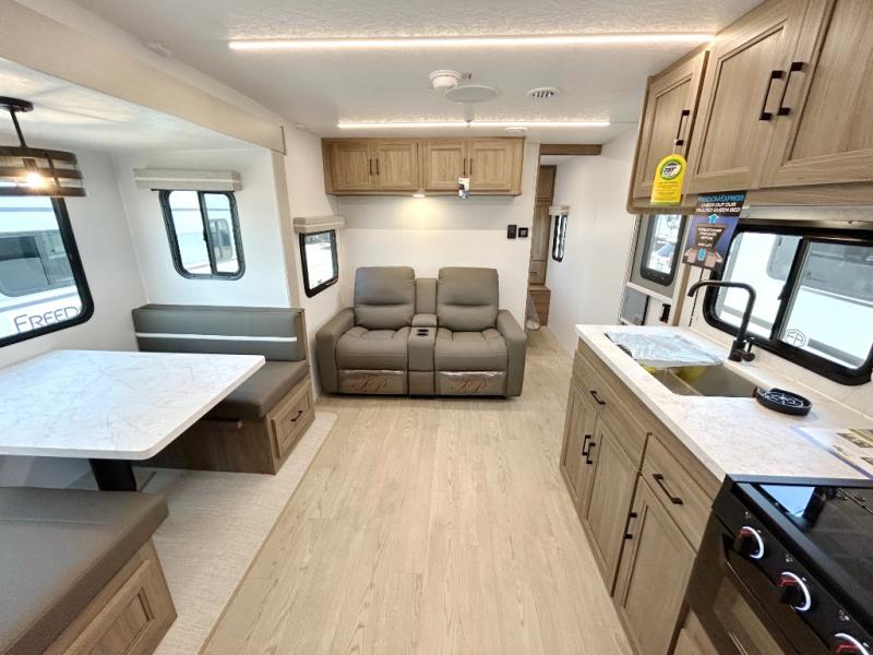 With any Freedom Express Ultra Lite travel trailer by Coachmen you will appreciate quality construction materials, such as vacuum bonded walls with Azdel composite, a 3/4 gel coated fiberglass cap with an automotive glass windshield, and a heated enclosed underbelly. Each model also features Tufflex PVC roofing, front rock guard, and E-Z Lube axles for smooth towing. Inside, you'll find kitchen backsplash, hidden hinge cabinetry, and wear-resistant vinyl flooring throughout. The power tongue jack included with the Ultra Lite Express Package will make set-up a breeze, and each model includes back-up camera prep and they are Freedom solar ready if you plan to go off-grid. Enjoy lightweight camping with a Freedom Express Ultra Lite travel trailer today!
