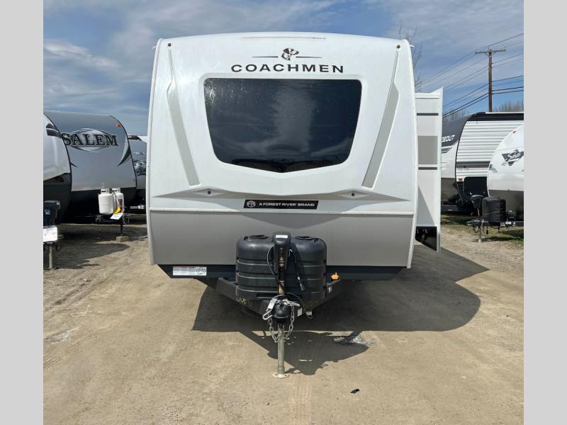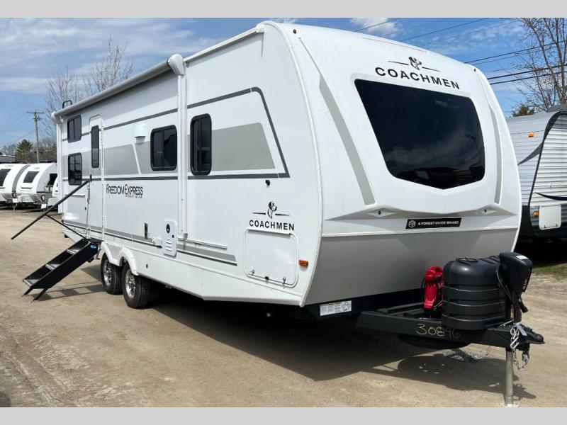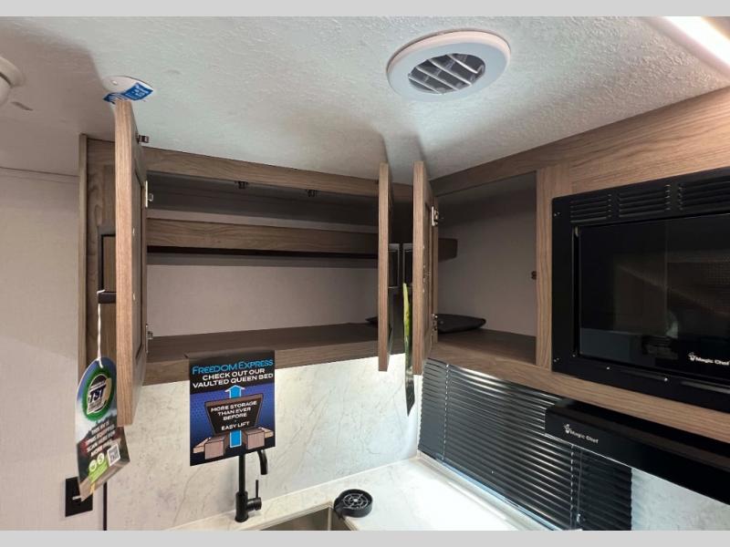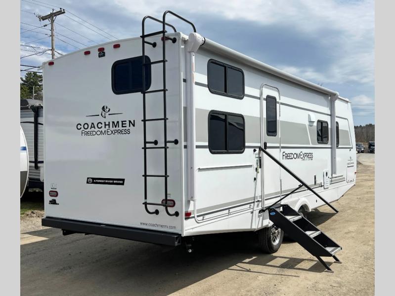 With any Freedom Express Ultra Lite travel trailer by Coachmen you will appreciate quality construction materials, such as vacuum bonded walls with Azdel composite, a 3/4 gel coated fiberglass cap with an automotive glass windshield, and a heated enclosed underbelly. Each model also features Tufflex PVC roofing, front rock guard, and E-Z Lube axles for smooth towing. Inside, you'll find kitchen backsplash, hidden hinge cabinetry, and wear-resistant vinyl flooring throughout. The power tongue jack included with the Ultra Lite Express Package will make set-up a breeze, and each model includes back-up camera prep and they are Freedom solar ready if you plan to go off-grid. Enjoy lightweight camping with a Freedom Express Ultra Lite travel trailer today!
