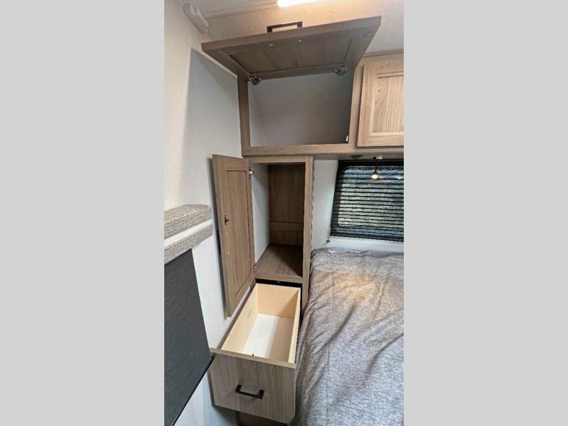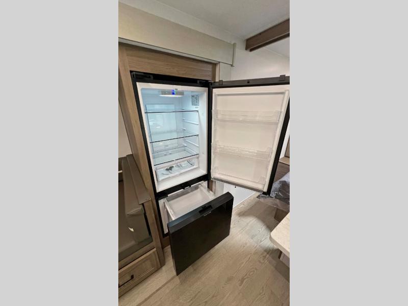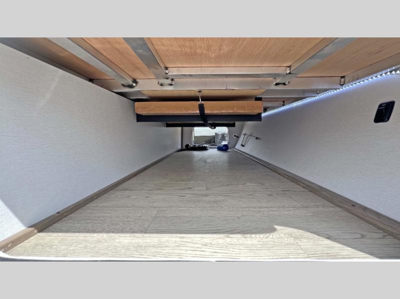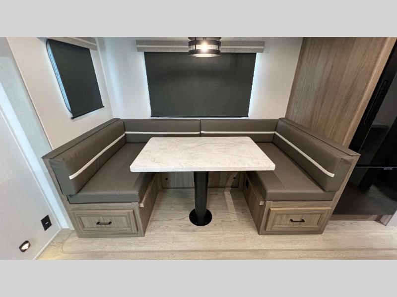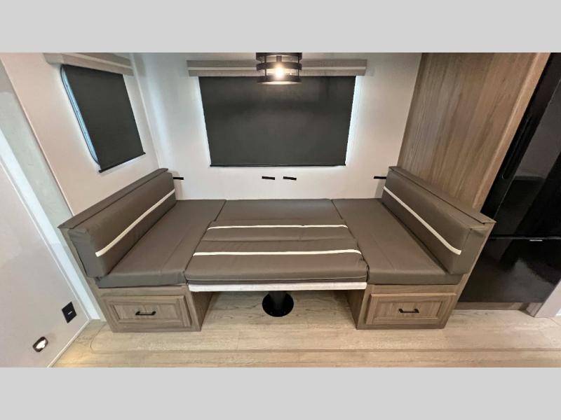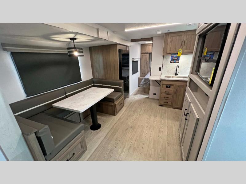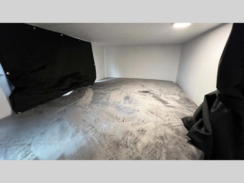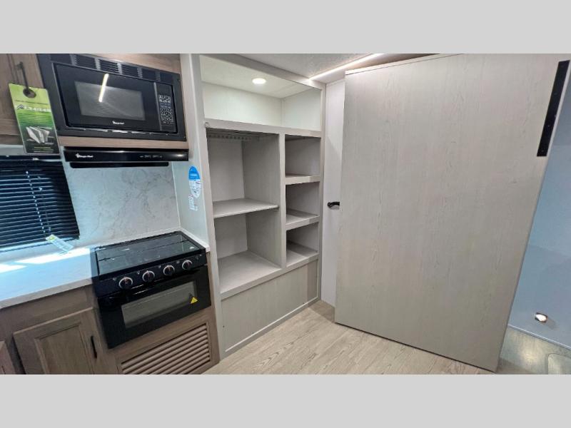 This is a great unit for a larger family to enjoy! With double-size bunks in the rear campside corner you can easily sleep seven or eight in this unit depending on size. A large slide offers ample space in the main living area and it features a u-dinette and refrigerator. Opposite the slide behind the Smart TV there is a huge hinged hidden storage pantry! You can easily cook both inside and out with all the appliances inside to create delicious home cooked meals, plus an outside camp kitchen and griddle so you can cook in the great outdoors on a beautiful day. A rear corner bath features a shower, toilet, and corner vanity with sink, plus medicine cabinet for your things. In front, a private master bedroom with queen bed including wardrobes and inset shelves along the side of the head of the bed, plus overhead storage as well.