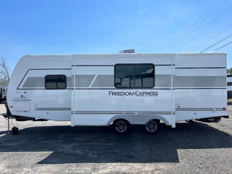 With any Freedom Express Ultra Lite travel trailer by Coachmen you will appreciate quality construction materials, such as vacuum bonded walls with Azdel composite, a 3/4 gel coated fiberglass cap with an automotive glass windshield, and a heated enclosed underbelly. Each model also features Tufflex PVC roofing, front rock guard, and E-Z Lube axles for smooth towing. Inside, you'll find kitchen backsplash, hidden hinge cabinetry, and wear-resistant vinyl flooring throughout. The power tongue jack included with the Ultra Lite Express Package will make set-up a breeze, and each model includes back-up camera prep and they are Freedom solar ready if you plan to go off-grid. Enjoy lightweight camping with a Freedom Express Ultra Lite travel trailer today!