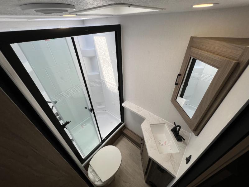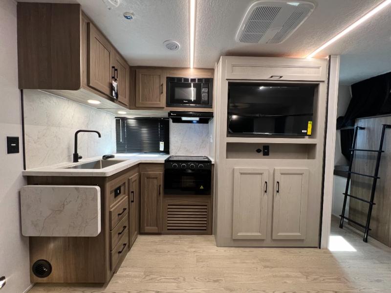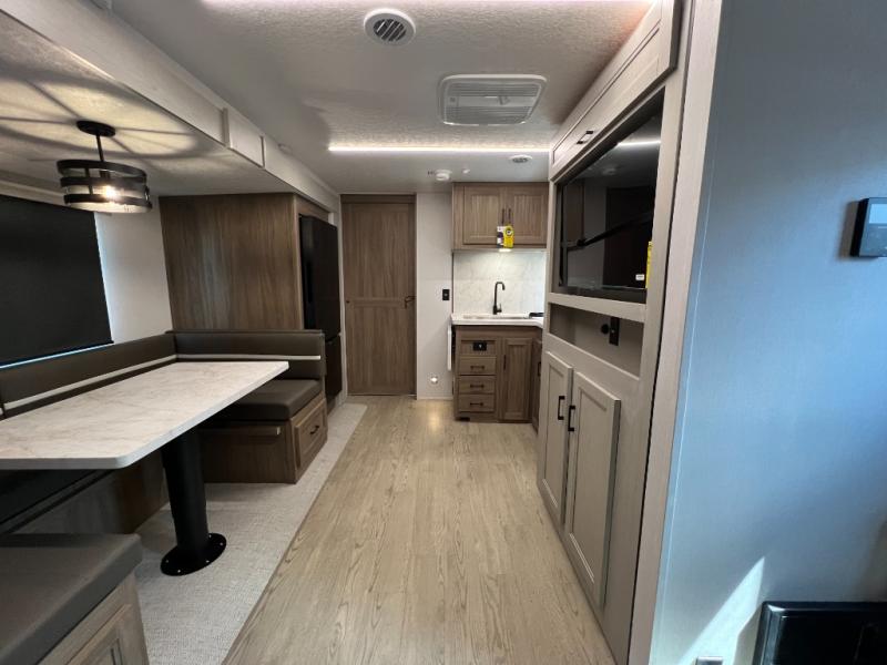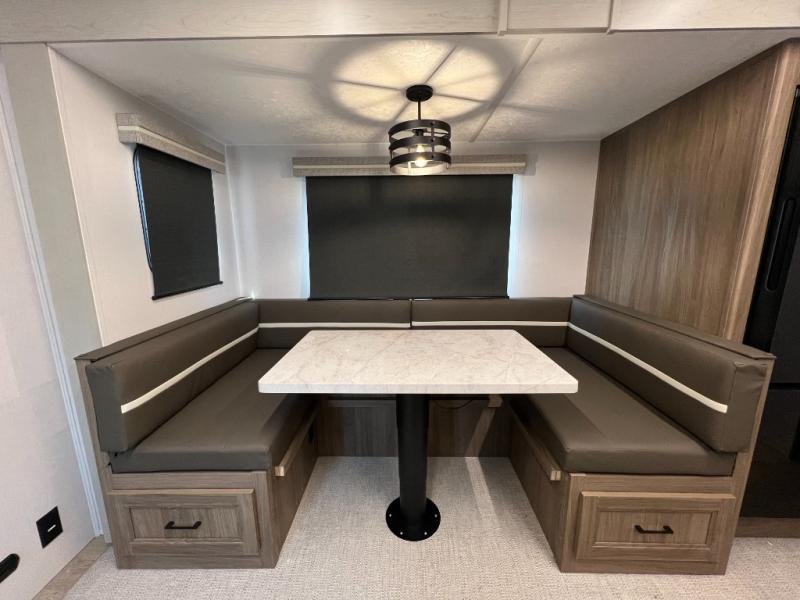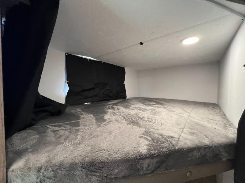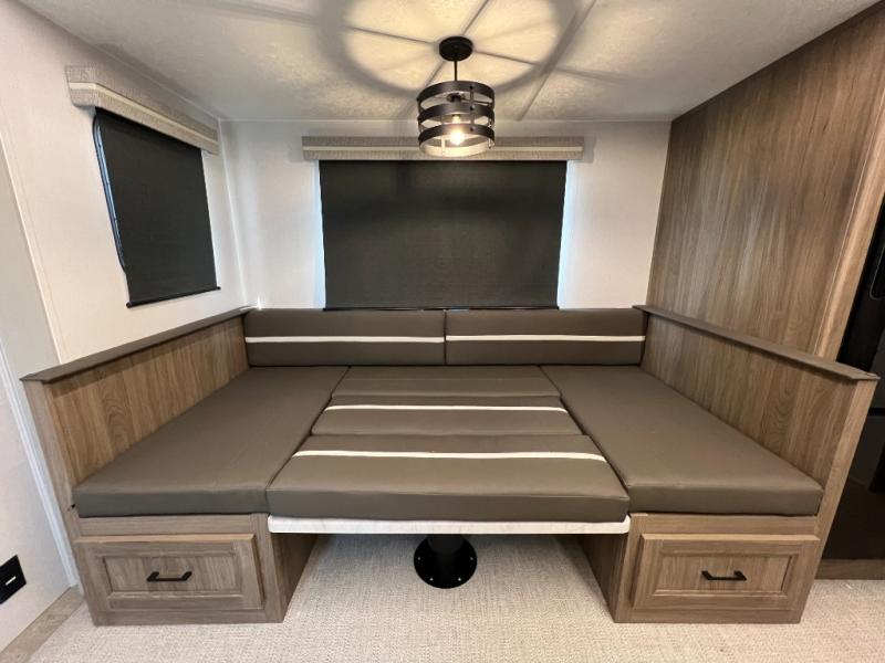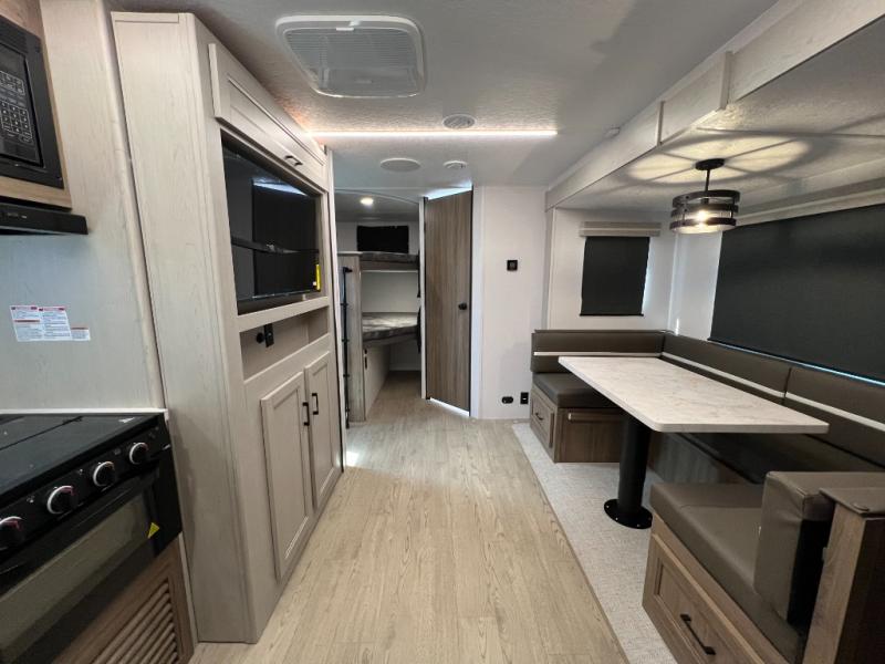 This is a great unit for a larger family to enjoy! With double-size bunks in the rear campside corner you can easily sleep seven or eight in this unit depending on size. A large slide offers ample space in the main living area and it features a u-dinette and refrigerator. Opposite the slide behind the Smart TV there is a huge hinged hidden storage pantry! You can easily cook both inside and out with all the appliances inside to create delicious home cooked meals, plus an outside camp kitchen and griddle so you can cook in the great outdoors on a beautiful day. A rear corner bath features a shower, toilet, and corner vanity with sink, plus medicine cabinet for your things. In front, a private master bedroom with queen bed including wardrobes and inset shelves along the side of the head of the bed, plus overhead storage as well.
