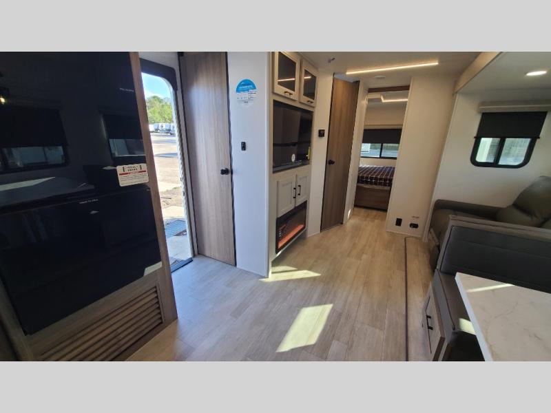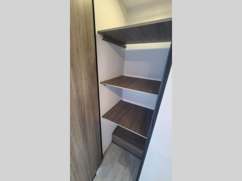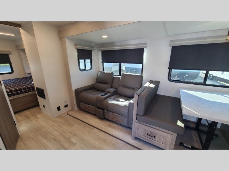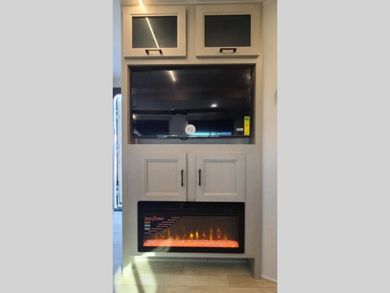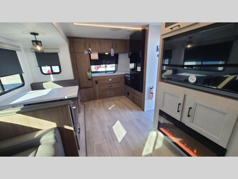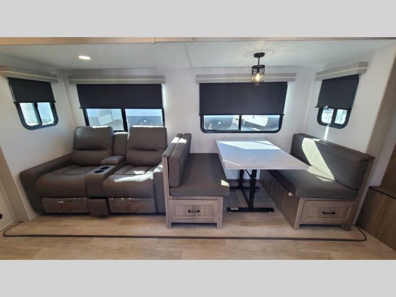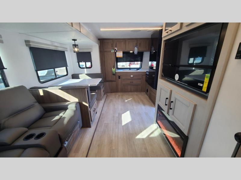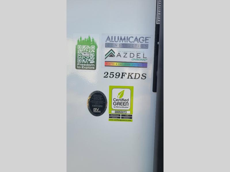 259FKDSYou will love the rear master bedroom with its king bed slide out, spacious wardrobe, and a private entrance into the dual entry bath. There is a sofa that sits directly across from the fireplace and entertainment center, or you can choose the optional theater seat or optional hide-a-bed sofa in place of the standard sofa. The front kitchen features tons of counter space, an 8 cu. ft. double door refrigerator, plus a large pantry for dry good and snacks. There is also a pantry/closet just as you enter the trailer that will be perfect for shoes and jackets!