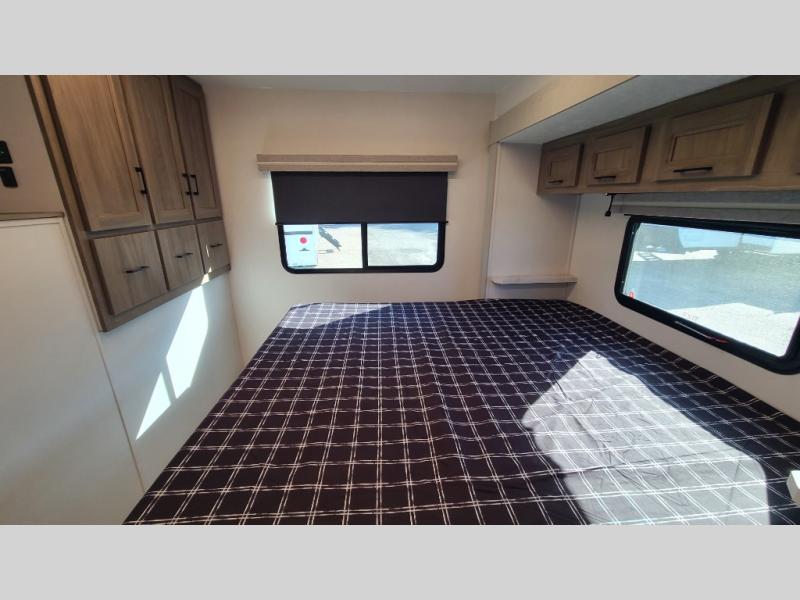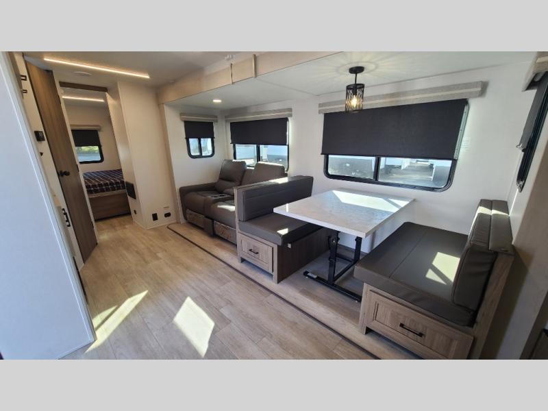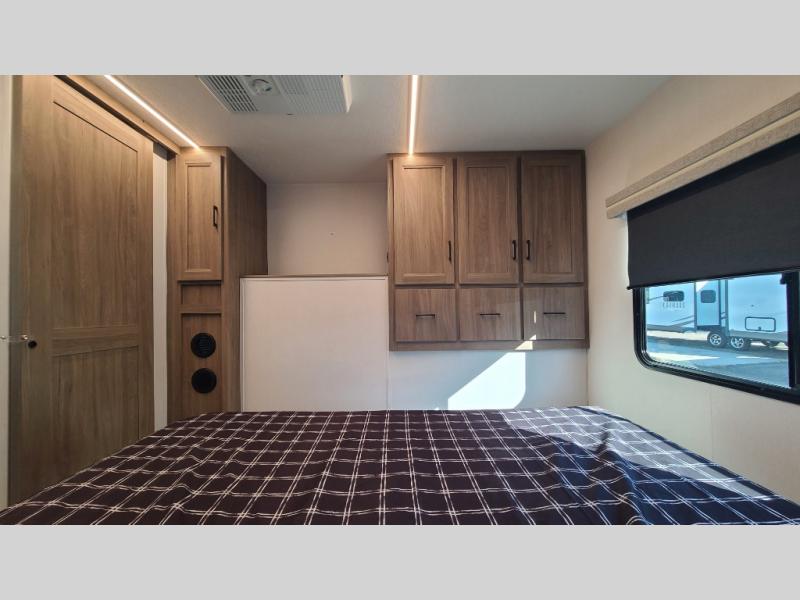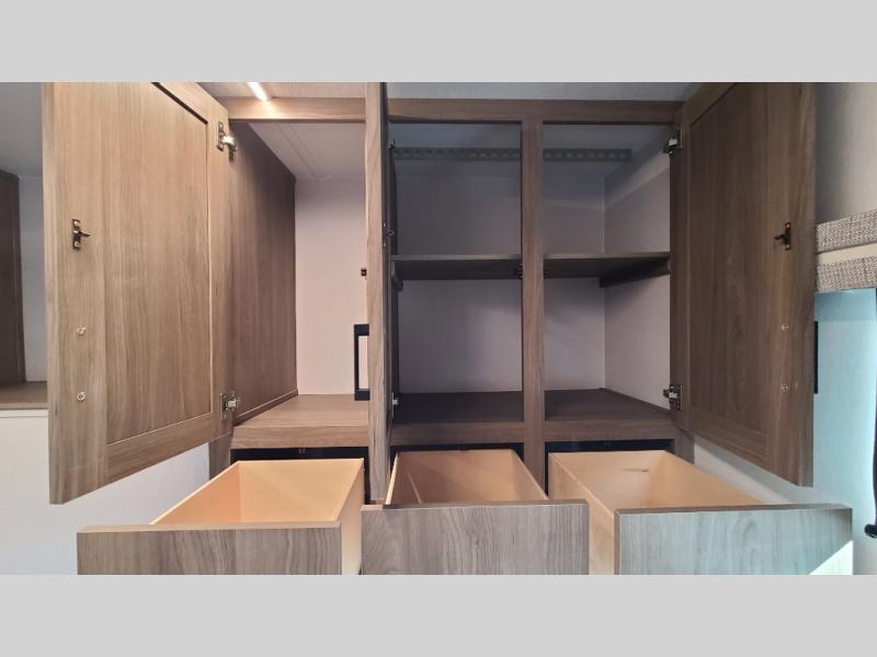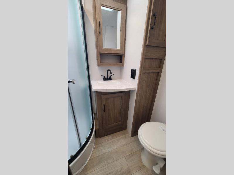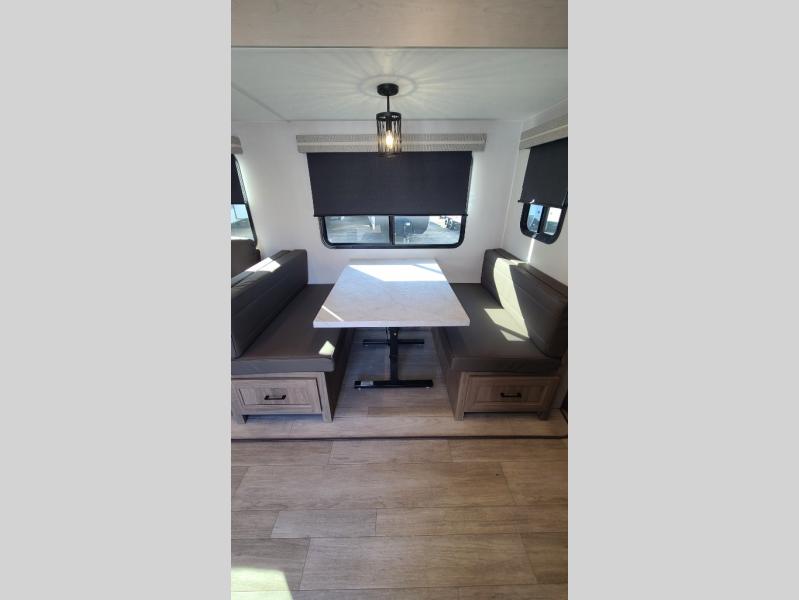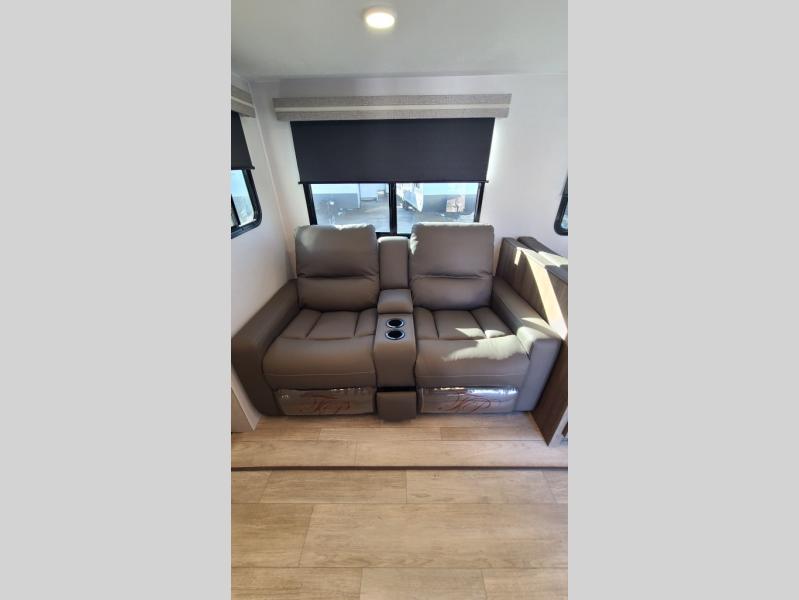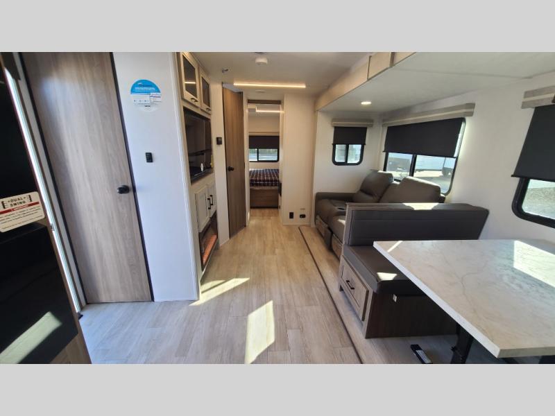 259FKDSYou will love the rear master bedroom with its king bed slide out, spacious wardrobe, and a private entrance into the dual entry bath. There is a sofa that sits directly across from the fireplace and entertainment center, or you can choose the optional theater seat or optional hide-a-bed sofa in place of the standard sofa. The front kitchen features tons of counter space, an 8 cu. ft. double door refrigerator, plus a large pantry for dry good and snacks. There is also a pantry/closet just as you enter the trailer that will be perfect for shoes and jackets!