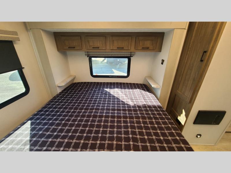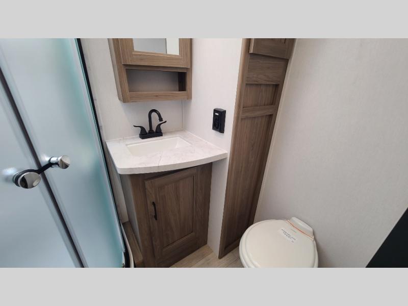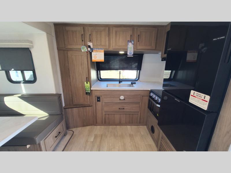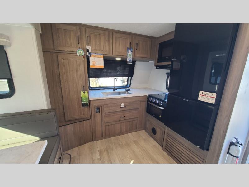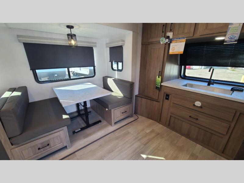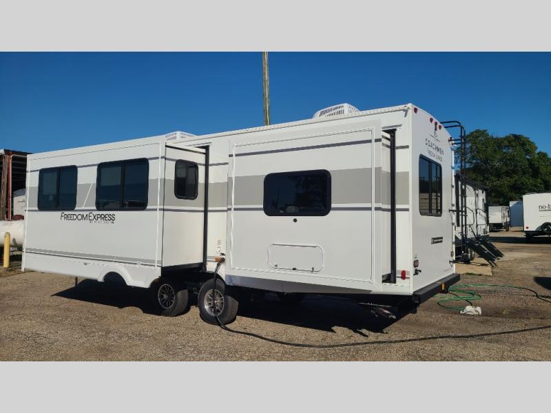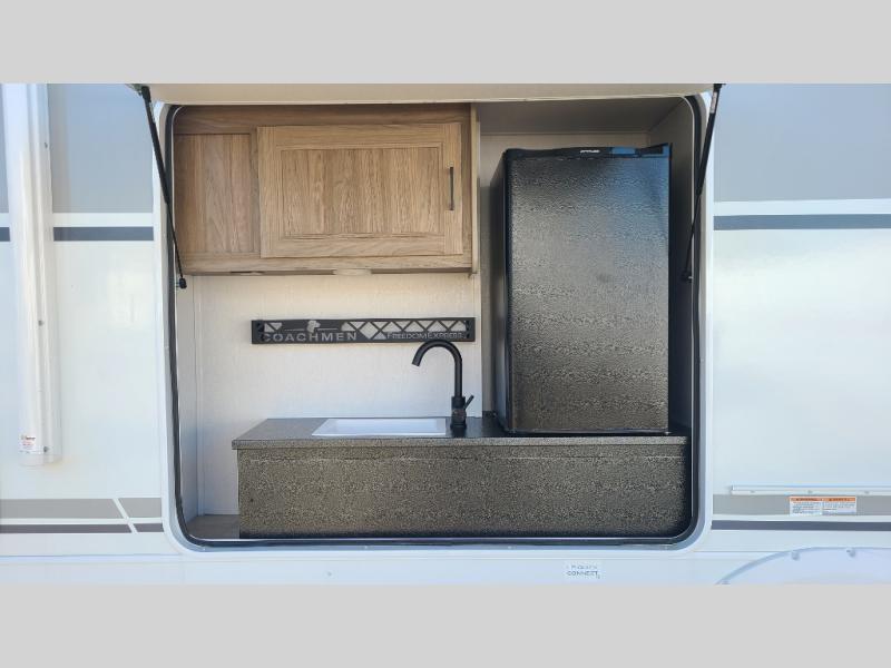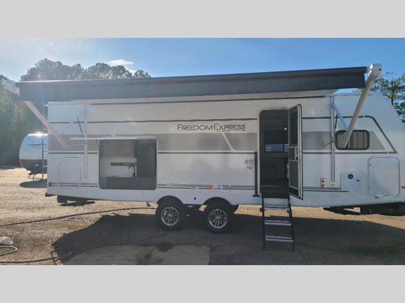 With any Freedom Express Ultra Lite travel trailer by Coachmen you will appreciate quality construction materials, such as vacuum bonded walls with Azdel composite, a 3/4 gel coated fiberglass cap with an automotive glass windshield, and a heated enclosed underbelly. Each model also features Tufflex PVC roofing, front rock guard, and E-Z Lube axles for smooth towing. Inside, you'll find kitchen backsplash, hidden hinge cabinetry, and wear-resistant vinyl flooring throughout. The power tongue jack included with the Ultra Lite Express Package will make set-up a breeze, and each model includes back-up camera prep and they are Freedom solar ready if you plan to go off-grid. Enjoy lightweight camping with a Freedom Express Ultra Lite travel trailer today!