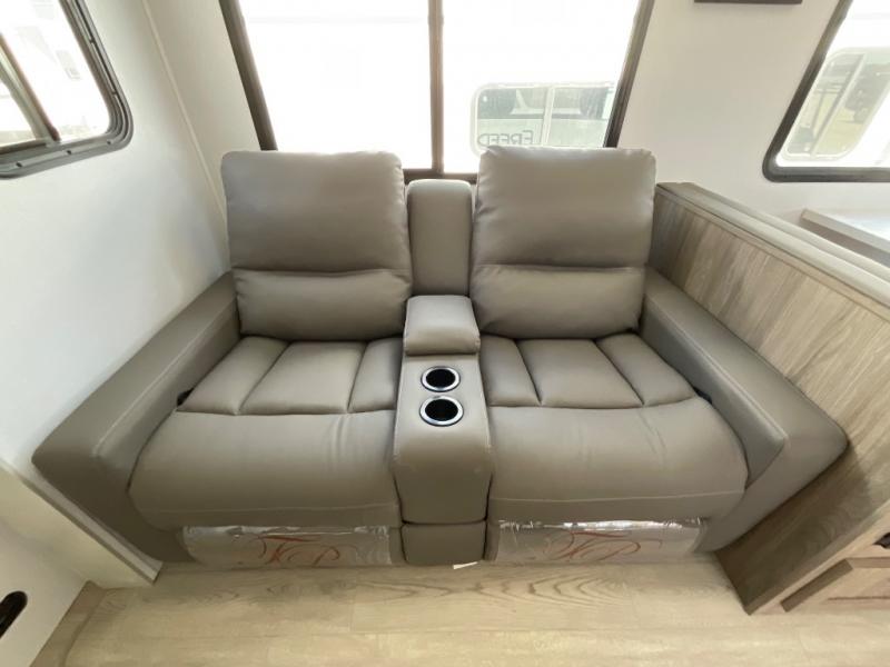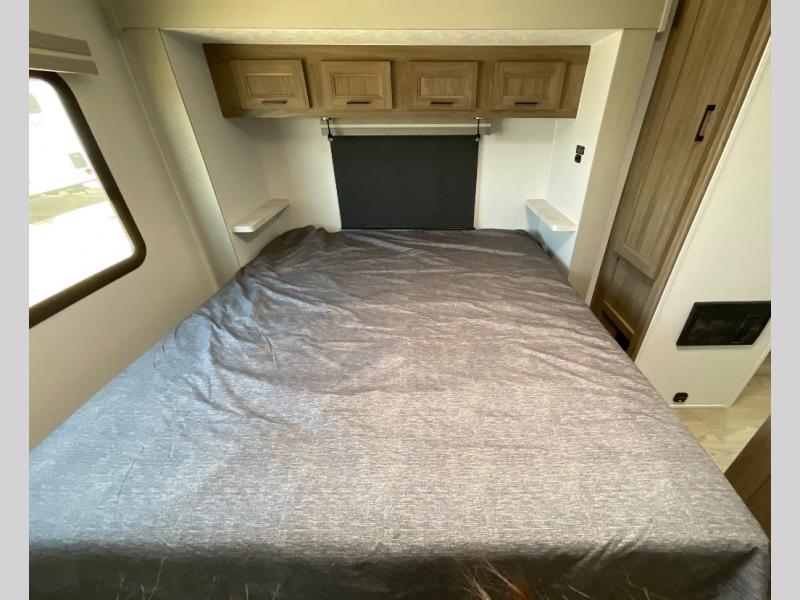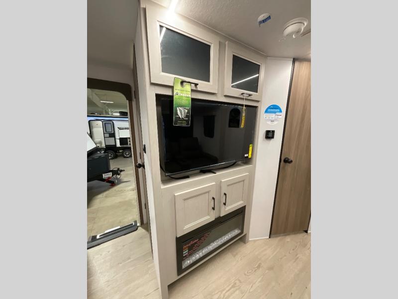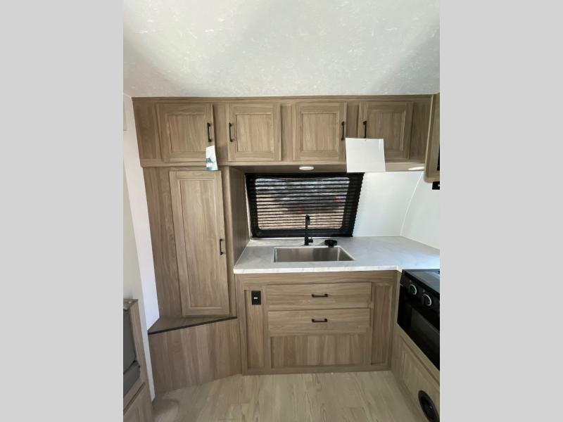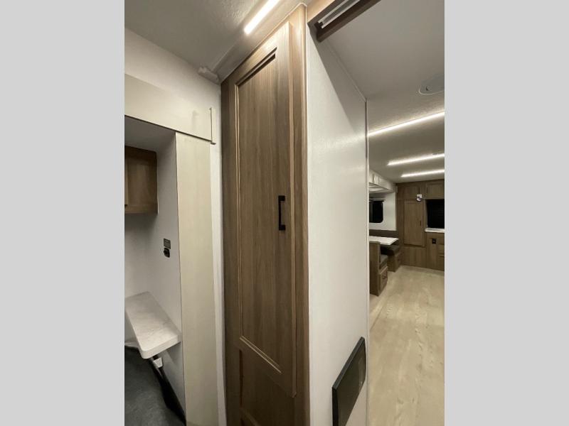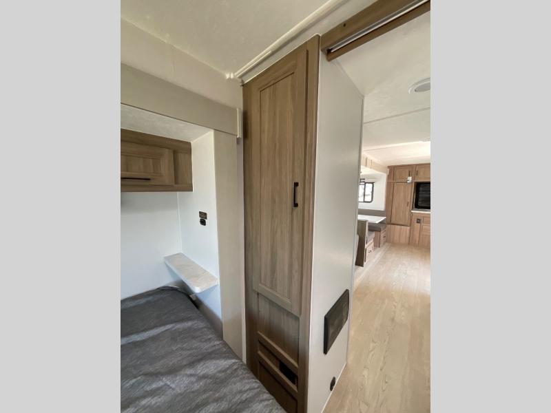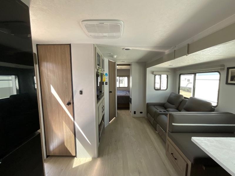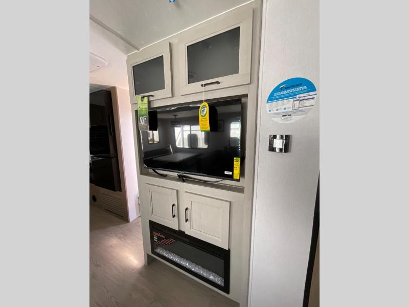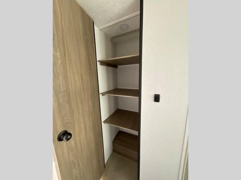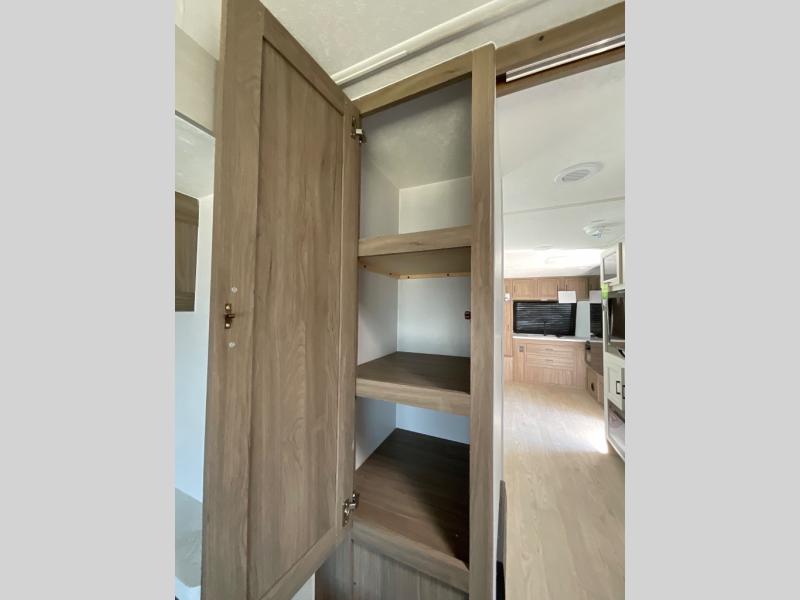 Comfort comes easy in this front kitchen travel trailer for four! You will love the rear master bedroom with its king bed slide out, spacious wardrobe, and a private entrance into the dual entry bath. There is a sofa that sits directly across from the fireplace and entertainment center, or you can choose the optional theater seat or optional hide-a-bed sofa in place of the standard sofa. The front kitchen features tons of counter space, an 8 cu. ft. double door refrigerator, plus a large pantry for dry good and snacks. There is also a pantry/closet just as you enter the trailer that will be perfect for shoes and jackets!