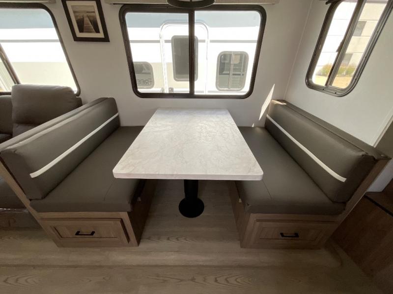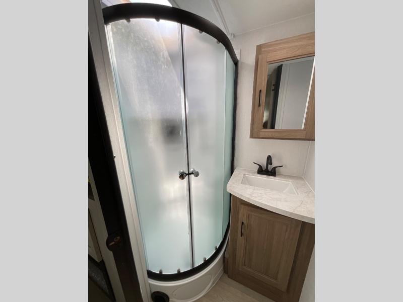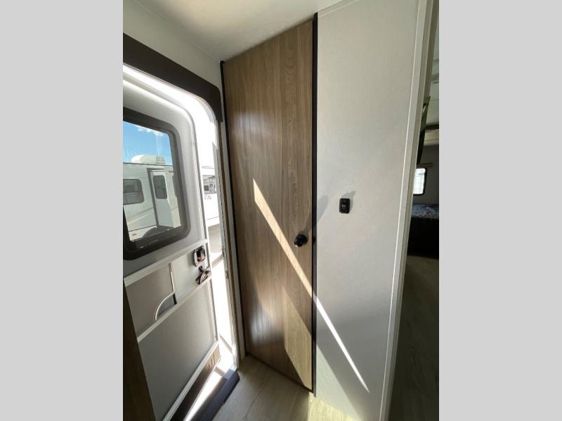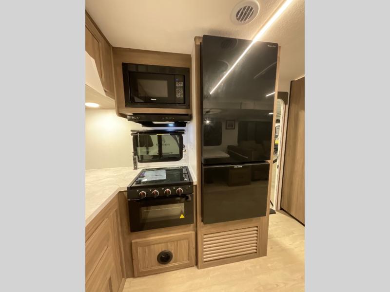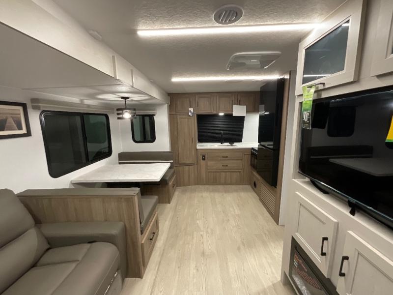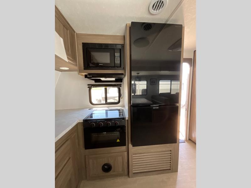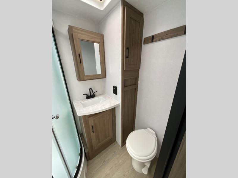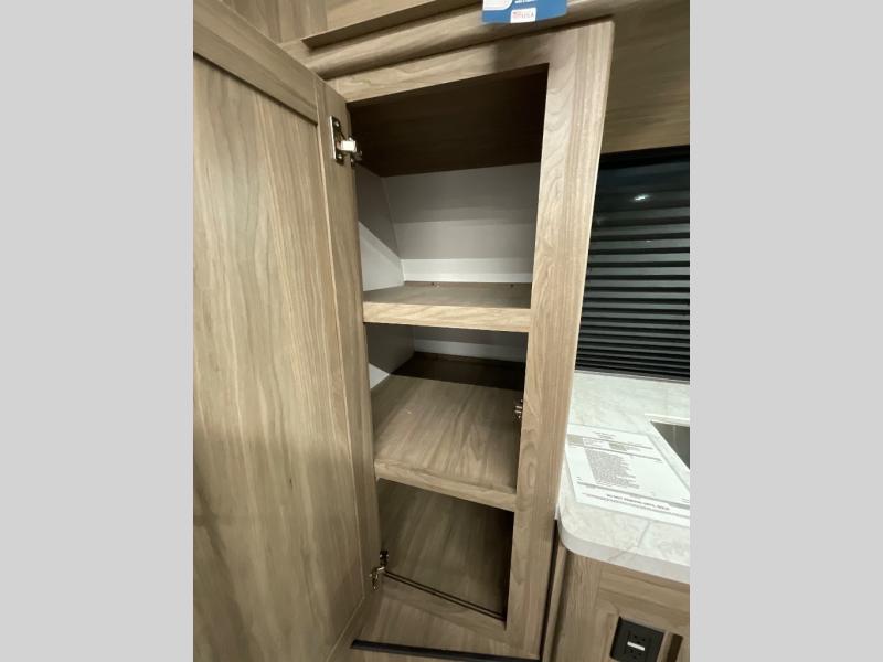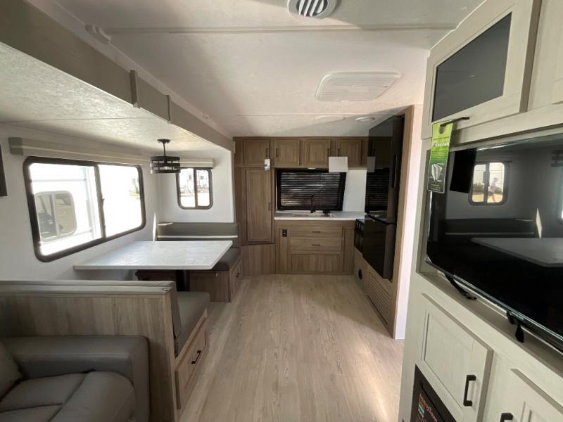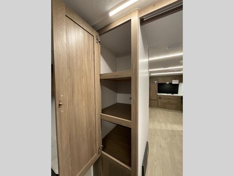 Comfort comes easy in this front kitchen travel trailer for four! You will love the rear master bedroom with its king bed slide out, spacious wardrobe, and a private entrance into the dual entry bath. There is a sofa that sits directly across from the fireplace and entertainment center, or you can choose the optional theater seat or optional hide-a-bed sofa in place of the standard sofa. The front kitchen features tons of counter space, an 8 cu. ft. double door refrigerator, plus a large pantry for dry good and snacks. There is also a pantry/closet just as you enter the trailer that will be perfect for shoes and jackets!