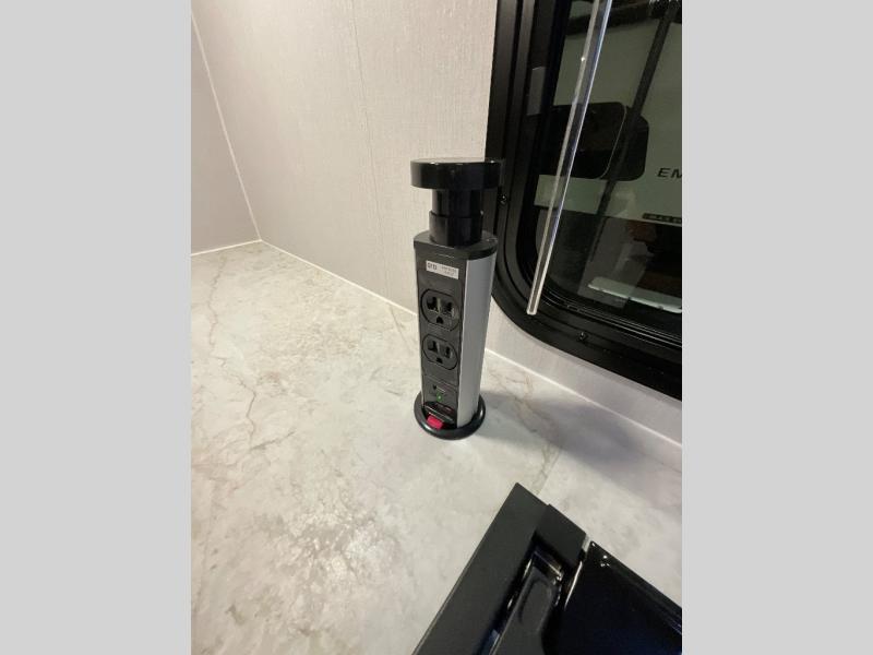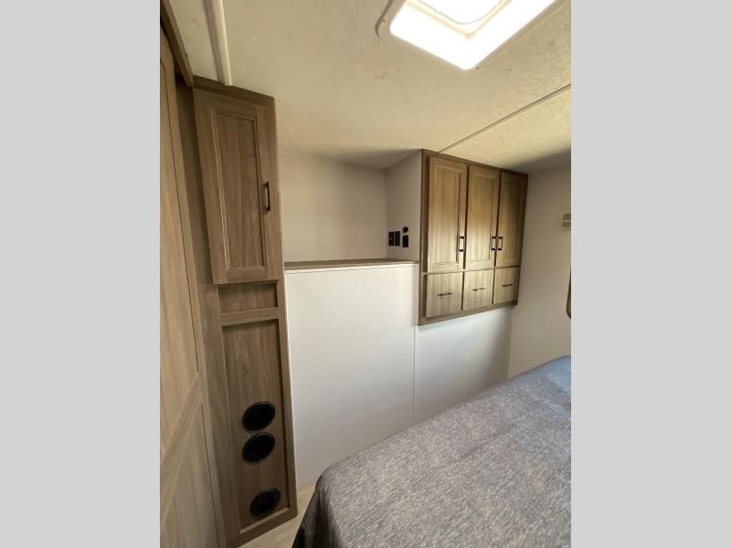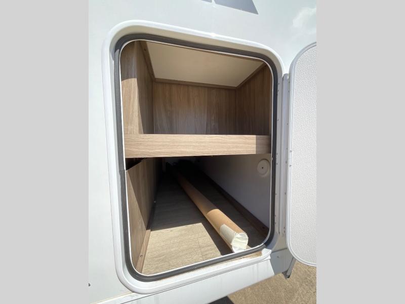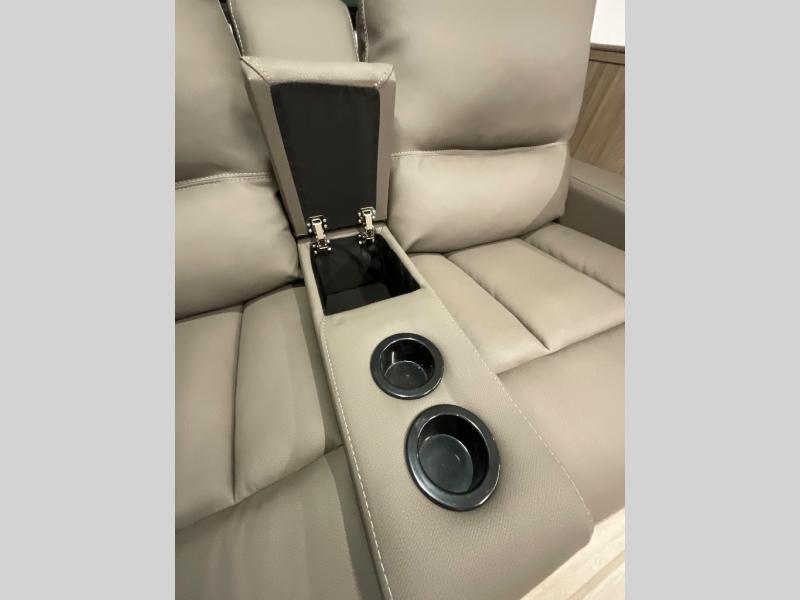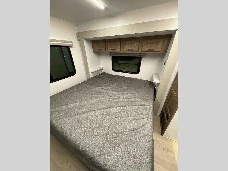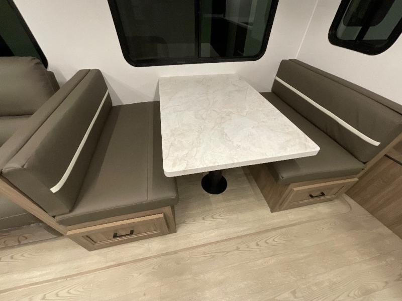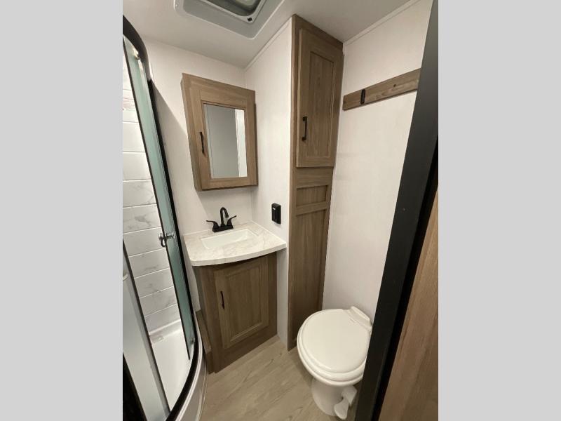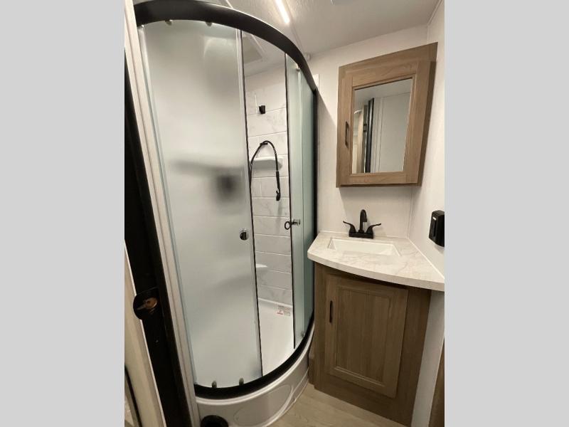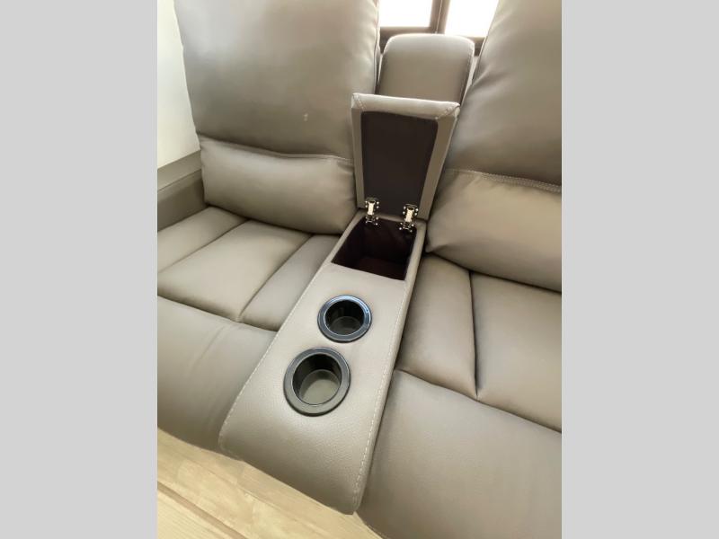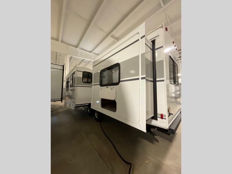 Comfort comes easy in this front kitchen travel trailer for four! You will love the rear master bedroom with its king bed slide out, spacious wardrobe, and a private entrance into the dual entry bath. There is a sofa that sits directly across from the fireplace and entertainment center, or you can choose the optional theater seat or optional hide-a-bed sofa in place of the standard sofa. The front kitchen features tons of counter space, an 8 cu. ft. double door refrigerator, plus a large pantry for dry good and snacks. There is also a pantry/closet just as you enter the trailer that will be perfect for shoes and jackets!