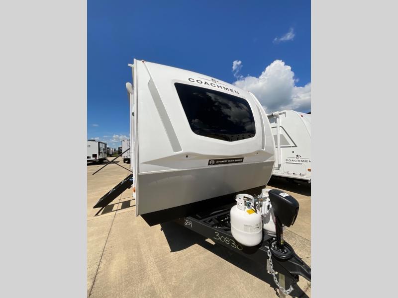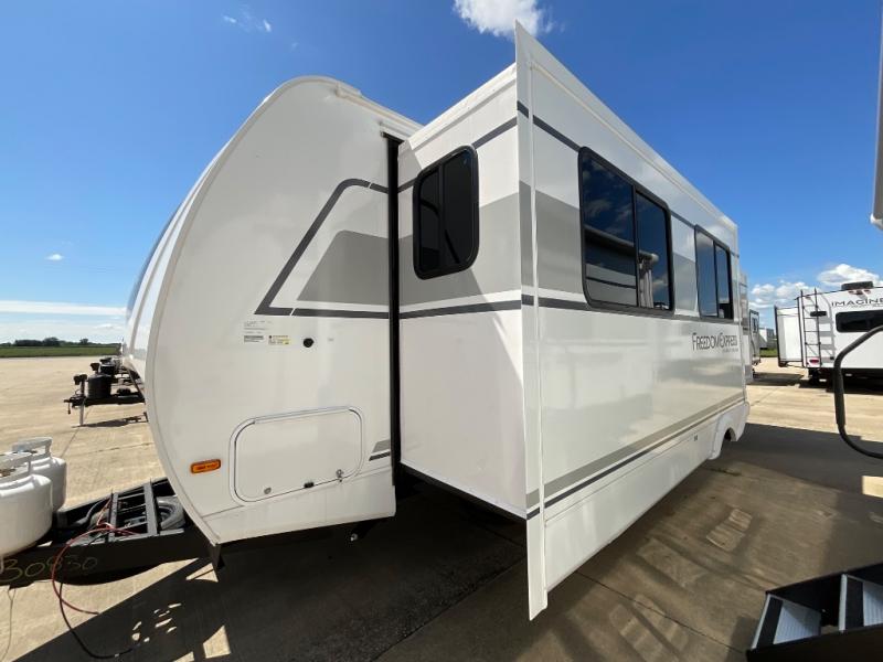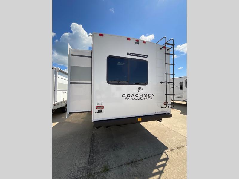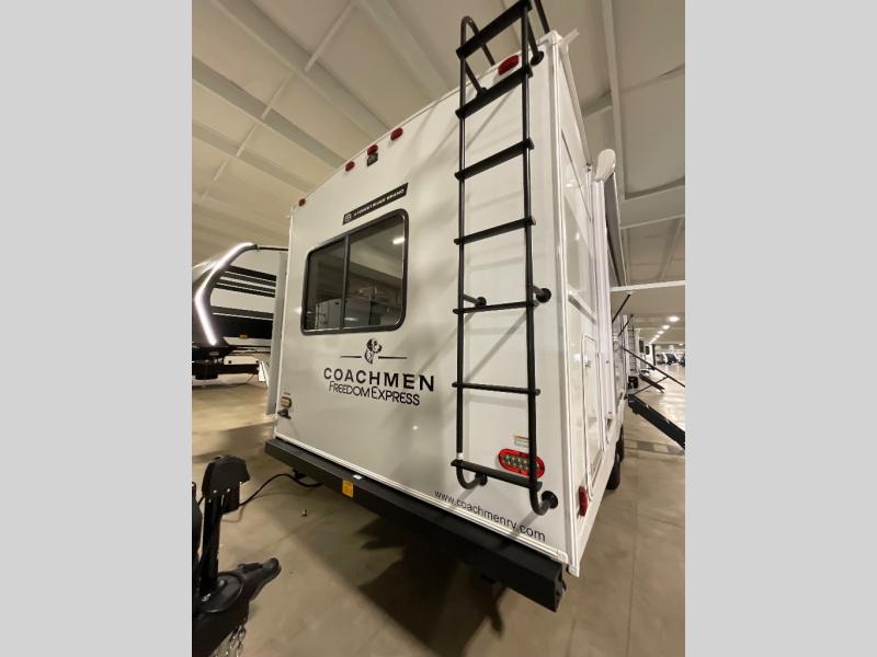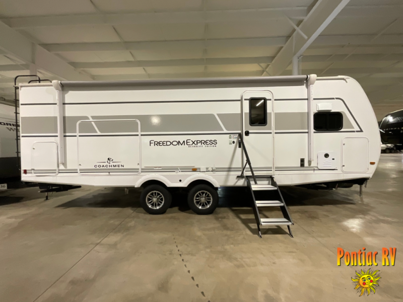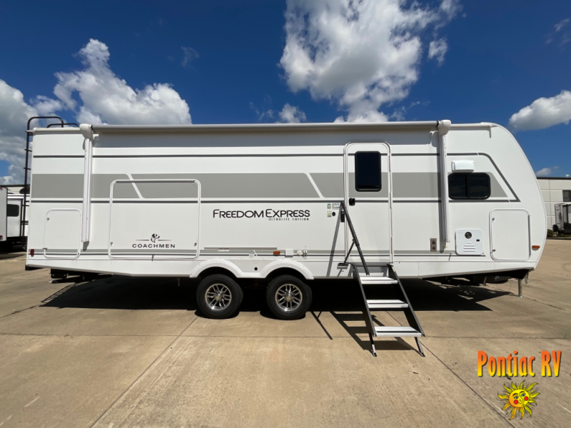 With any Freedom Express Ultra Lite travel trailer by Coachmen you will appreciate quality construction materials, such as vacuum bonded walls with Azdel composite, a 3/4 gel coated fiberglass cap with an automotive glass windshield, and a heated enclosed underbelly. Each model also features Tufflex PVC roofing, front rock guard, and E-Z Lube axles for smooth towing. Inside, you'll find kitchen backsplash, hidden hinge cabinetry, and wear-resistant vinyl flooring throughout. The power tongue jack included with the Ultra Lite Express Package will make set-up a breeze, and each model includes back-up camera prep and they are Freedom solar ready if you plan to go off-grid. Enjoy lightweight camping with a Freedom Express Ultra Lite travel trailer today!