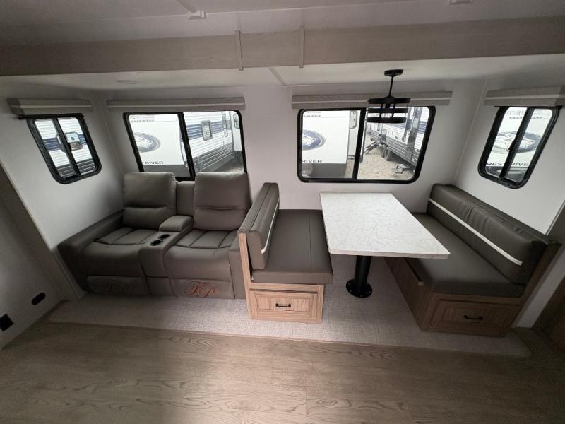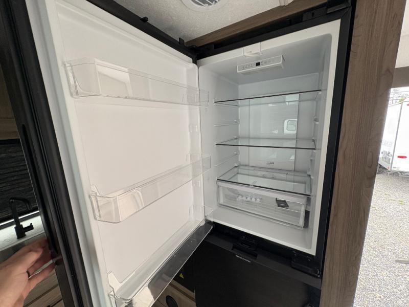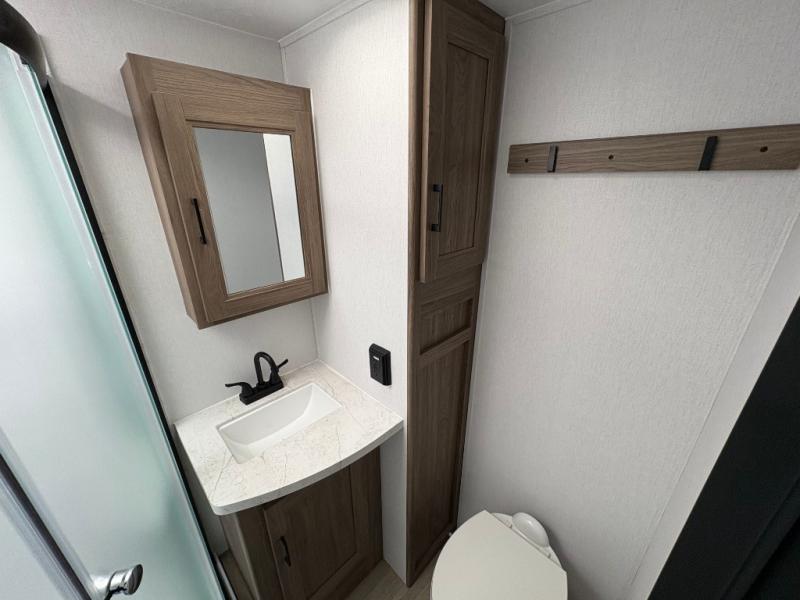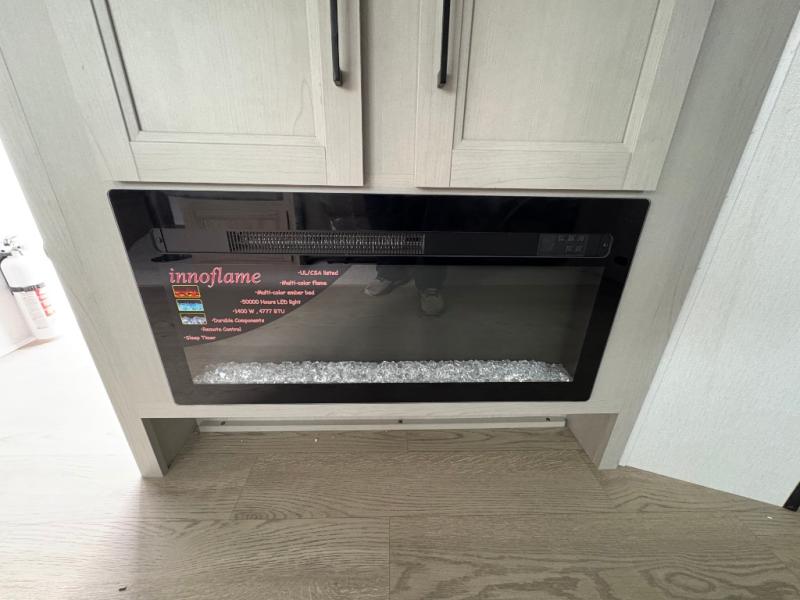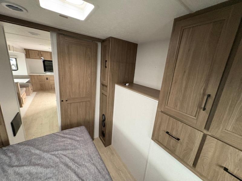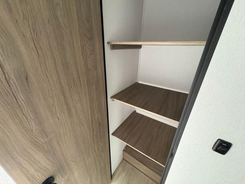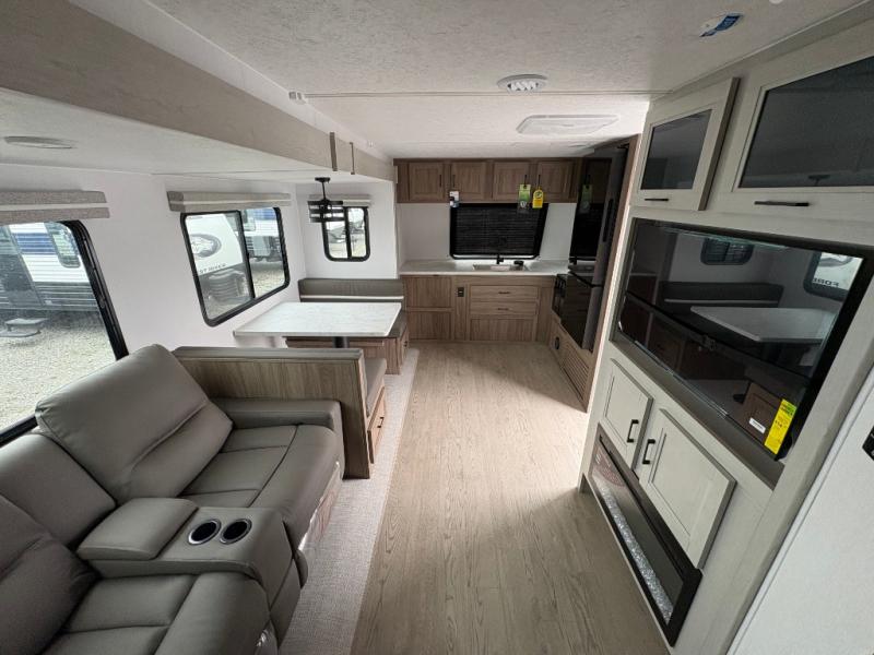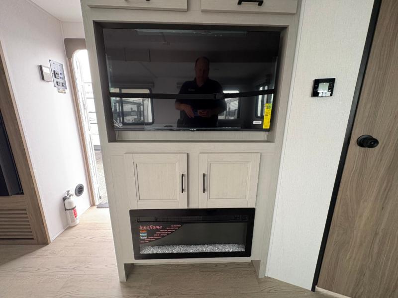 Comfort comes easy in this front kitchen travel trailer for four! You will love the rear master bedroom with its king bed slide out, spacious wardrobe, and a private entrance into the dual entry bath. There is a sofa that sits directly across from the fireplace and entertainment center, or you can choose the optional theater seat or optional hide-a-bed sofa in place of the standard sofa. The front kitchen features tons of counter space, an 8 cu. ft. double door refrigerator, plus a large pantry for dry good and snacks. There is also a pantry/closet just as you enter the trailer that will be perfect for shoes and jackets!