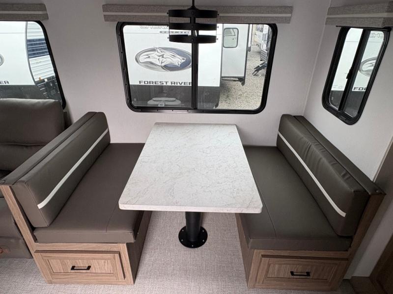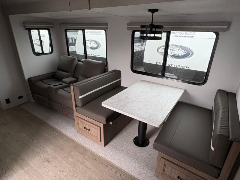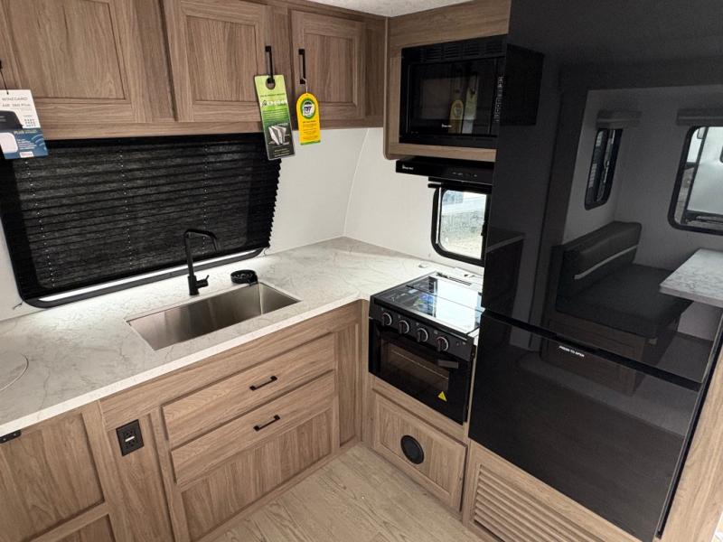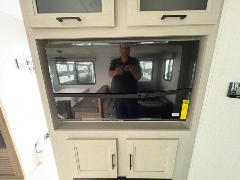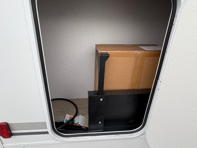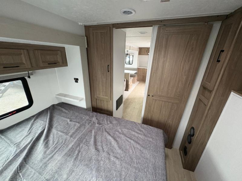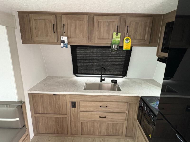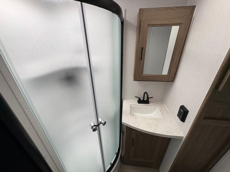 Comfort comes easy in this front kitchen travel trailer for four! You will love the rear master bedroom with its king bed slide out, spacious wardrobe, and a private entrance into the dual entry bath. There is a sofa that sits directly across from the fireplace and entertainment center, or you can choose the optional theater seat or optional hide-a-bed sofa in place of the standard sofa. The front kitchen features tons of counter space, an 8 cu. ft. double door refrigerator, plus a large pantry for dry good and snacks. There is also a pantry/closet just as you enter the trailer that will be perfect for shoes and jackets!