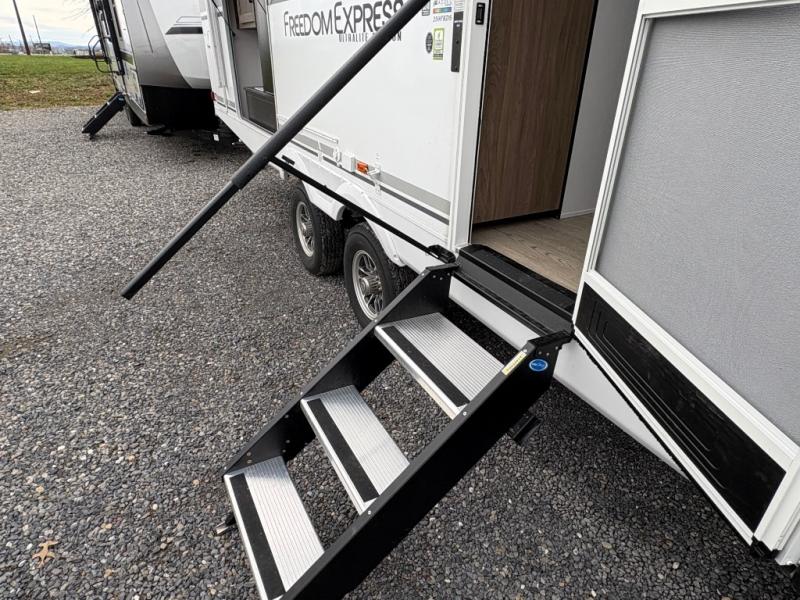 With any Freedom Express Ultra Lite travel trailer by Coachmen you will appreciate quality construction materials, such as vacuum bonded walls with Azdel composite, a 3/4 gel coated fiberglass cap with an automotive glass windshield, and a heated enclosed underbelly. Each model also features Tufflex PVC roofing, front rock guard, and E-Z Lube axles for smooth towing. Inside, you'll find kitchen backsplash, hidden hinge cabinetry, and wear-resistant vinyl flooring throughout. The power tongue jack included with the Ultra Lite Express Package will make set-up a breeze, and each model includes back-up camera prep and they are Freedom solar ready if you plan to go off-grid. Enjoy lightweight camping with a Freedom Express Ultra Lite travel trailer today!