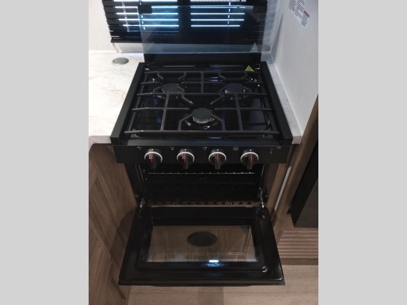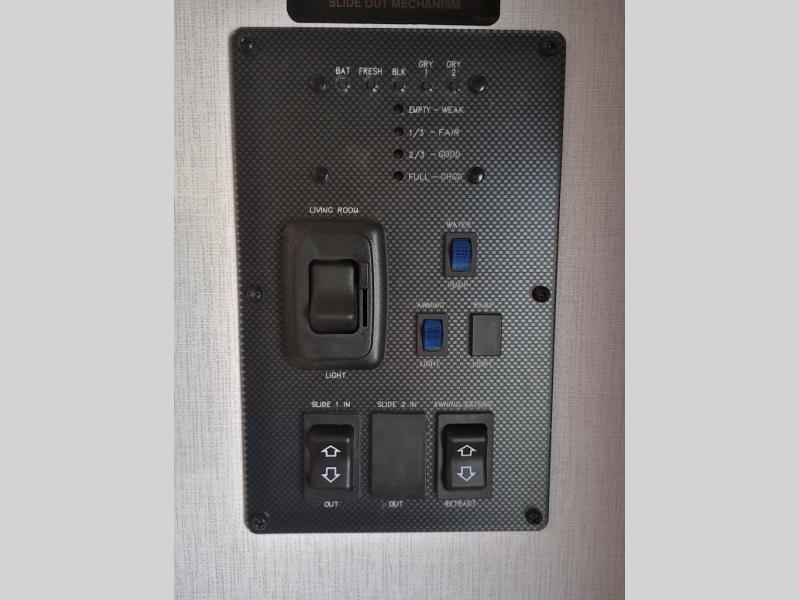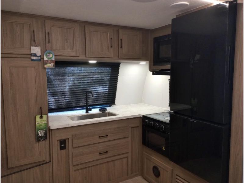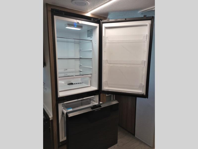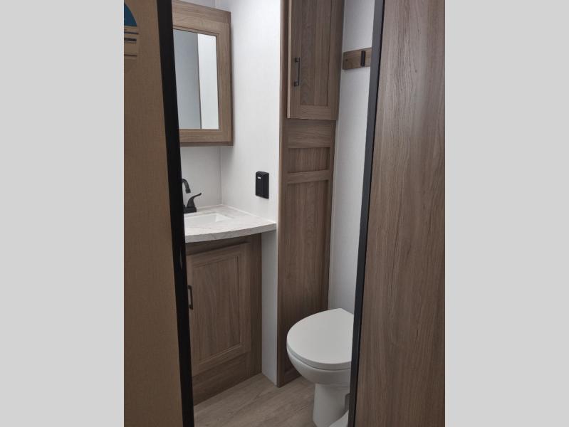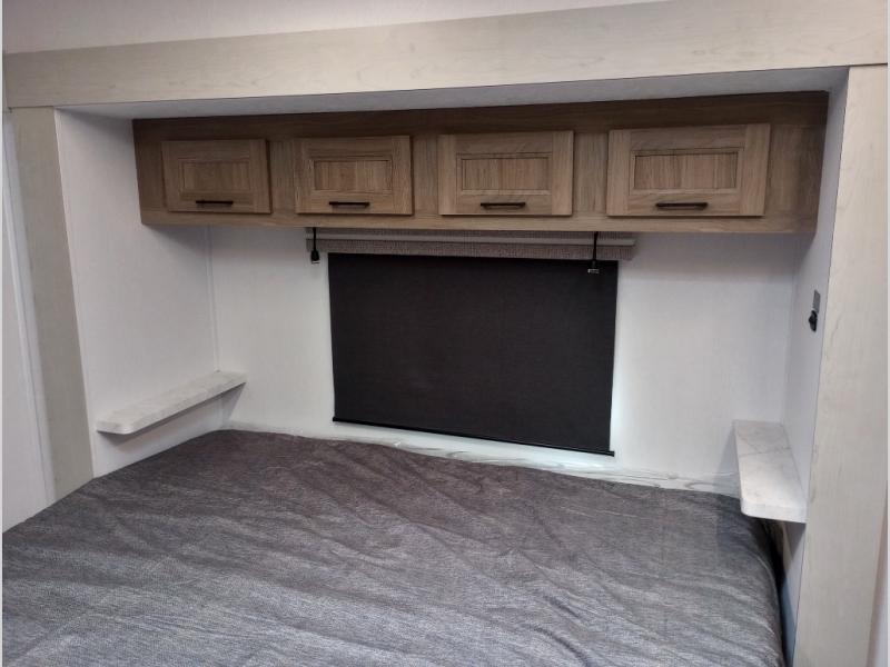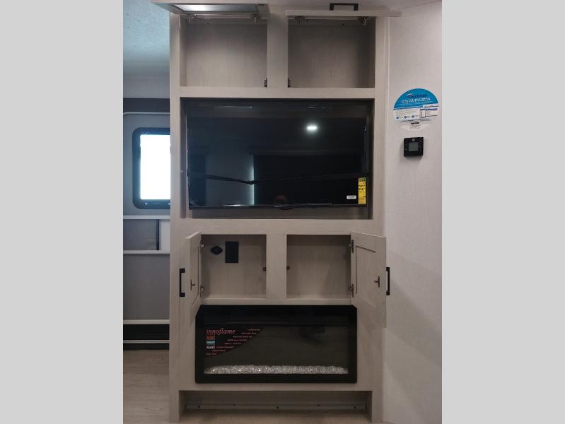 Comfort comes easy in this front kitchen travel trailer for four! You will love the rear master bedroom with its king bed slide out, spacious wardrobe, and a private entrance into the dual entry bath. There is a sofa that sits directly across from the fireplace and entertainment center, or you can choose the optional theater seat or optional hide-a-bed sofa in place of the standard sofa. The front kitchen features tons of counter space, an 8 cu. ft. double door refrigerator, plus a large pantry for dry good and snacks. There is also a pantry/closet just as you enter the trailer that will be perfect for shoes and jackets!