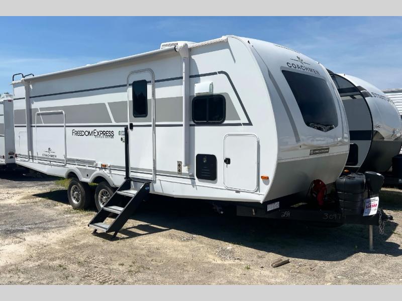 With any Freedom Express Ultra Lite travel trailer by Coachmen you will appreciate quality construction materials, such as vacuum bonded walls with Azdel composite, a 3/4 gel coated fiberglass cap with an automotive glass windshield, and a heated enclosed underbelly. Each model also features Tufflex PVC roofing, front rock guard, and E-Z Lube axles for smooth towing. Inside, you'll find kitchen backsplash, hidden hinge cabinetry, and wear-resistant vinyl flooring throughout. The power tongue jack included with the Ultra Lite Express Package will make set-up a breeze, and each model includes back-up camera prep and they are Freedom solar ready if you plan to go off-grid. Enjoy lightweight camping with a Freedom Express Ultra Lite travel trailer today!