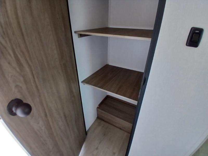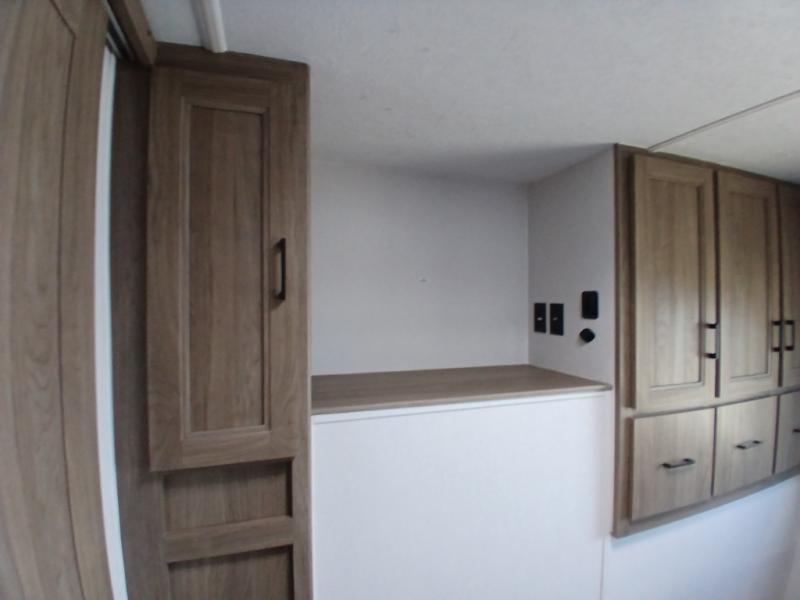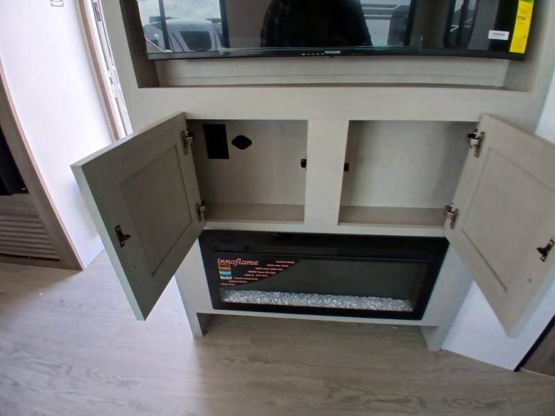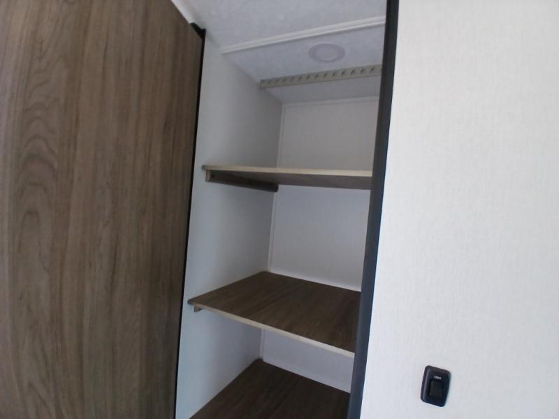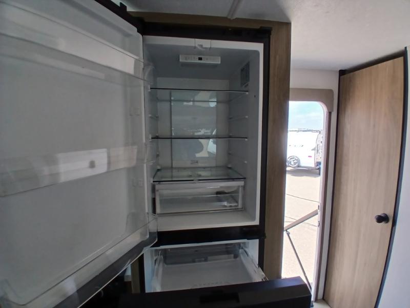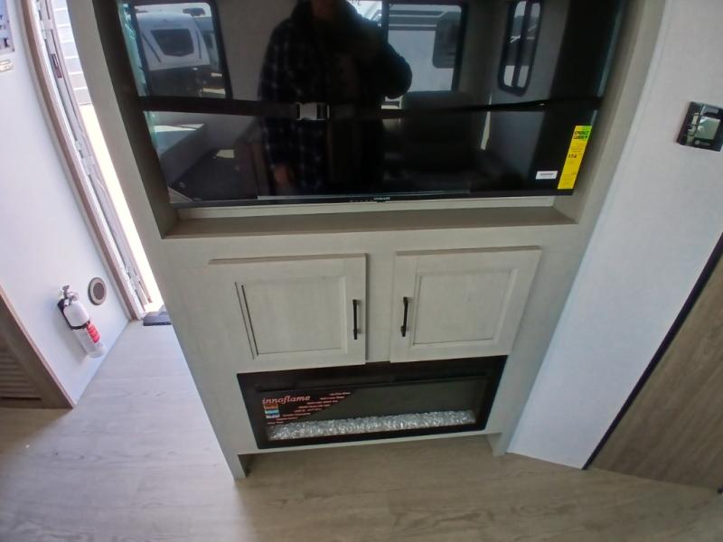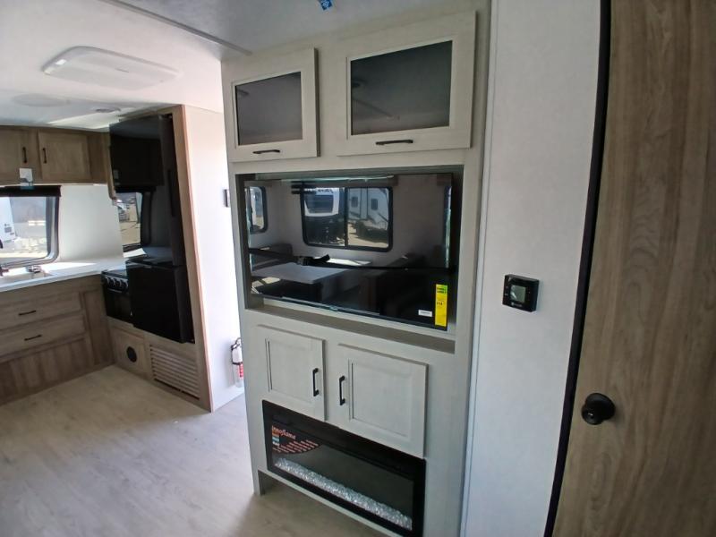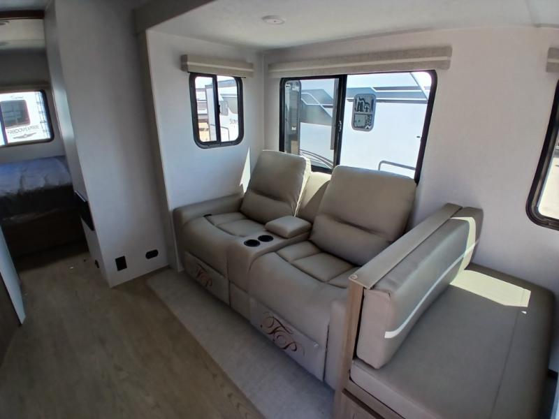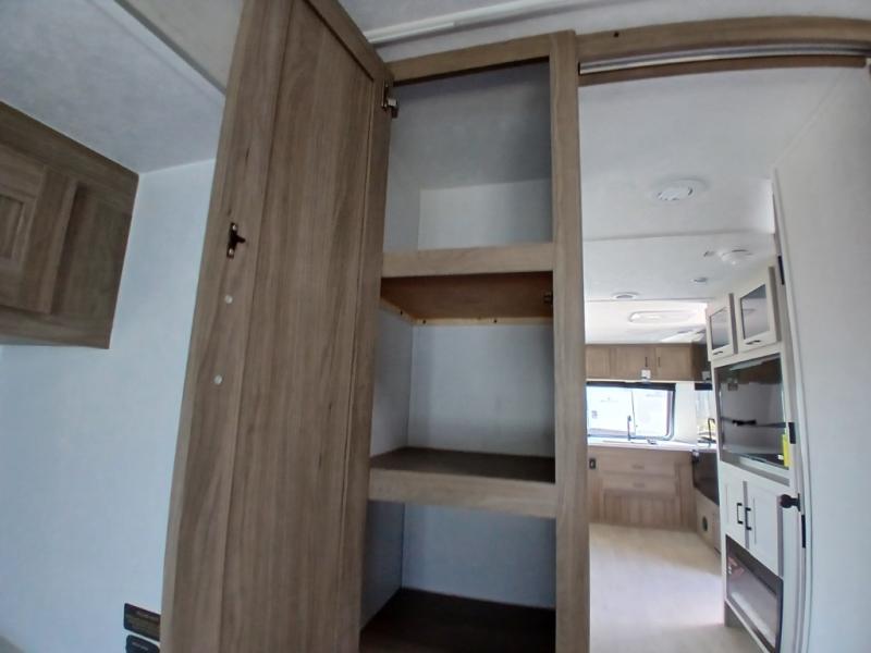 Comfort comes easy in this front kitchen travel trailer for four! You will love the rear master bedroom with its king bed slide out, spacious wardrobe, and a private entrance into the dual entry bath. There is a sofa that sits directly across from the fireplace and entertainment center, or you can choose the optional theater seat or optional hide-a-bed sofa in place of the standard sofa. The front kitchen features tons of counter space, an 8 cu. ft. double door refrigerator, plus a large pantry for dry good and snacks. There is also a pantry/closet just as you enter the trailer that will be perfect for shoes and jackets!