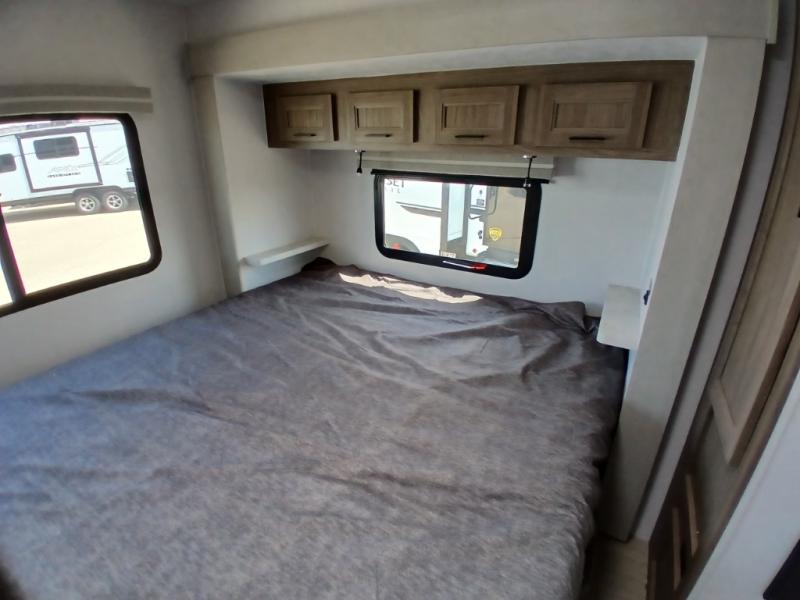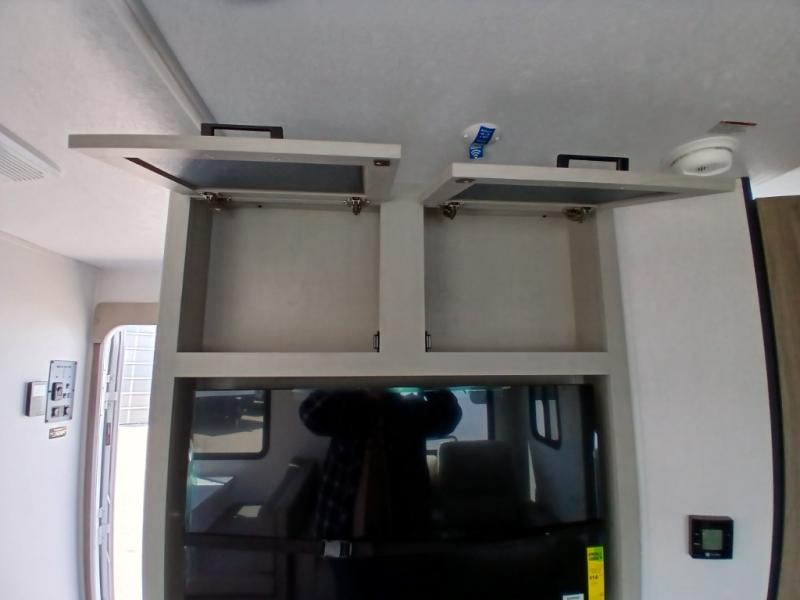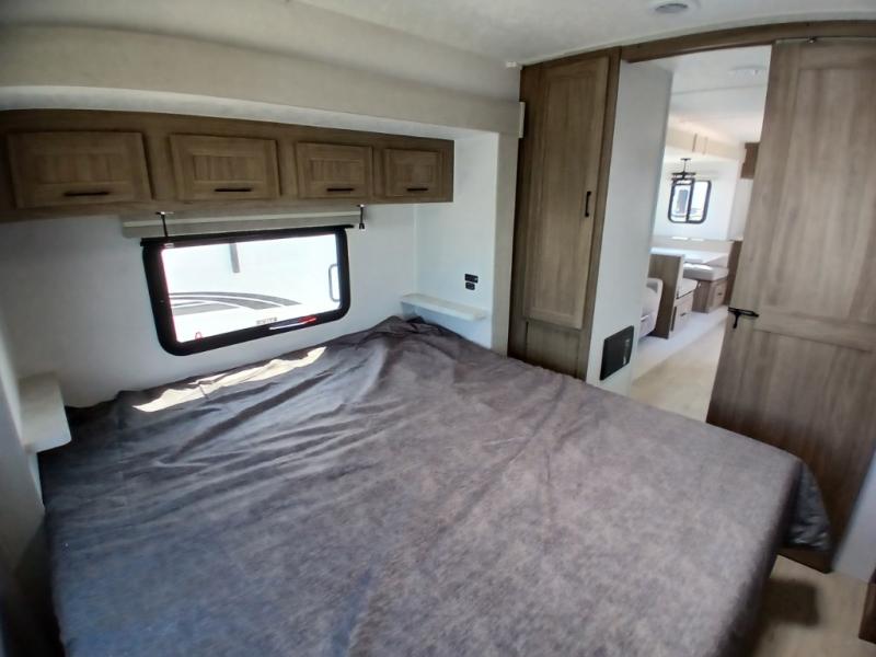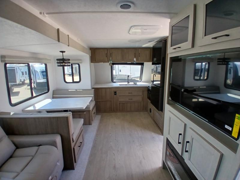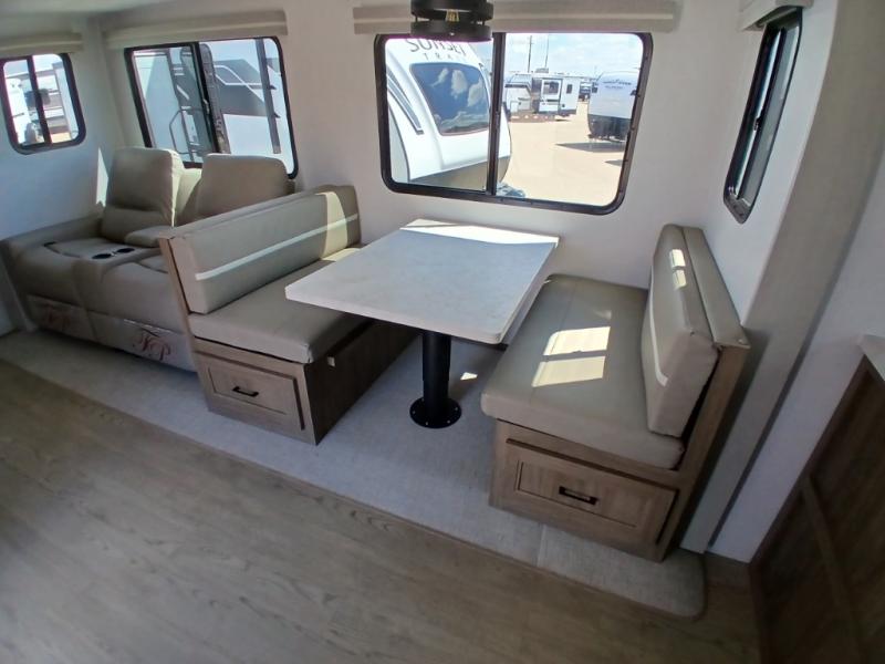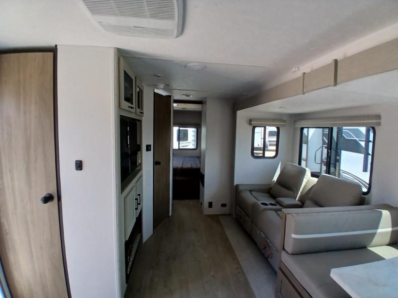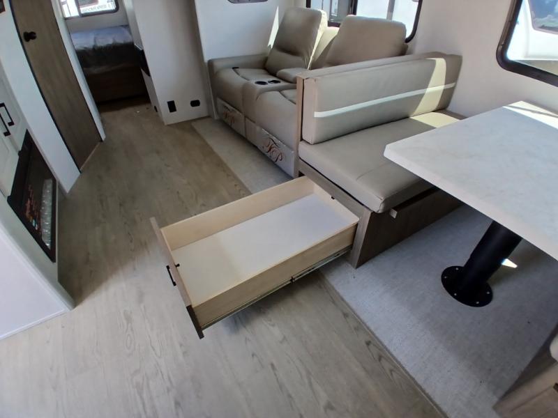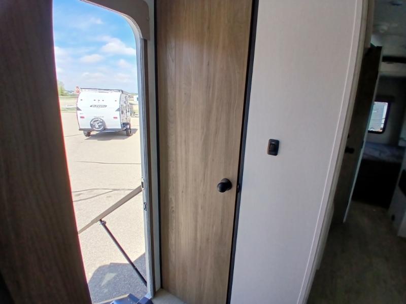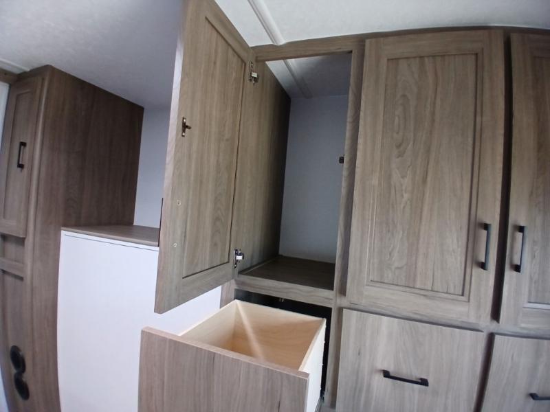 Comfort comes easy in this front kitchen travel trailer for four! You will love the rear master bedroom with its king bed slide out, spacious wardrobe, and a private entrance into the dual entry bath. There is a sofa that sits directly across from the fireplace and entertainment center, or you can choose the optional theater seat or optional hide-a-bed sofa in place of the standard sofa. The front kitchen features tons of counter space, an 8 cu. ft. double door refrigerator, plus a large pantry for dry good and snacks. There is also a pantry/closet just as you enter the trailer that will be perfect for shoes and jackets!