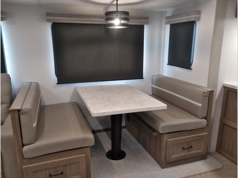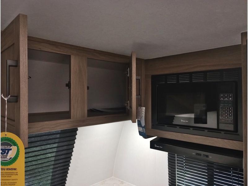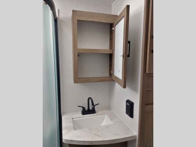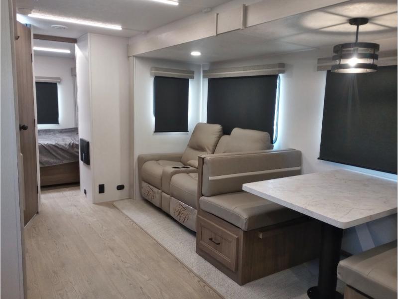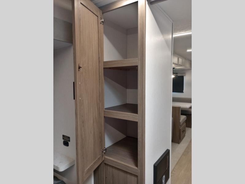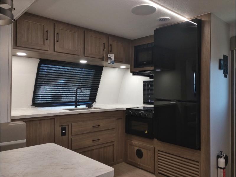 Comfort comes easy in this front kitchen travel trailer for four! You will love the rear master bedroom with its king bed slide out, spacious wardrobe, and a private entrance into the dual entry bath. There is a sofa that sits directly across from the fireplace and entertainment center, or you can choose the optional theater seat or optional hide-a-bed sofa in place of the standard sofa. The front kitchen features tons of counter space, an 8 cu. ft. double door refrigerator, plus a large pantry for dry good and snacks. There is also a pantry/closet just as you enter the trailer that will be perfect for shoes and jackets!