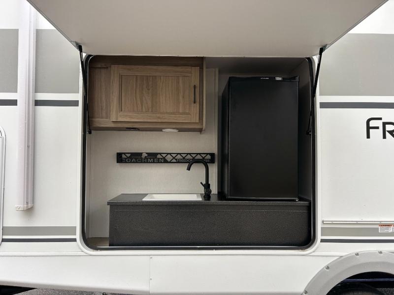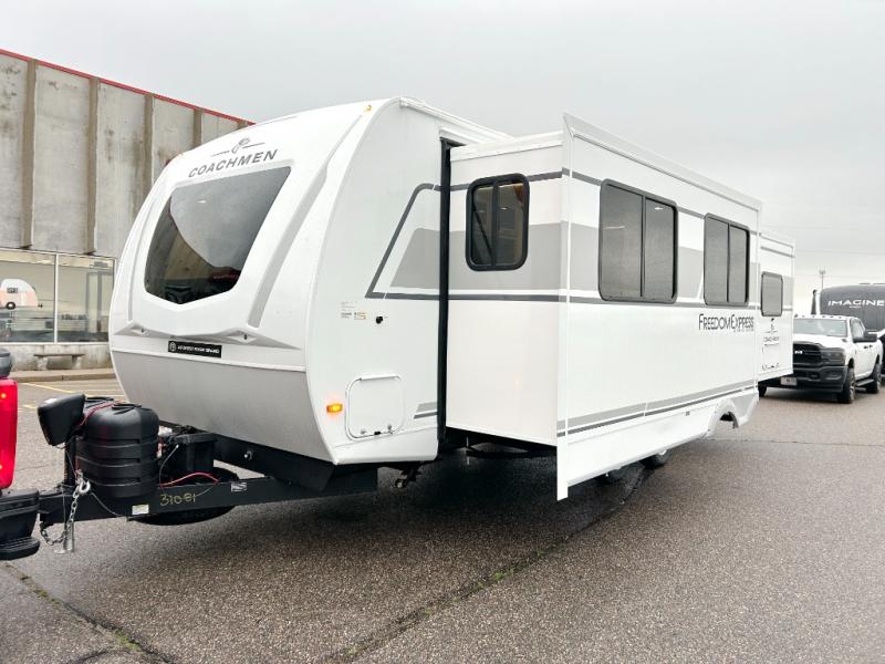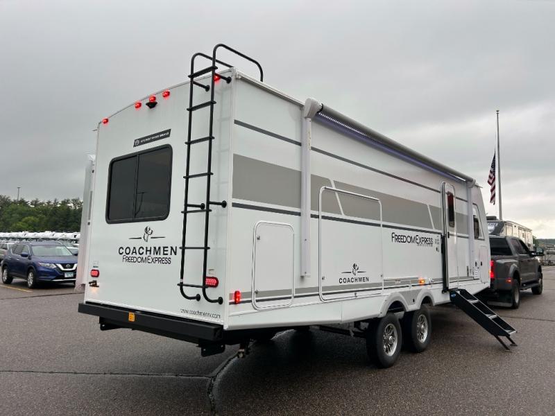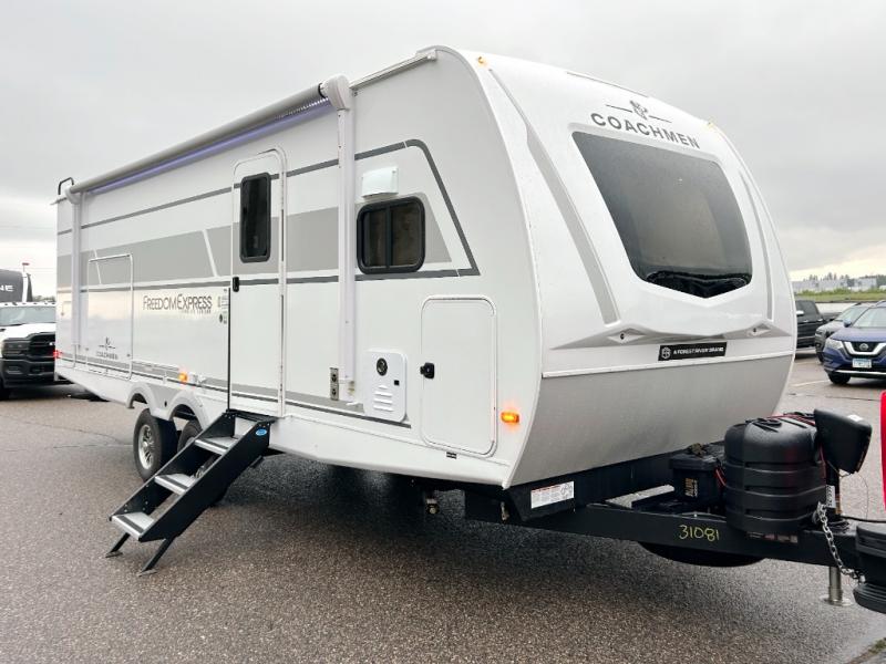 With any Freedom Express Ultra Lite travel trailer by Coachmen you will appreciate quality construction materials, such as vacuum bonded walls with Azdel composite, a 3/4 gel coated fiberglass cap with an automotive glass windshield, and a heated enclosed underbelly. Each model also features Tufflex PVC roofing, front rock guard, and E-Z Lube axles for smooth towing. Inside, you'll find kitchen backsplash, hidden hinge cabinetry, and wear-resistant vinyl flooring throughout. The power tongue jack included with the Ultra Lite Express Package will make set-up a breeze, and each model includes back-up camera prep and they are Freedom solar ready if you plan to go off-grid. Enjoy lightweight camping with a Freedom Express Ultra Lite travel trailer today!